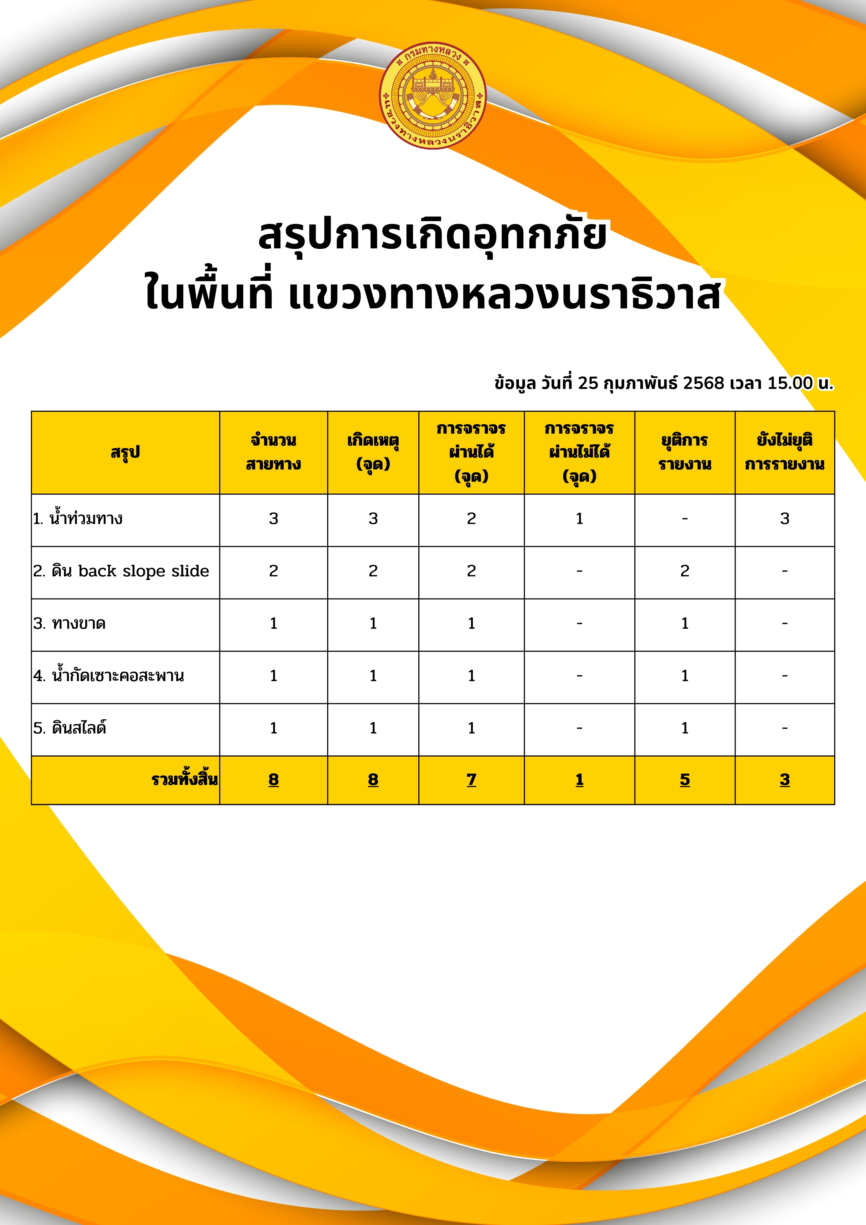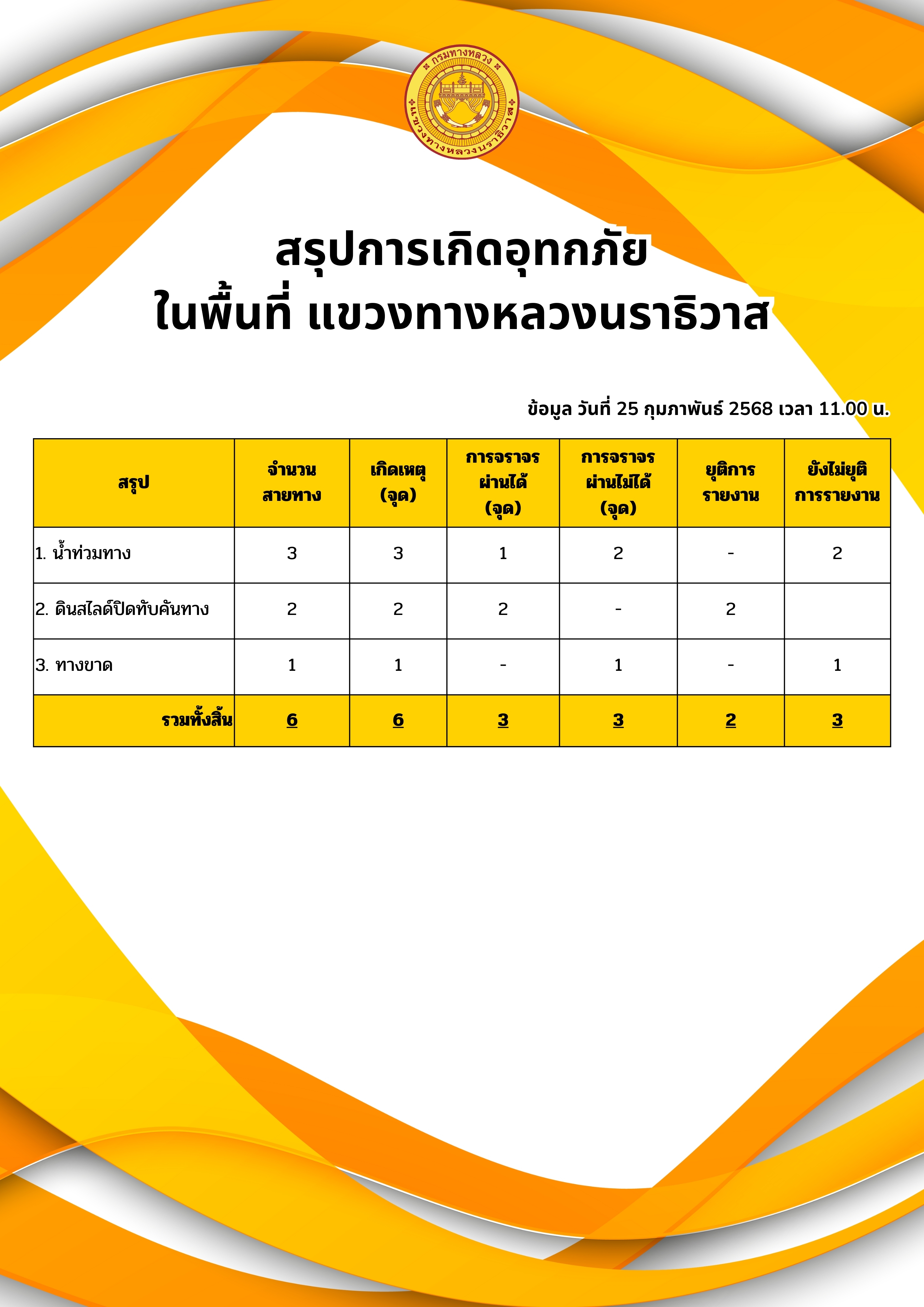 รายงานสถานการณ์อุทกภัยในพื้นที่จังหวัดนราธิวาส วันเวลาที่ update วันที่ 25 ก.พ. 68 เวลา 11.00 น. และ 15.00 น.