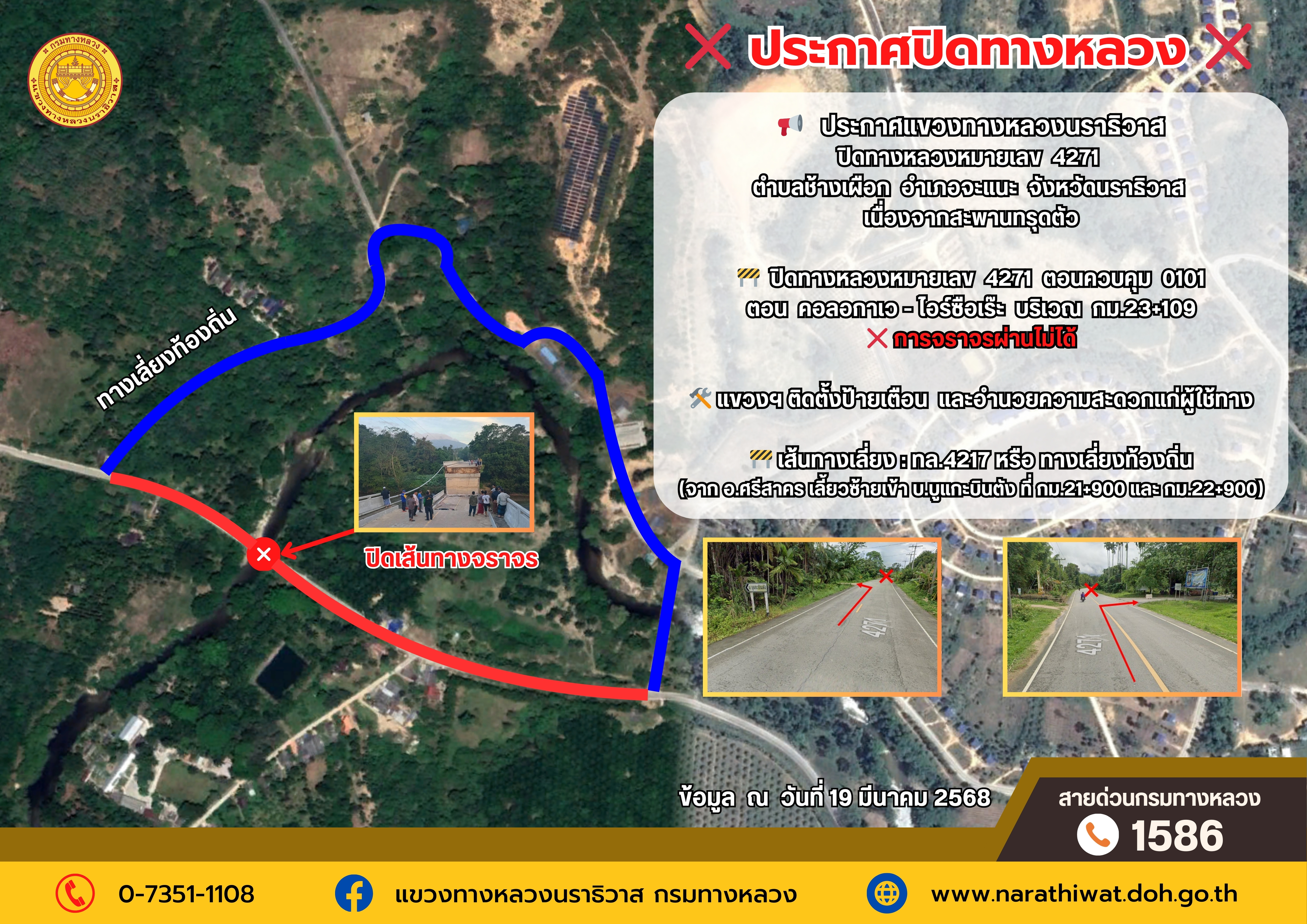 ประกาศแขวงทางหลวงนราธิวาส ปิดทางหลวงหมายเลข 4271 เนื่องจากสะพานทรุดตัว
