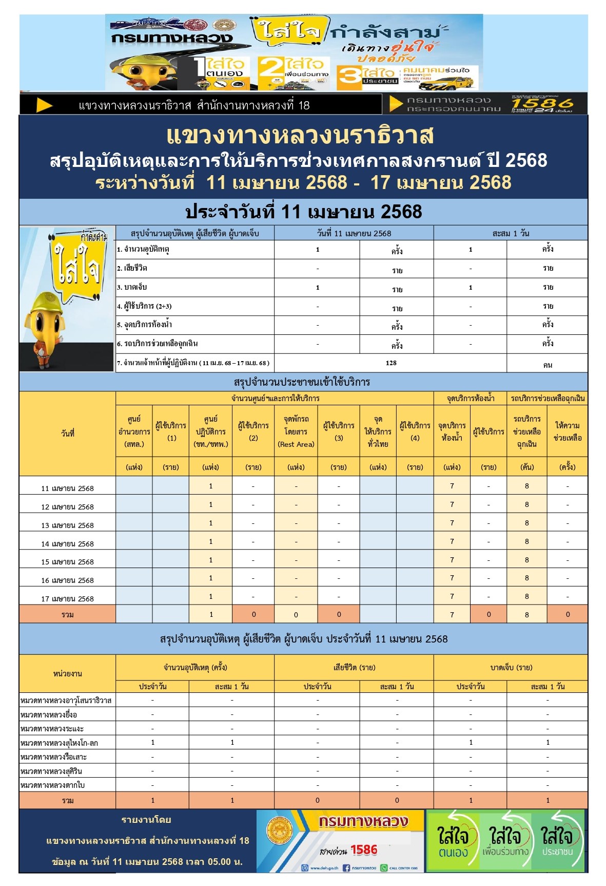 สรุปรายงานอุบัติเหตุและการให้บริการช่วงเทศกาลสงกรานต์ ปี 2568 ประจำวันที่ 11 เมษายน 2568