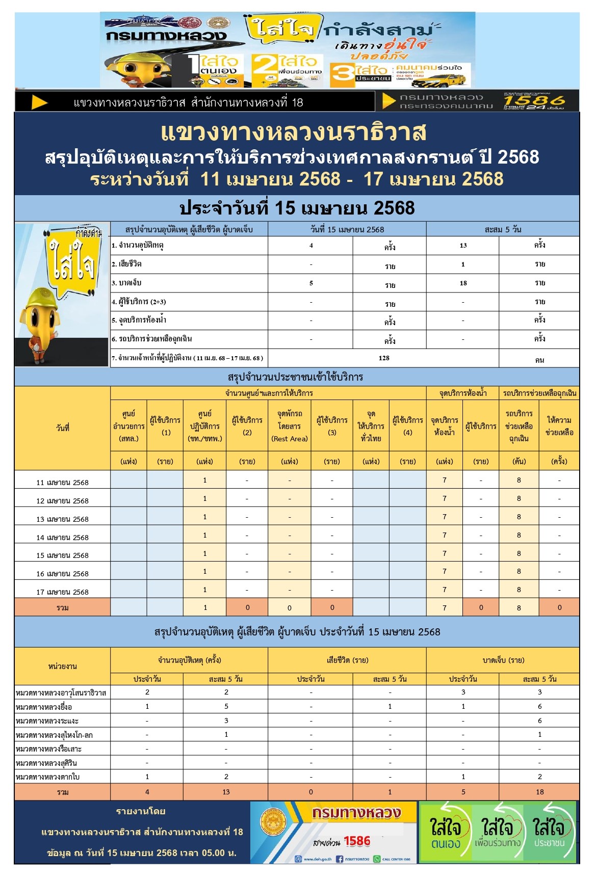 สรุปรายงานอุบัติเหตุและการให้บริการช่วงเทศกาลสงกรานต์ ปี 2568 ประจำวันที่ 15 เมษายน 2568
