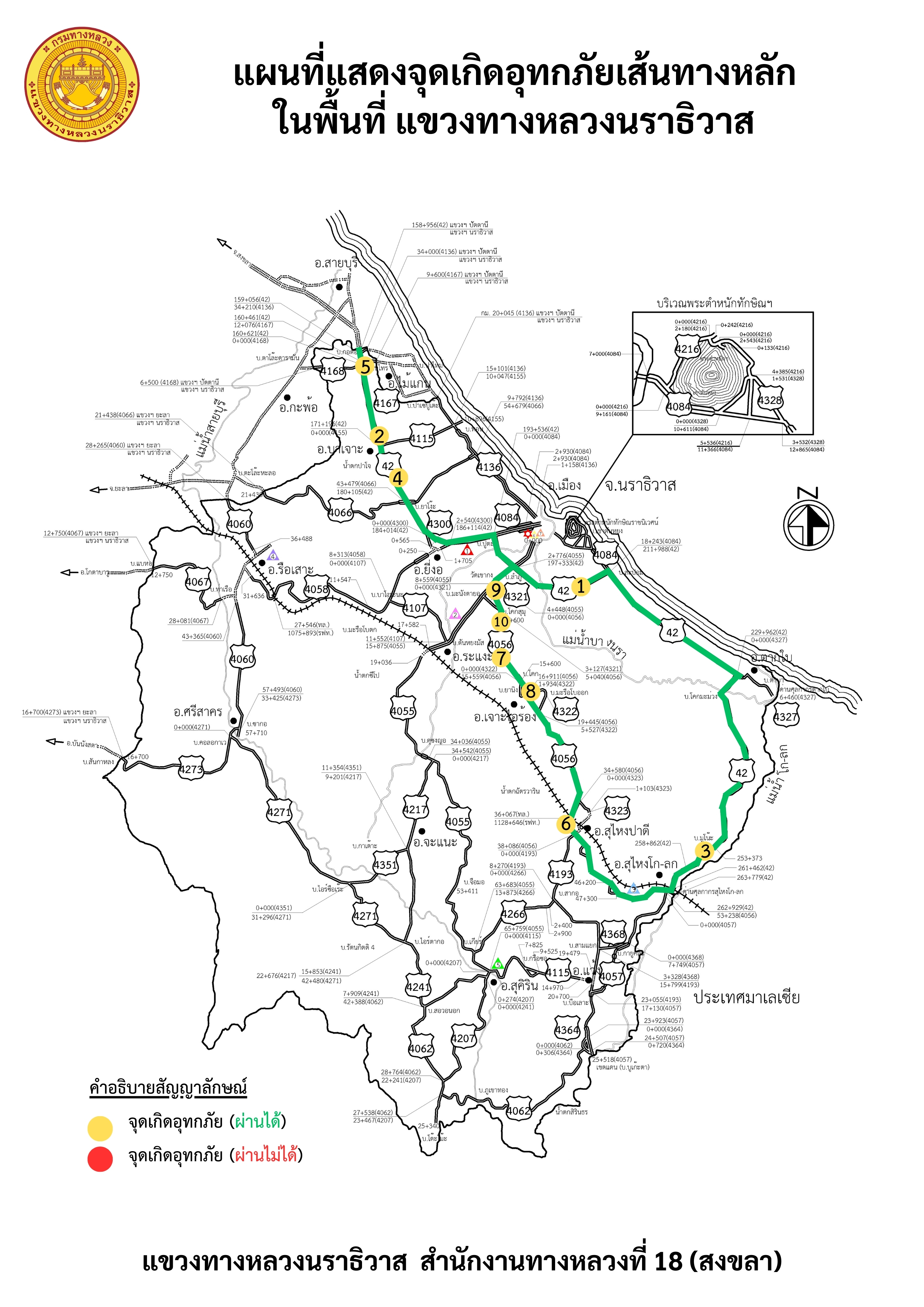 รายงานสถานการณ์อุทกภัยเส้นทางหลัก ได้แก่ ทล.42 และ ทล.4056 ในพื้นที่จังหวัดนราธิวาส วันเวลาที่ update วันที่ 27 พ.ย. 67 เวลา 20.30 น.