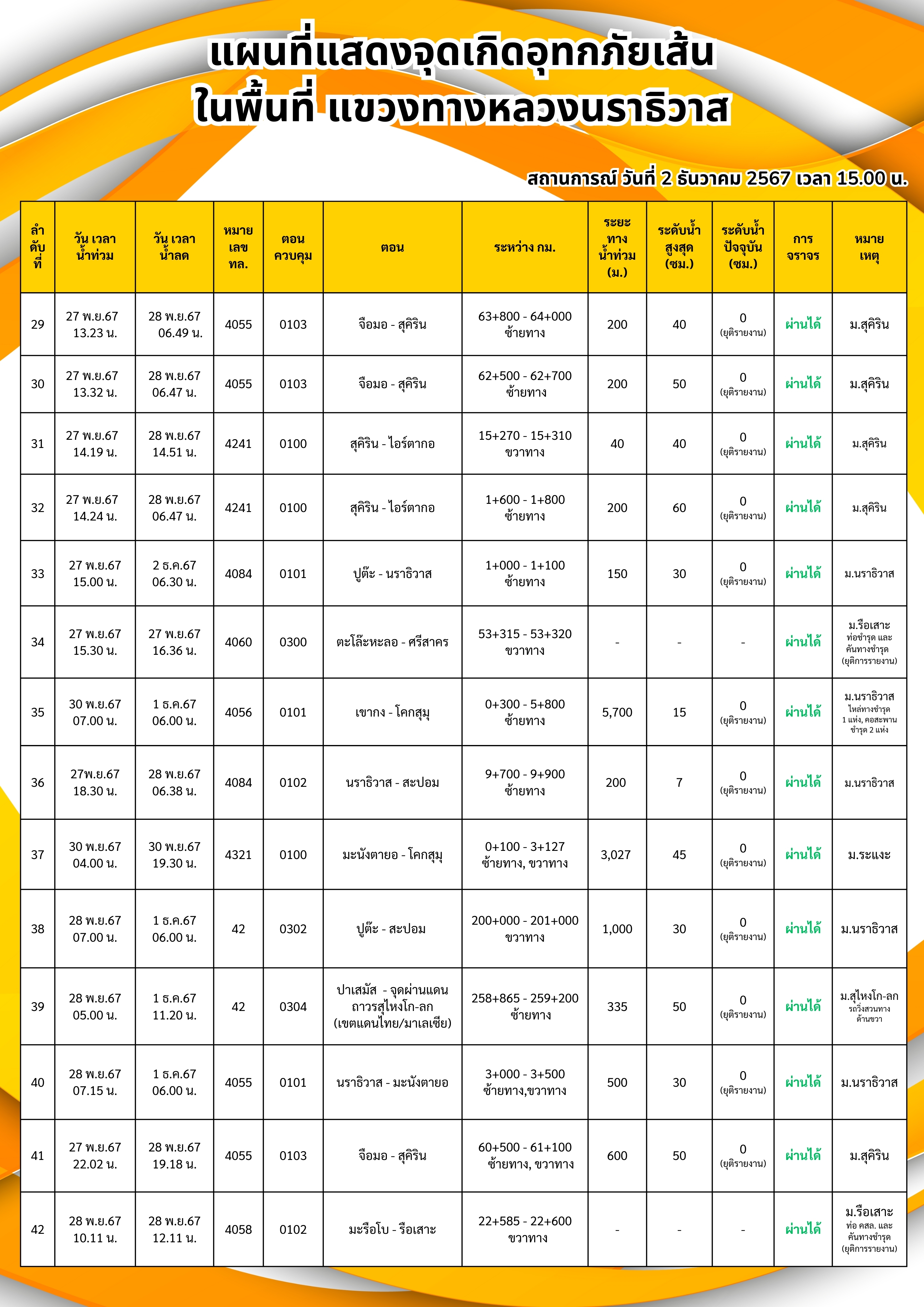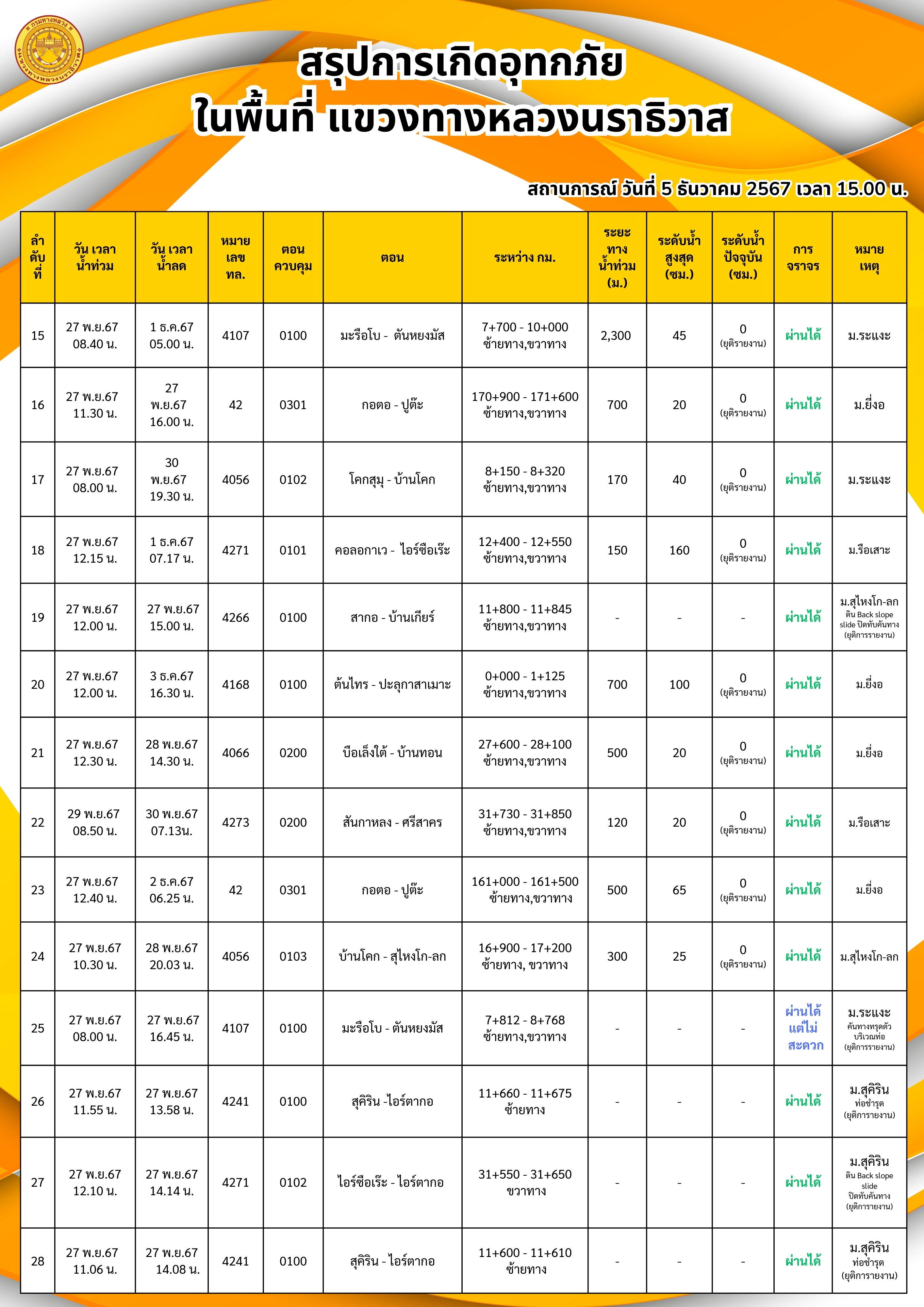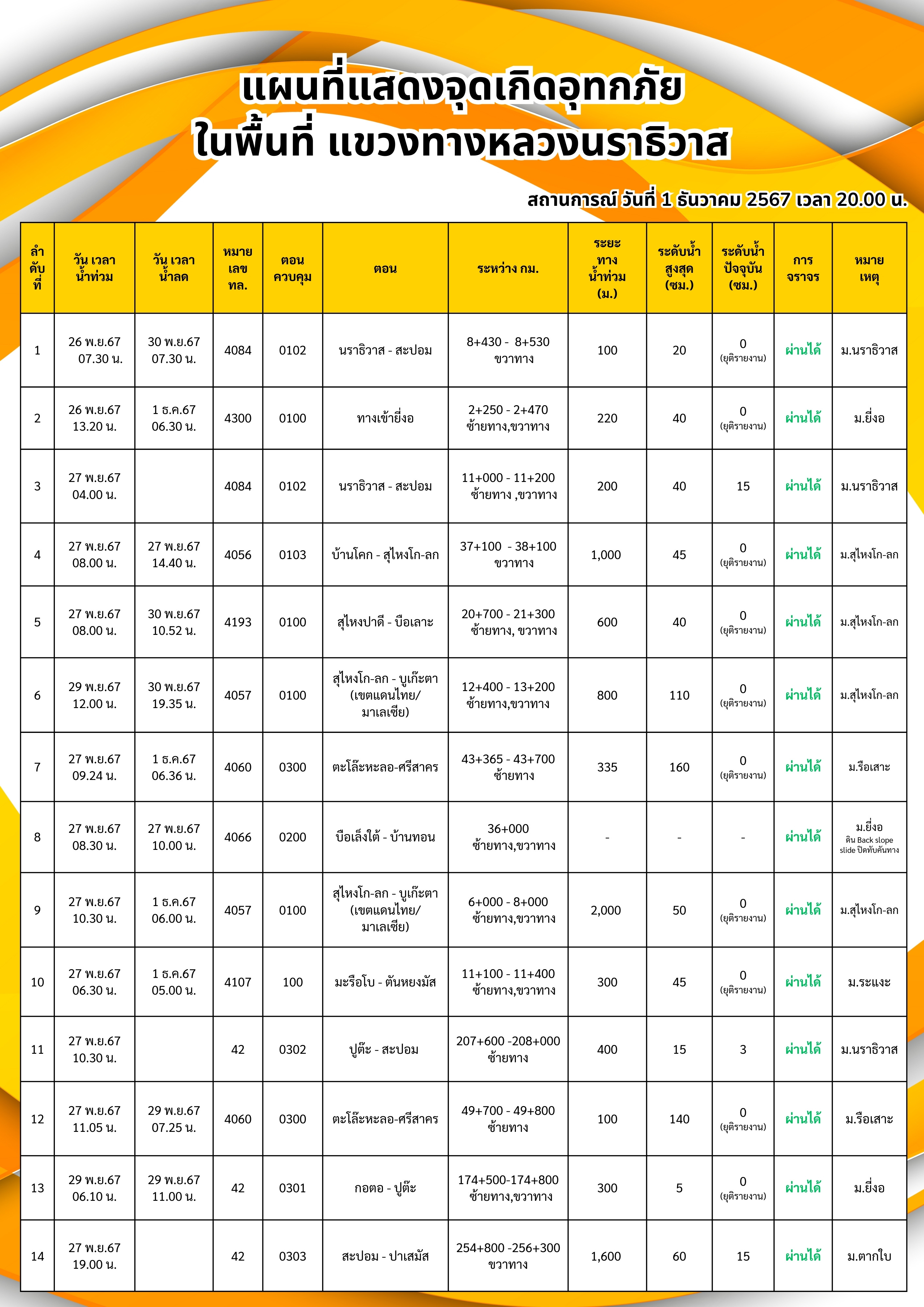 แขวงทางหลวงนราธิวาส ขอรายงานสถานการณ์อุทกภัยในพื้นที่จังหวัดนราธิวาส วันเวลาที่ update วันที่ 5 ธ.ค. 67 เวลา 20.00 น.