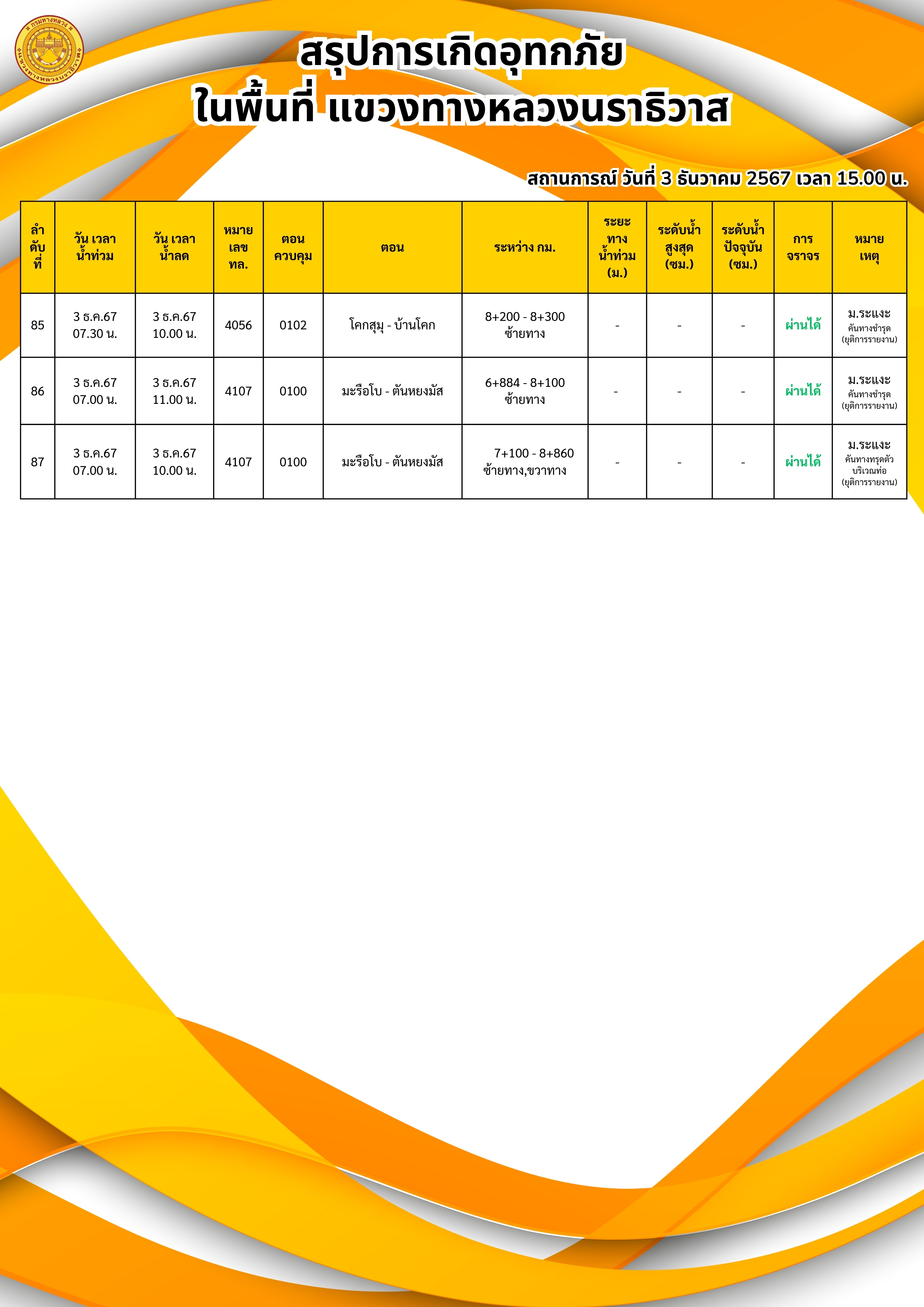 แขวงทางหลวงนราธิวาส ขอรายงานสถานการณ์อุทกภัยในพื้นที่จังหวัดนราธิวาส วันเวลาที่ update วันที่ 4 ธ.ค. 67 เวลา 20.00 น.