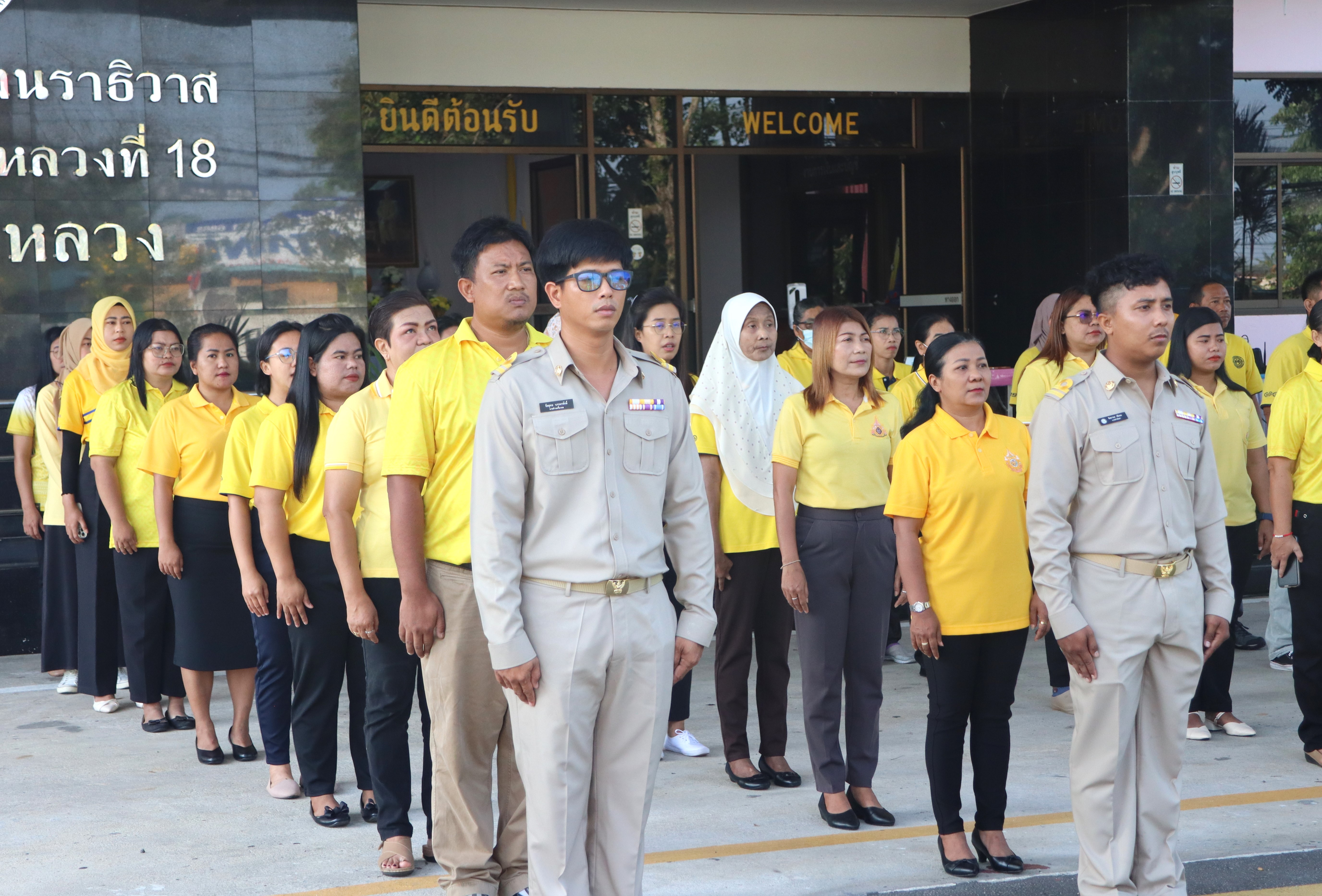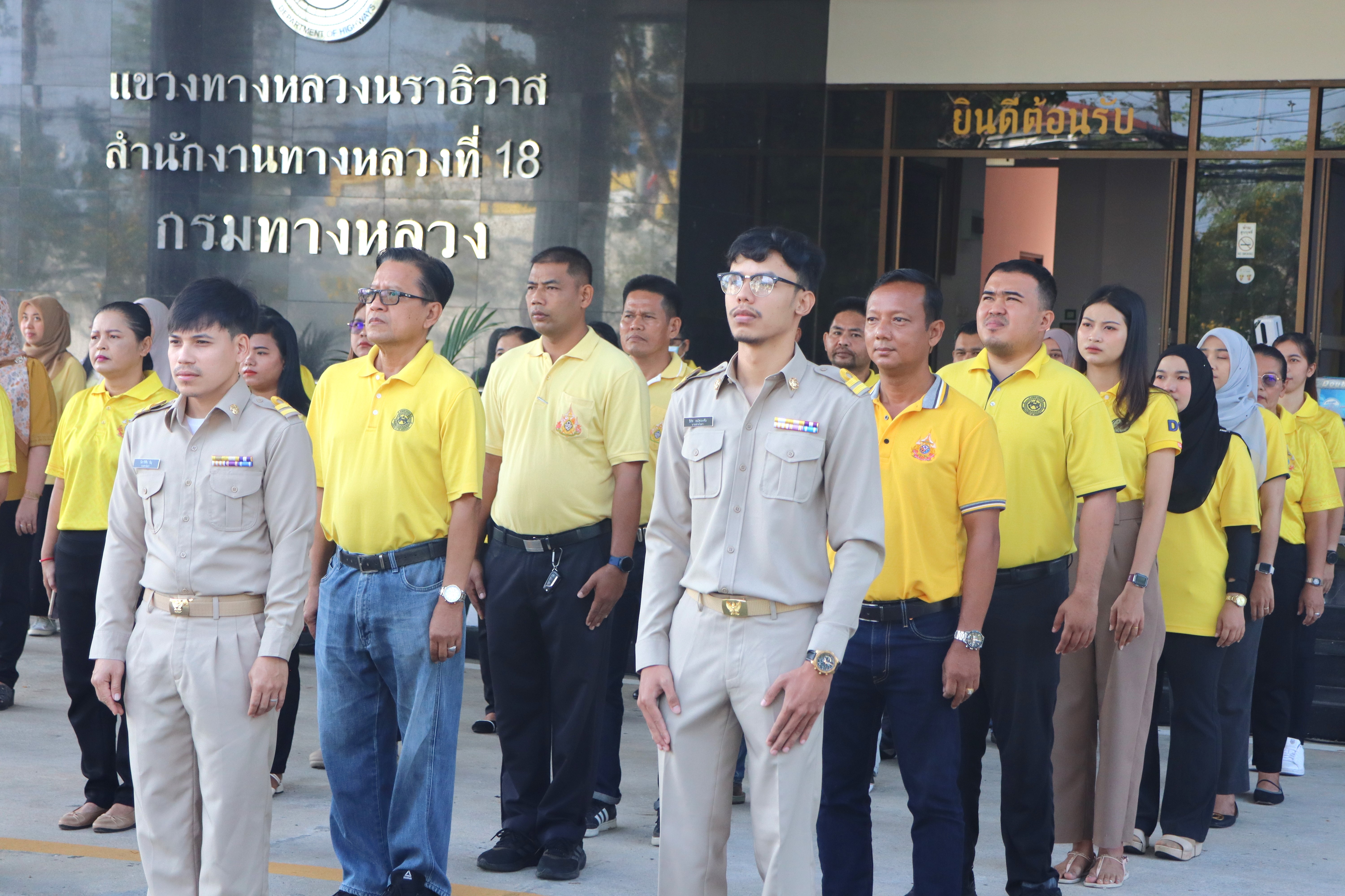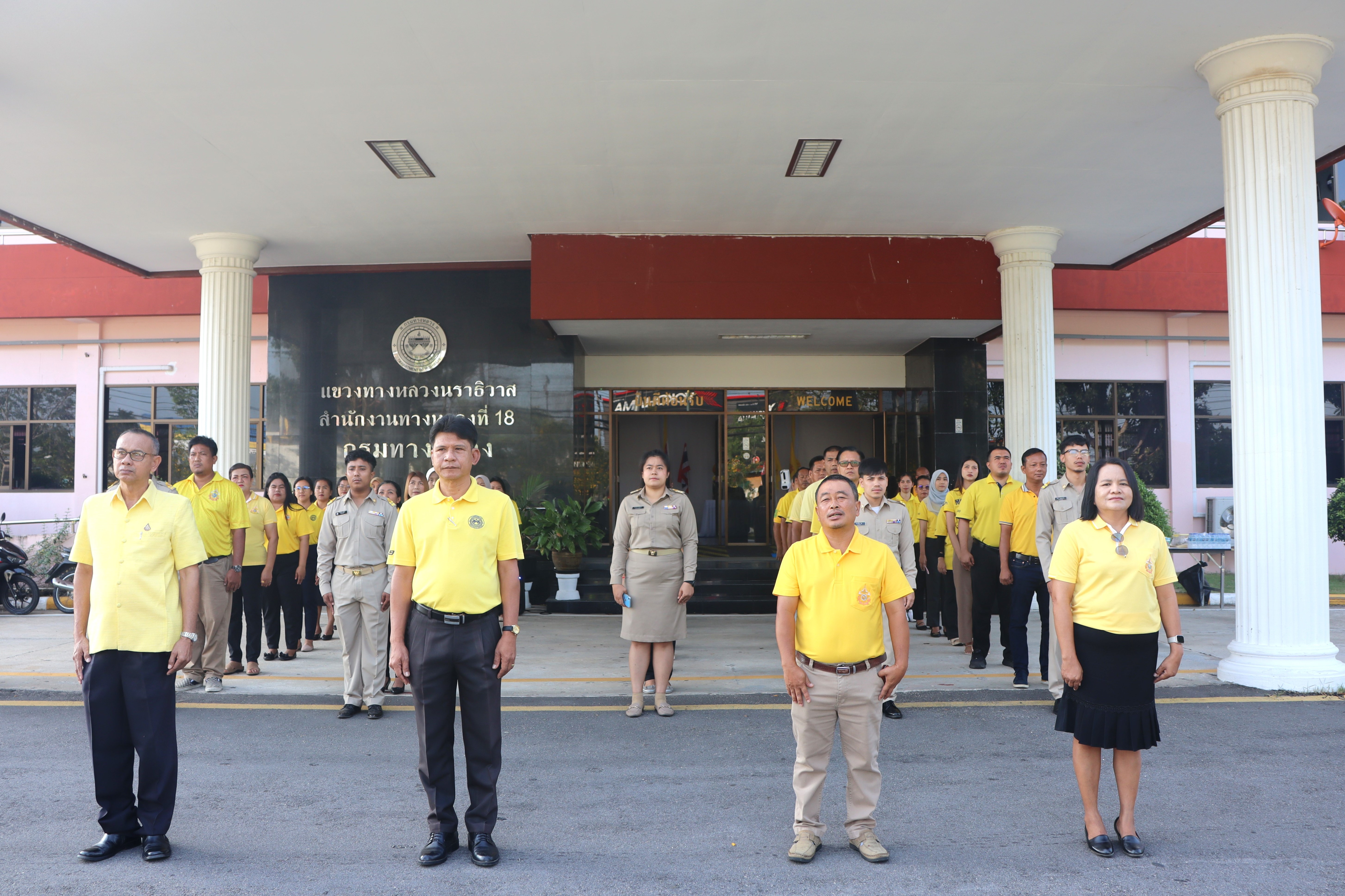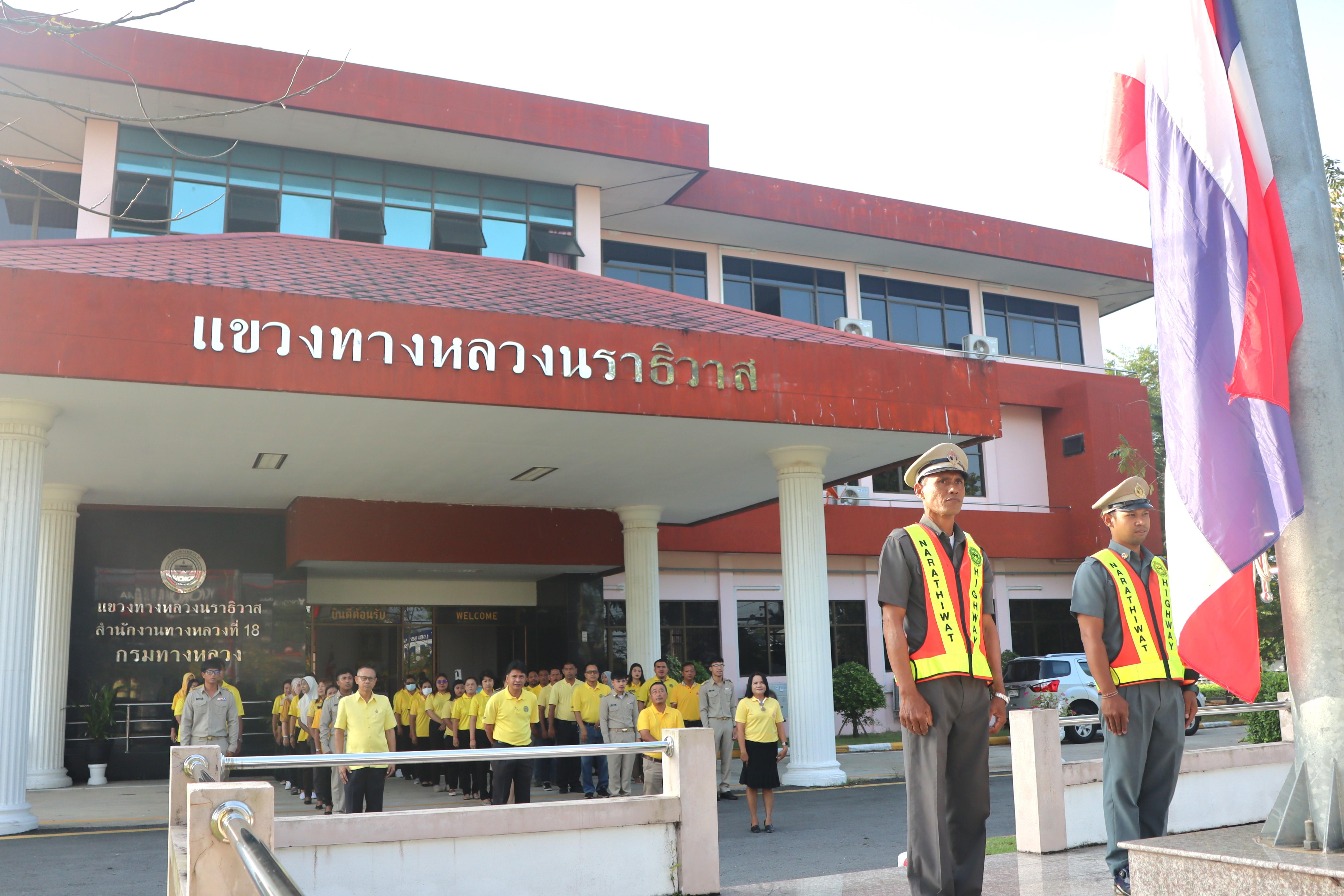นายจอมปวีร์ จันทร์หิรัญ ผู้อำนวยการสำนักงานทางหลวงที่ 18 รักษาราชการแทน ผู้อำนวยการแขวงทางหลวงนราธิวาส มอบหมายให้รองผู้อำนวยการแขวงทางหลวงนราธิวาส ฝ่ายปฏิบัติการ ฝ่ายวิศวกรรม และฝ่ายบริหาร นำข้าราชการ และเจ้าหน้าที่แขวงทางหลวงนราธิวาส ร่วมกิจกรรมเข้าแถวเคารพธงชาติ โดยร่วมแต่งกายด้วยเสื้อสีเหลืองเพื่อเฉลิมพระเกียรติพระบาทสมเด็จพระเจ้าอยู่หัว เนื่องในโอกาสมหามงคลเฉลิมพระชนมพรรษา 6 รอบ 28 กรกฏาคม 2567 และเพื่อเสริมสร้างจิตสำนึกต่อสถาบันชาติ ศาสนา พระมหากษัตริย์ และการเป็นข้าราชการที่ดี เพื่อแสดงออกถึงความจงรักภักดีต่อชาติ ศาสนา พระมหากษัตริย์ และเป็นการเตรียมความพร้อมในการปฏิบัติราชการ อีกทั้งยังเป็นการเพิ่มประสิทธิภาพในการทำงาน เสริมสร้างความรัก ความสามัคคีในองค์กร พร้อมกันนี้ได้ให้การต้อนรับ และร่วมแสดงความยินดีกับข้าราชการบรรจุใหม่ และข้าราชการโอนย้ายมาปฏิบัติงาน ณ แขวงทางหลวงนราธิวาส โดยมีรองผู้อำนวยการแขวงทางหลวงนราธิวาส ฝ่ายปฏิบัติการ ฝ่ายวิศวกรรม และฝ่ายบริหาร กล่าวต้อนรับ