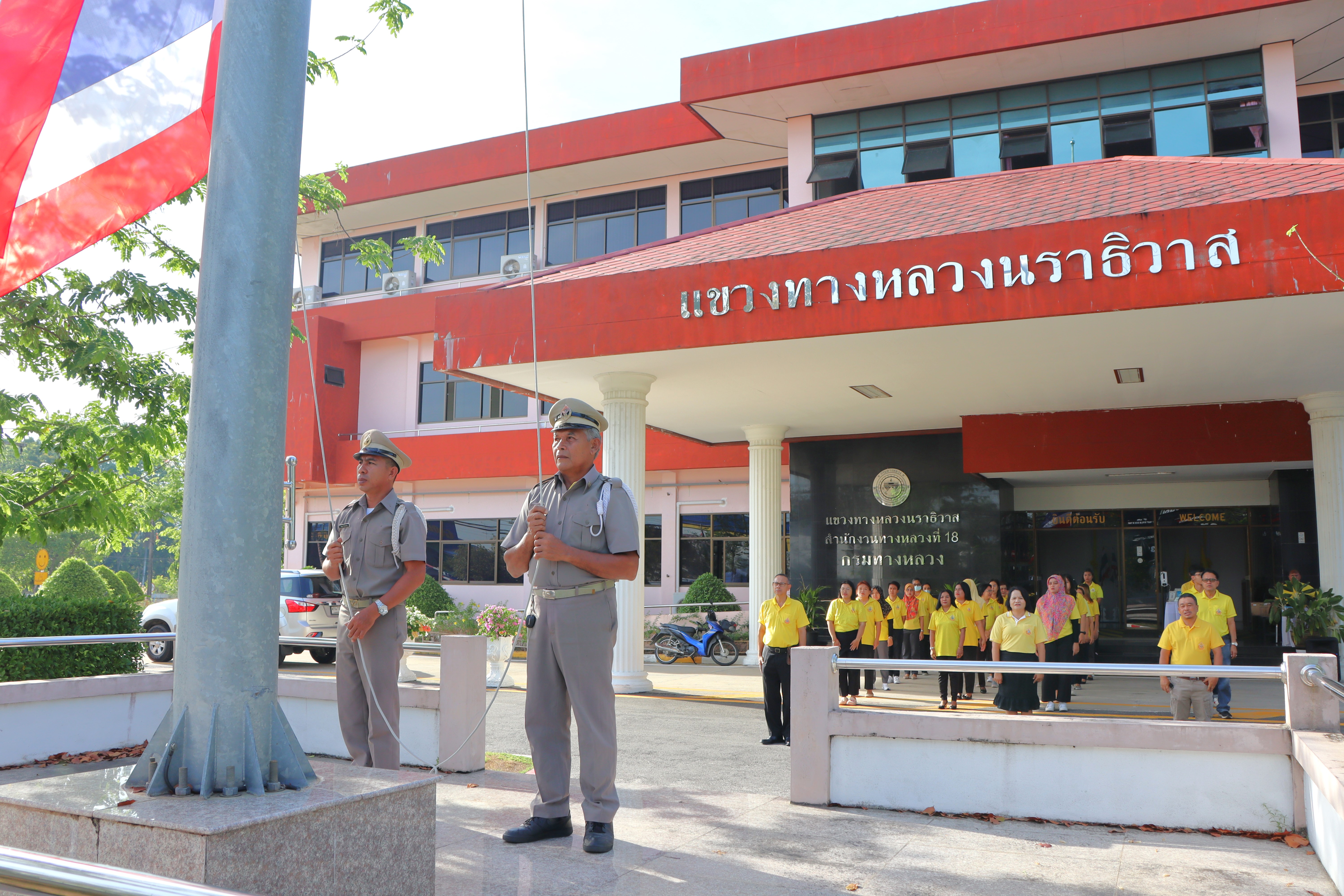 นายปฏิเวชวุฒิศักย์ สุขขี ผู้อำนวยการแขวงทางหลวงนราธิวาส มอบหมายให้รองผู้อำนวยการแขวงทางหลวงนราธิวาส ฝ่ายปฏิบัติการ ฝ่ายบริหาร ผู้อำนวยการหมวดทางหลวงอาวุโสนราธิวาส นำข้าราชการ และเจ้าหน้าที่แขวงทางหลวงนราธิวาส ร่วมกิจกรรมเข้าแถวเคารพธงชาติ โดยร่วมแต่งกายด้วยเสื้อสีเหลืองเพื่อเฉลิมพระเกียรติพระบาทสมเด็จพระเจ้าอยู่หัว เนื่องในโอกาสมหามงคลเฉลิมพระชนมพรรษา 6 รอบ 28 กรกฏาคม 2567 และเพื่อเสริมสร้างจิตสำนึกต่อสถาบันชาติ ศาสนา พระมหากษัตริย์ และการเป็นข้าราชการที่ดี เพื่อแสดงออกถึงความจงรักภักดีต่อชาติ ศาสนา พระมหากษัตริย์ และเป็นการเตรียมความพร้อมในการปฏิบัติราชการอีกทั้งยังเป็นการเพิ่มประสิทธิภาพในการทำงานเสริมสร้างความรัก ความสามัคคีในองค์กร