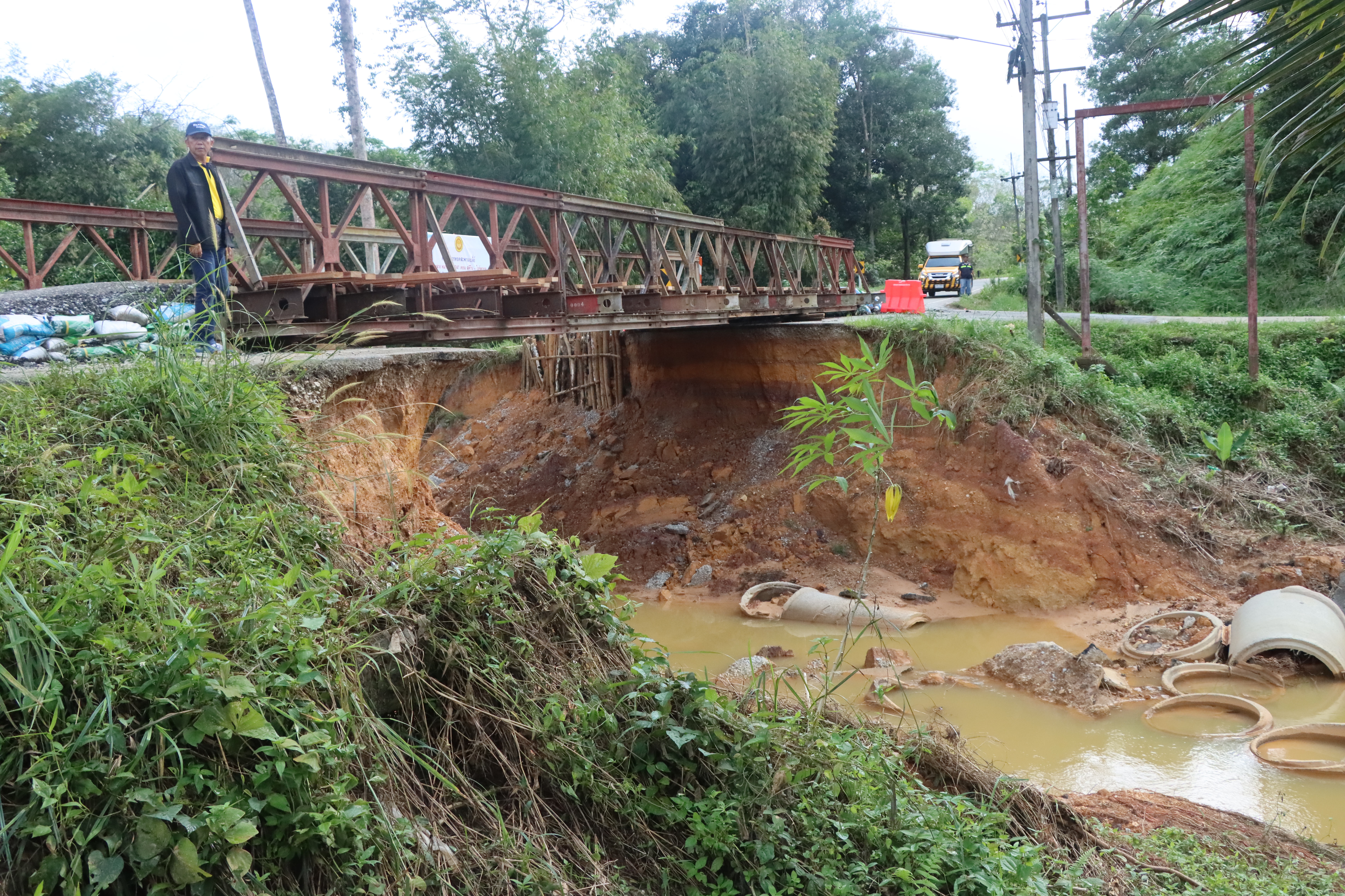 นายจิระพงศ์ เทพพิทักษ์ รองอธิบดีฝ่ายบำรุงทาง ลงพื้นที่ติดตามปัญหา และตรวจเส้นทางจากเหตุอุทกภัยในพื้นที่จังหวัดนราธิวาส โดยมีนายจอมปวีร์ จันทร์หิรัญ ผู้อำนวยการสำนักงานทางหลวงที่ 18 นายสมัคร เลือดวงหัด ผู้อำนวยการแขวงทางหลวงนราธิวาส พร้อมด้วยผู้อำนวยการส่วน ข้าราชการ และเจ้าหน้าที่ในสังกัด ร่วมลงพื้นที่ตรวจสอบจุดที่ได้รับผลกระทบจากอุทกภัย บริเวณทางหลวงหมายเลข 42410100 ตอน สุคิริน - ไอร์ตากอ ระหว่าง กม.10+220 ถึง กม.10+230 ตำบลสุคิริน อำเภอสุคิริน จังหวัดนราธิวาส เนื่องจากได้รับความเสียหายจากฝนตกหนักติดต่อกันเป็นระยะเวลาหลายวัน ตั้งแต่ 24 ธันวาคม 2566 - 4 มกราคม 2567 ที่ผ่านมา เกิดน้ำท่วม และน้ำป่าไหลหลาก ส่งผลให้ถนนถูกกัดเซาะได้รับความเสียหาย ประชาชนในพื้นที่ไม่สามารถสัญจรไปมาได้ จากสถานการณ์ฝนตกหนักอย่างต่อเนื่อง โดยจุดดังกล่าวศูนย์สร้างและบูรณะสะพานที่ 4 (นครศรีธรรมราช) ดำเนินการติดตั้งสะพานเบลีย์เพื่อเชื่อมทางขาด โดยแขวงทางหลวงนราธิวาส และสำนักงานทางหลวงที่ 18 ร่วมดำเนินการจนแล้วเสร็จในวันที่ 28 ธันวาคม2566 สามารถเปิดให้ประชาชนใช้สัญจรได้ชั่วคราว