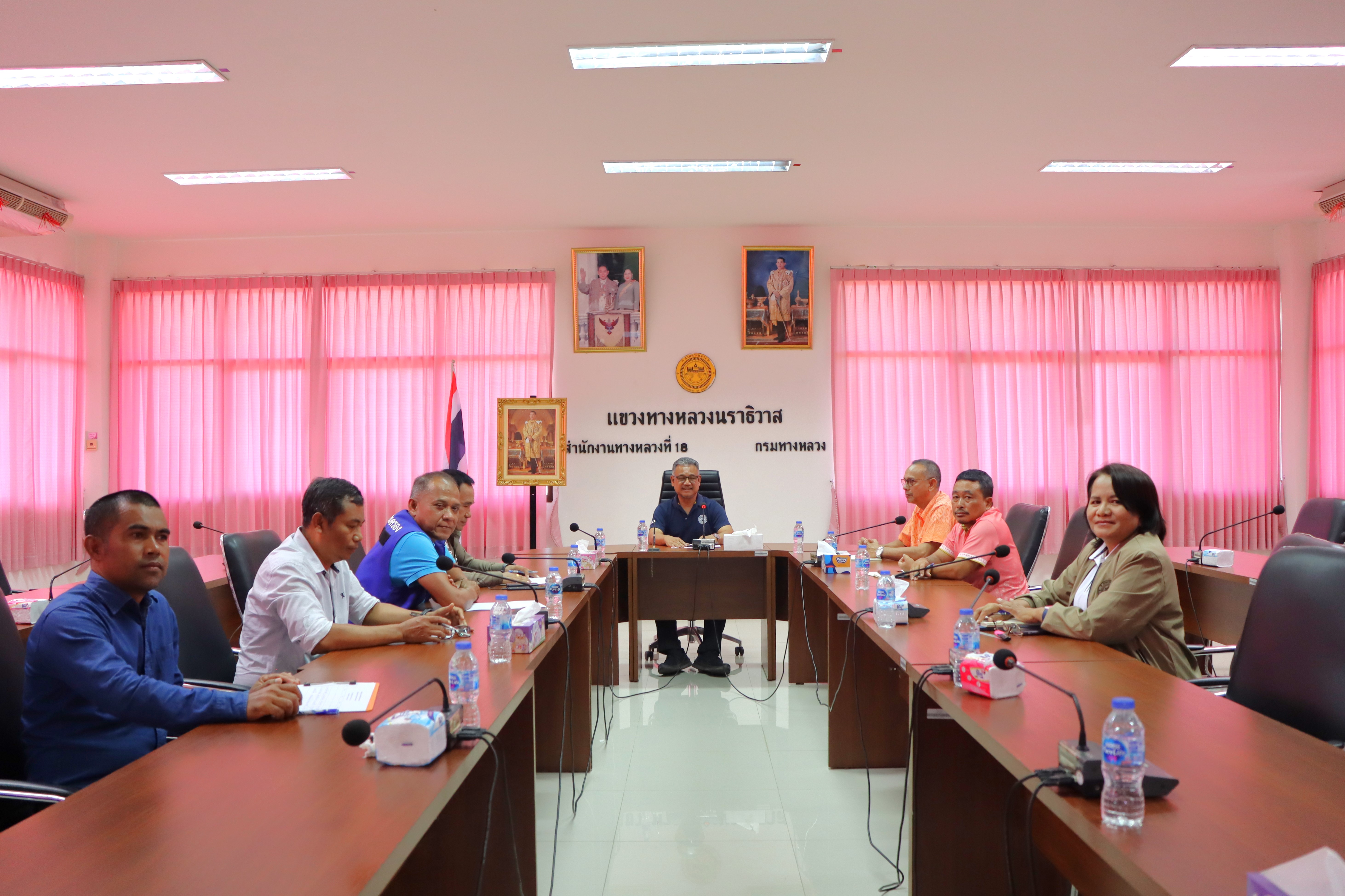 นายปฏิเวชวุฒิศักย์ สุขขี ผู้อำนวยการแขวงทางหลวงนราธิวาส พร้อมด้วยนายจำลอง จันสุข รองผู้อำนวยการแขวงทางหลวงนราธิวาส (ฝ่ายปฏิบัติการ) นายธวัชชัย เผนานนท์ รองผู้อำนวยการแขวงทางหลวงนราธิวาส (ฝ่ายวิศวกรรม) นางอรัญญา เพ็ชรพูล รองผู้อำนวยการแขวงทางหลวงนราธิวาส (ฝ่ายบริหาร) นายวีระชัย ปัญญาเถิง ผู้อำนวยการหมวดทางหลวงอาวุโสนราธิวาส และนายศราวุธ ชุมทอง หัวหน้างานอำนวยความปลอดภัย ร่วมประชุมหารือเพื่อพิจารณาแนวทางแก้ไขปัญหาอุบัติเหตุทางถนนบริเวณหน้าแขวงทางหลวงนราธิวาส ร่วมกับอำเภอเมืองนราธิวาส เทศบาลเมืองนราธิวาส โครงการชลประทานนราธิวาส และสถานีตำรวจภูธรเมืองนราธิวาส เข้าร่วมประชุมเพื่อหาแนวทางการแก้ไขปัญหาดังกล่าว ณ ห้องประชุมชั้น 3 แขวงทางหลวงนราธิวาส