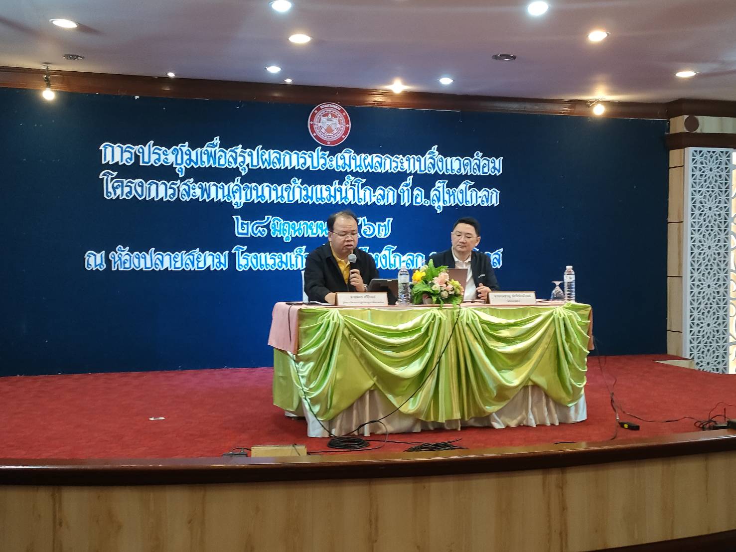 นายปฏิเวชวุฒิศักย์ สุขขี ผู้อำนวยการแขวงทางหลวงนราธิวาส มอบหมายให้นายธวัชชัย เผนานนท์ รองผู้อำนวยการแขวงทางหลวงนราธิวาส (ฝ่ายวิศวกรรม) ร่วมประชุมเพื่อสรุปผลการประเมินผลกระทบสิ่งแวดล้อม เพื่อนำเสนอข้อมูลสรุปผลของการศึกษาด้านต่าง ๆ และสรุปผลกระทบสิ่งแวดล้อมของโครงการ ตลอดจนผลการดำเนินงานด้านการมีส่วนร่วมของประชาชน โครงการสะพานคู่ขนานข้ามแม่น้ำโก-ลก ที่ อ.สุไหงโก-ลก ณ ห้องปลายสยาม ชั้น 10 โรงแรมเก็นติ้ง อ.สุไหงโก-ลก จ.นราธิวาส โดยมีนายอนิรุทร บัวอ่อน นายอำเภอสุไหงโก-ลก เป็นประธานในการประชุม