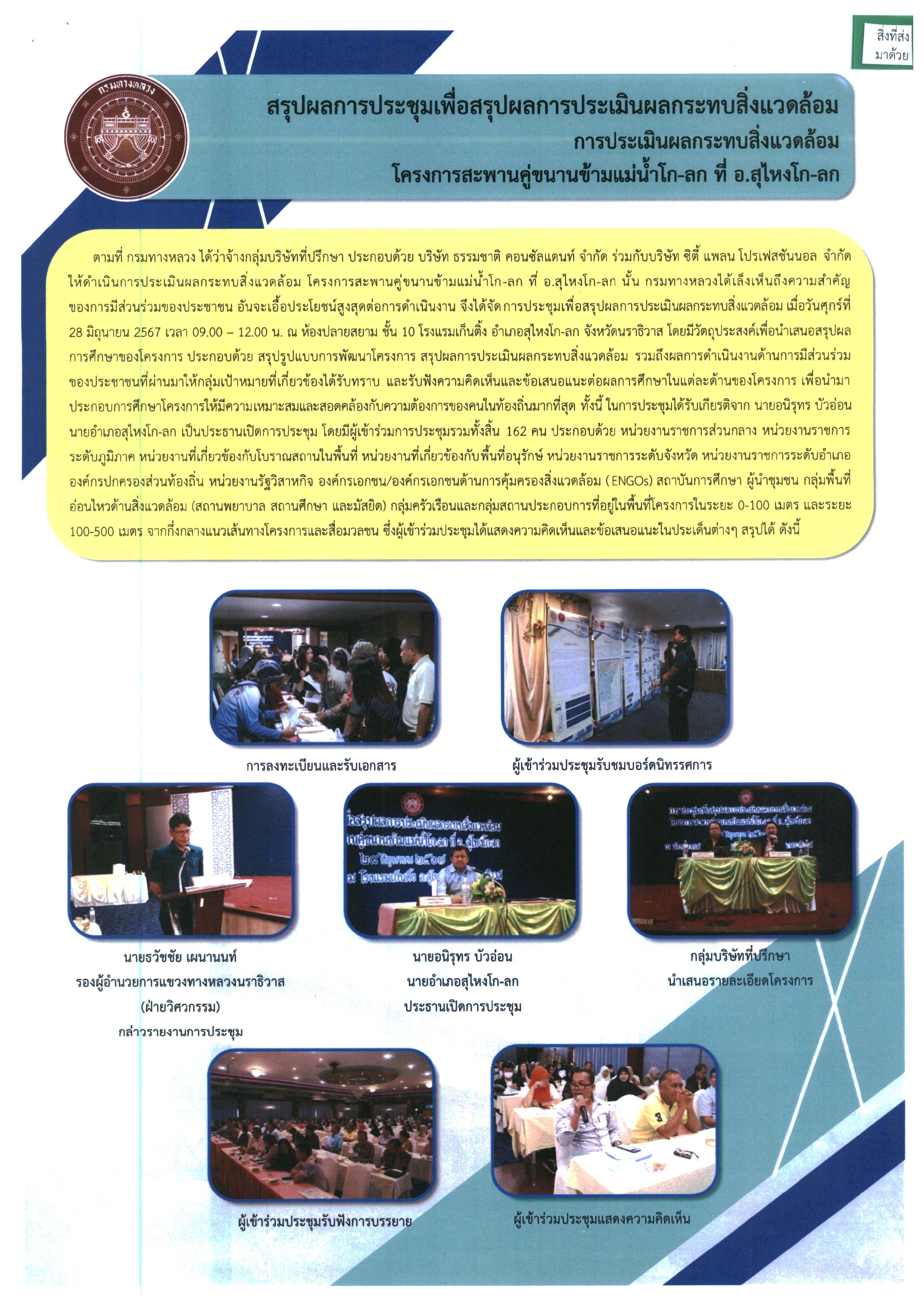 โดยได้รับเกียรติจากนายอนิรุทร บัวอ่อน นายอำเภอสุไหงโก-ลก เป็นประธานเปิดการประชุม มีผู้เข้าร่วมการประชุมรวมทั้งสิ้น 162 คน ประกอบด้วย โดยมีวัตถุประสงค์เพื่อนำเสนอสรุปผลการศึกษาของโครงการ ประกอบด้วย สรุปรูปแบบการพัฒนาโครงการ สรุปผลการประเมินผลกระทบสิ่งแวดล้อม รวมถึงผลการดำเนินงานด้านการมีส่วนร่วมของประชาชนที่ผ่านมาให้กลุ่มเป้าหมายที่เกี่ยวข้องได้ทราบ และรับฟังความคิดเห็นและข้อเสนอแนะต่อผลการศึกษาในแต่ละด้านของโครงการ