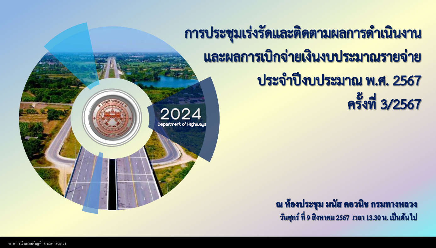 นายปฏิเวชวุฒิศักย์ สุขขี ผู้อำนวยการแขวงทางหลวงนราธิวาส มอบหมายให้รองผู้อำนวยการแขวงทางหลวงนราธิวาส (ฝ่ายปฏิบัติการ ฝ่ายวิศวกรรม ฝ่ายบริหาร) ผู้อำนวยการหมวดทางหลวงอาวุโสนราธิวาสพร้อมด้วยข้าราชการ และเจ้าหน้าที่ ร่วมประชุมเร่งรัดติดตามผลการดำเนินงานและการเบิกจ่ายงบประมาณรายจ่ายประจำปีงบประมาณ พ.ศ.2567 ครั้งที่ 3/2567 ผ่านระบบ Zoom Cloud Meeting ณ ห้องประชุมชั้น 3 แขวงทางหลวงนราธิวาส โดยมีนายสราวุธ ทรงศิวิไล อธิบดีกรมทางหลวง เป็นประธานในการประชุม พร้อมด้วยส่วนที่เกี่ยวข้อง เข้าร่วมประชุมดังกล่าว