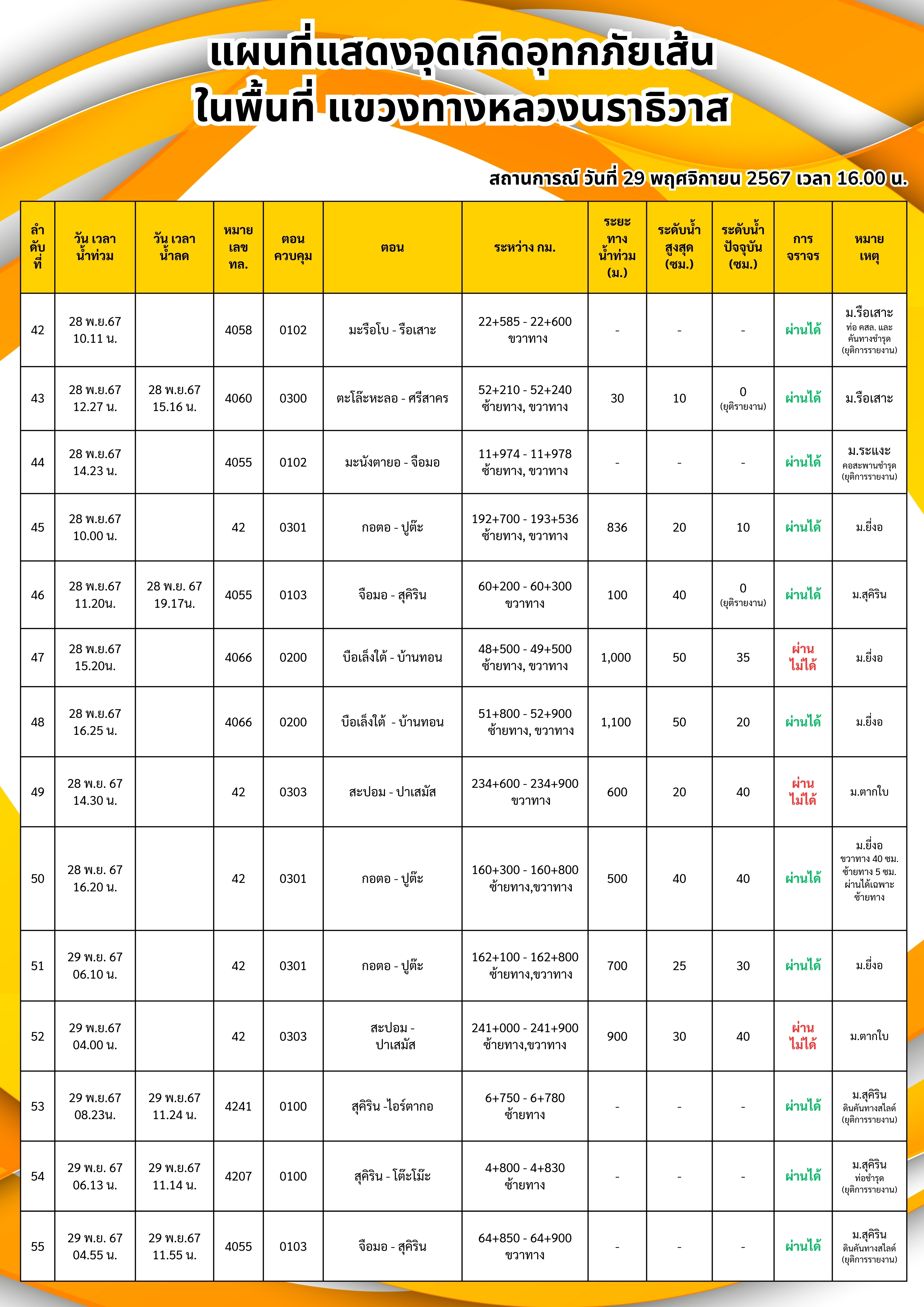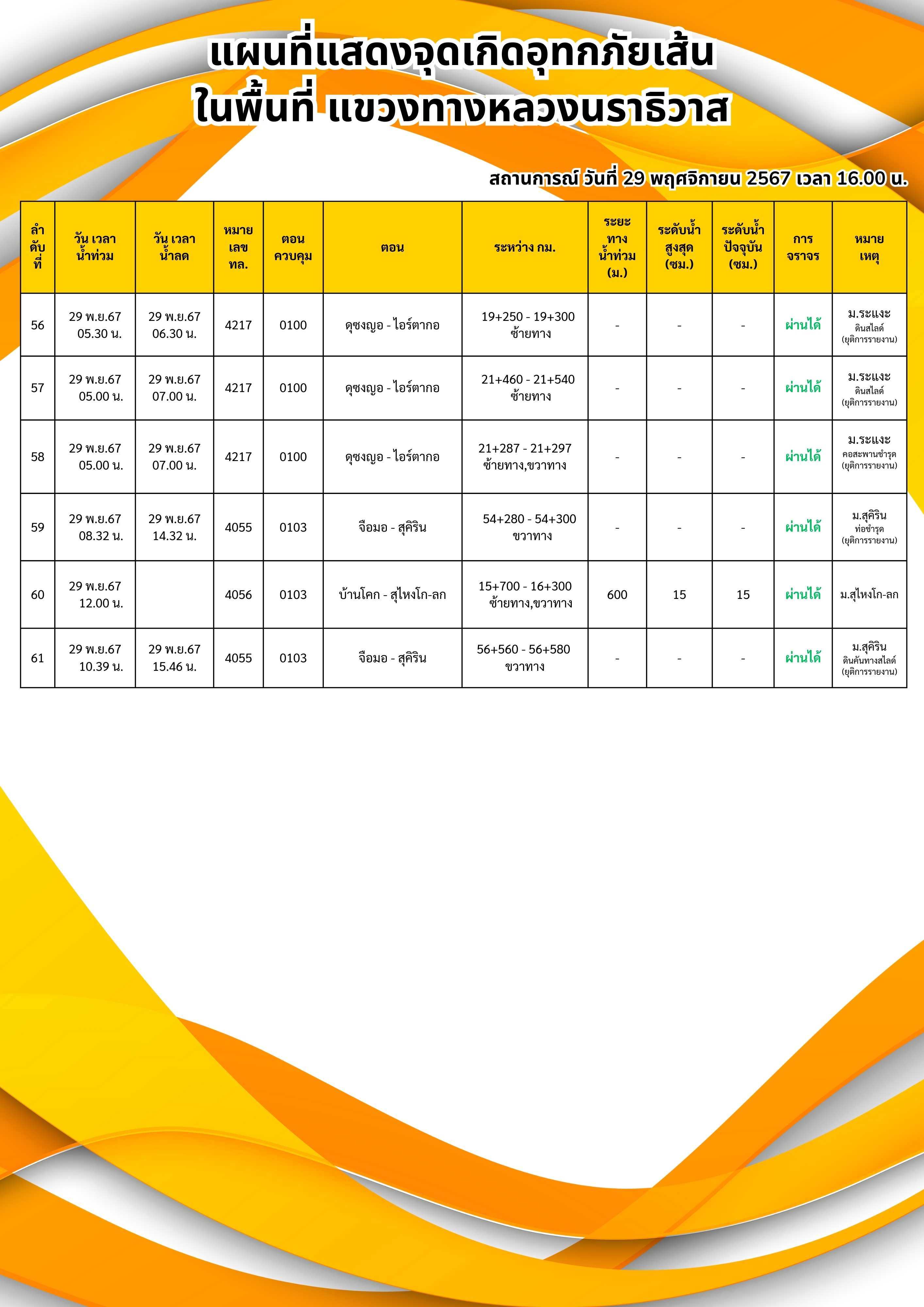 รายงานสถานการณ์อุทกภัยในพื้นที่จังหวัดนราธิวาส วันเวลาที่ update วันที่ 29 พ.ย. 67 เวลา 16.00 น.