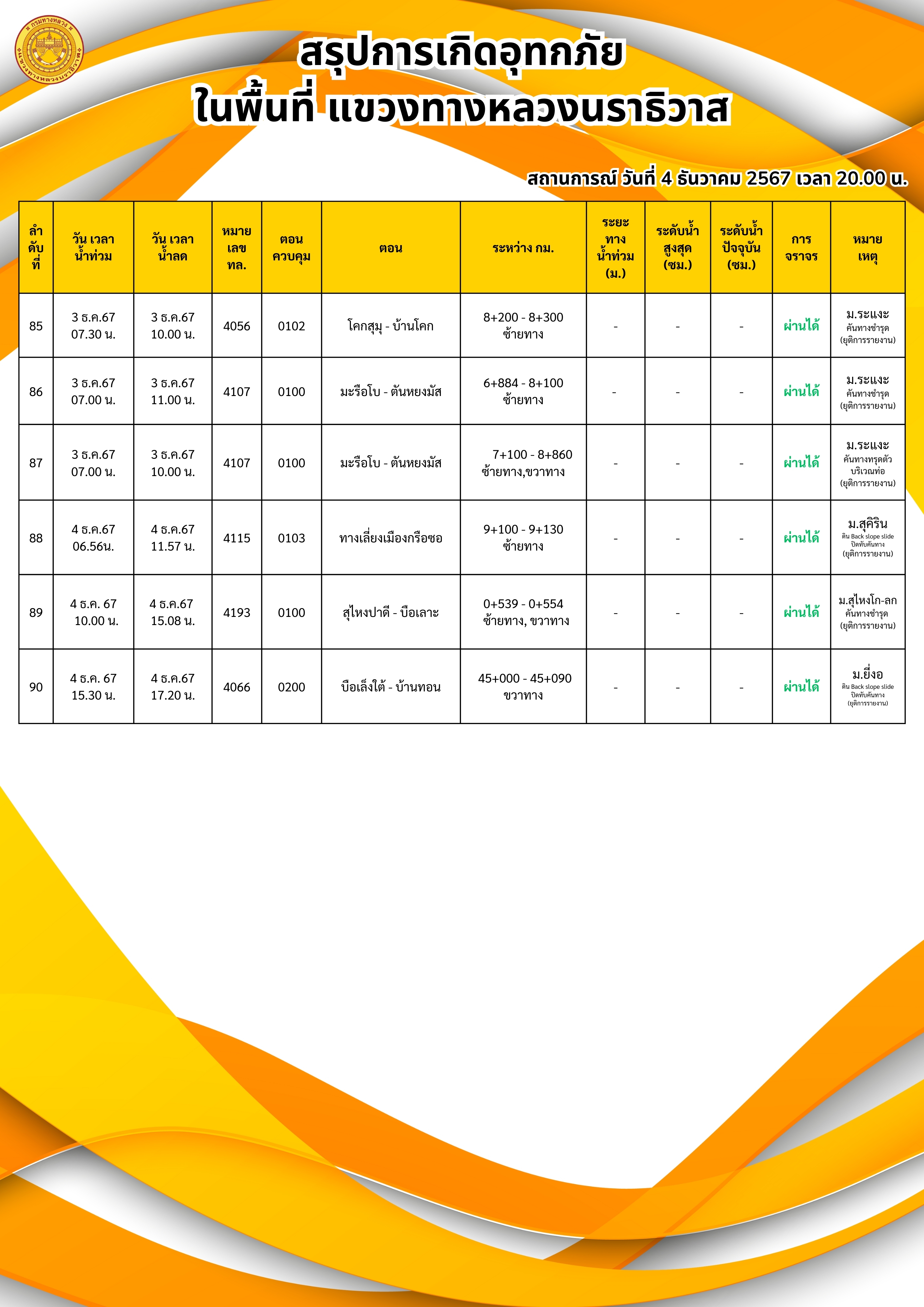แขวงทางหลวงนราธิวาส ขอรายงานสถานการณ์อุทกภัยในพื้นที่จังหวัดนราธิวาส วันเวลาที่ update วันที่ 4 ธ.ค. 67 เวลา 20.00 น.