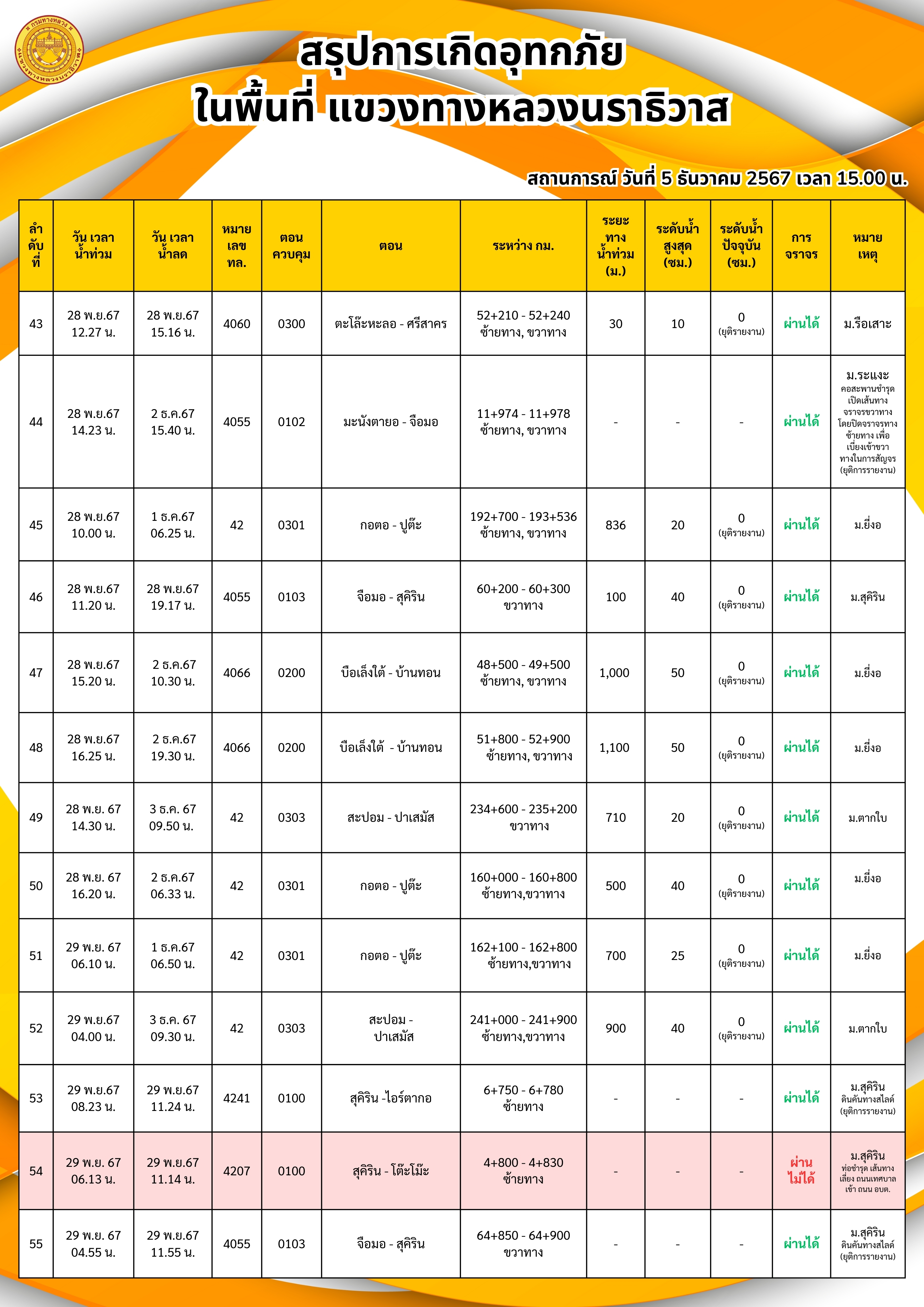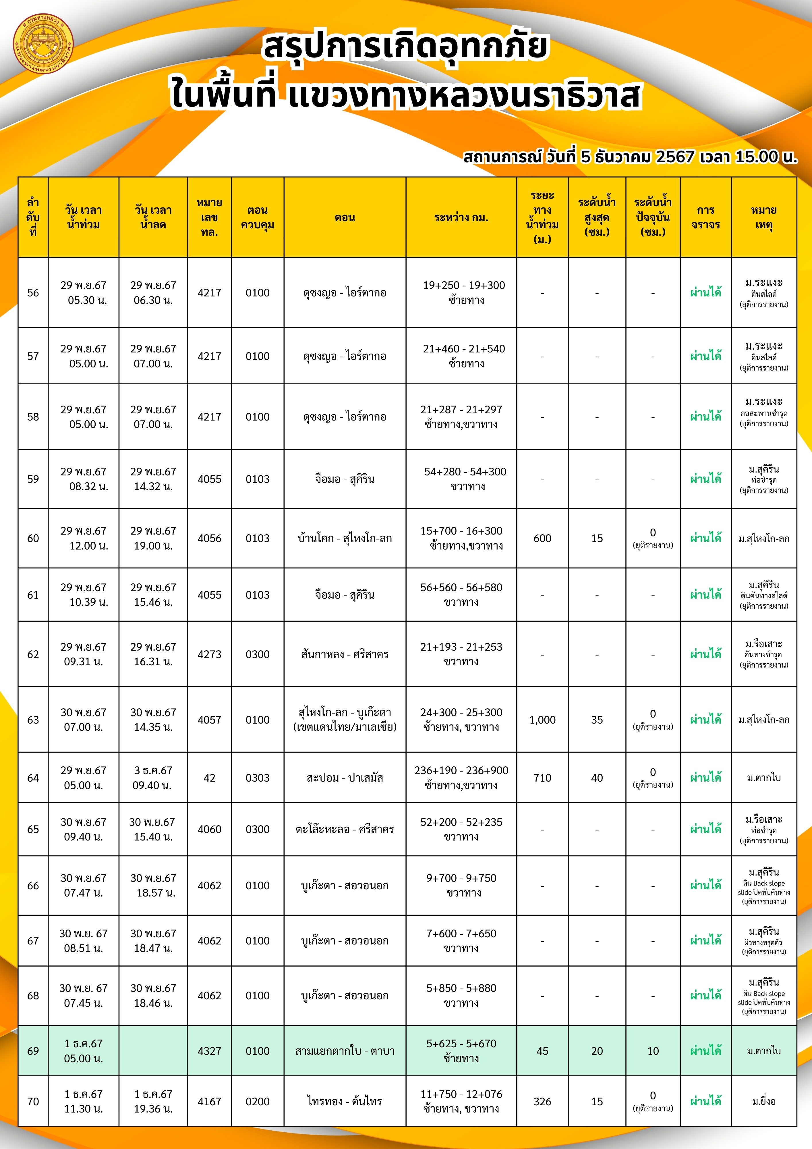 แขวงทางหลวงนราธิวาส ขอรายงานสถานการณ์อุทกภัยในพื้นที่จังหวัดนราธิวาส วันเวลาที่ update วันที่ 5 ธ.ค. 67 เวลา 20.00 น.