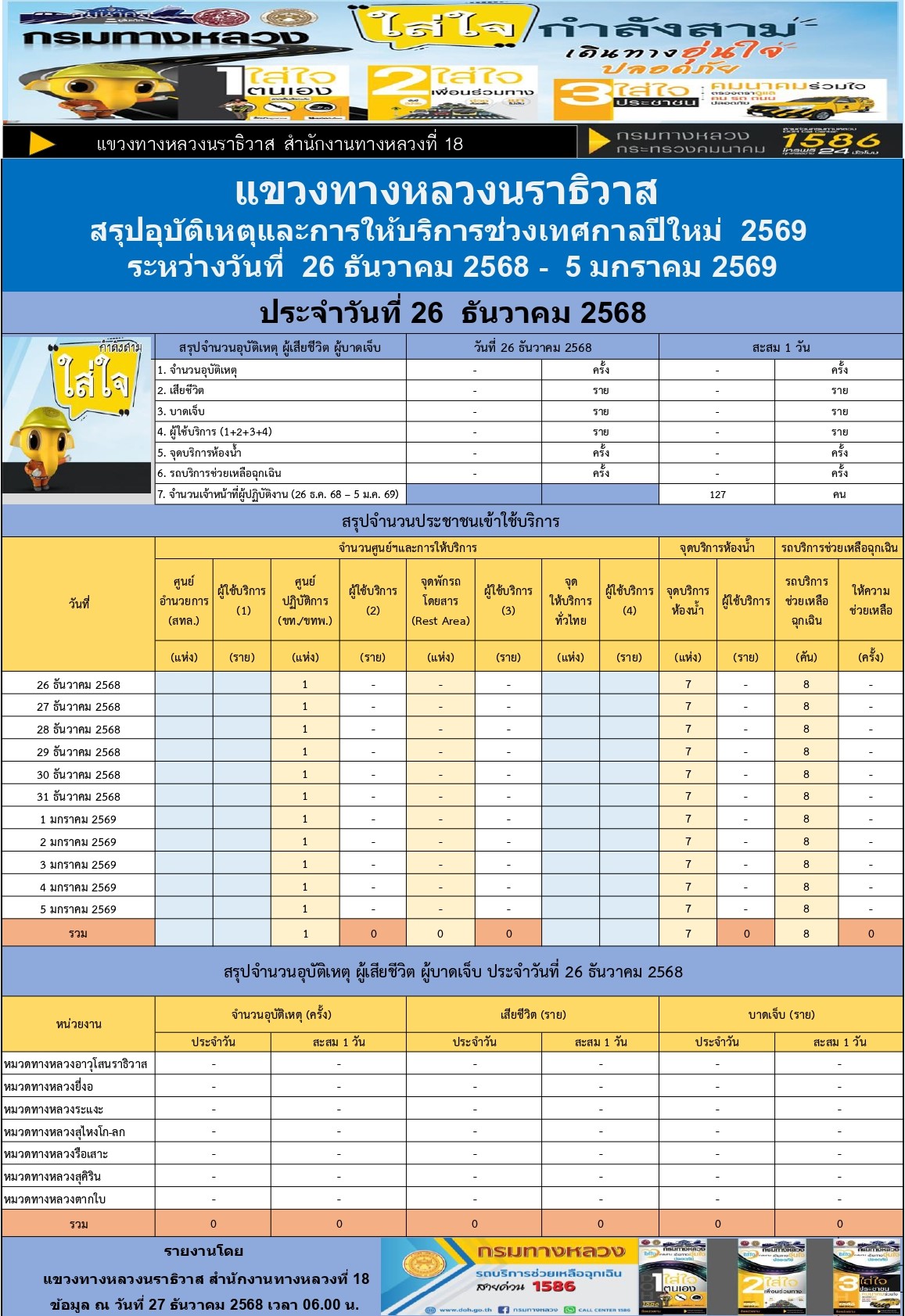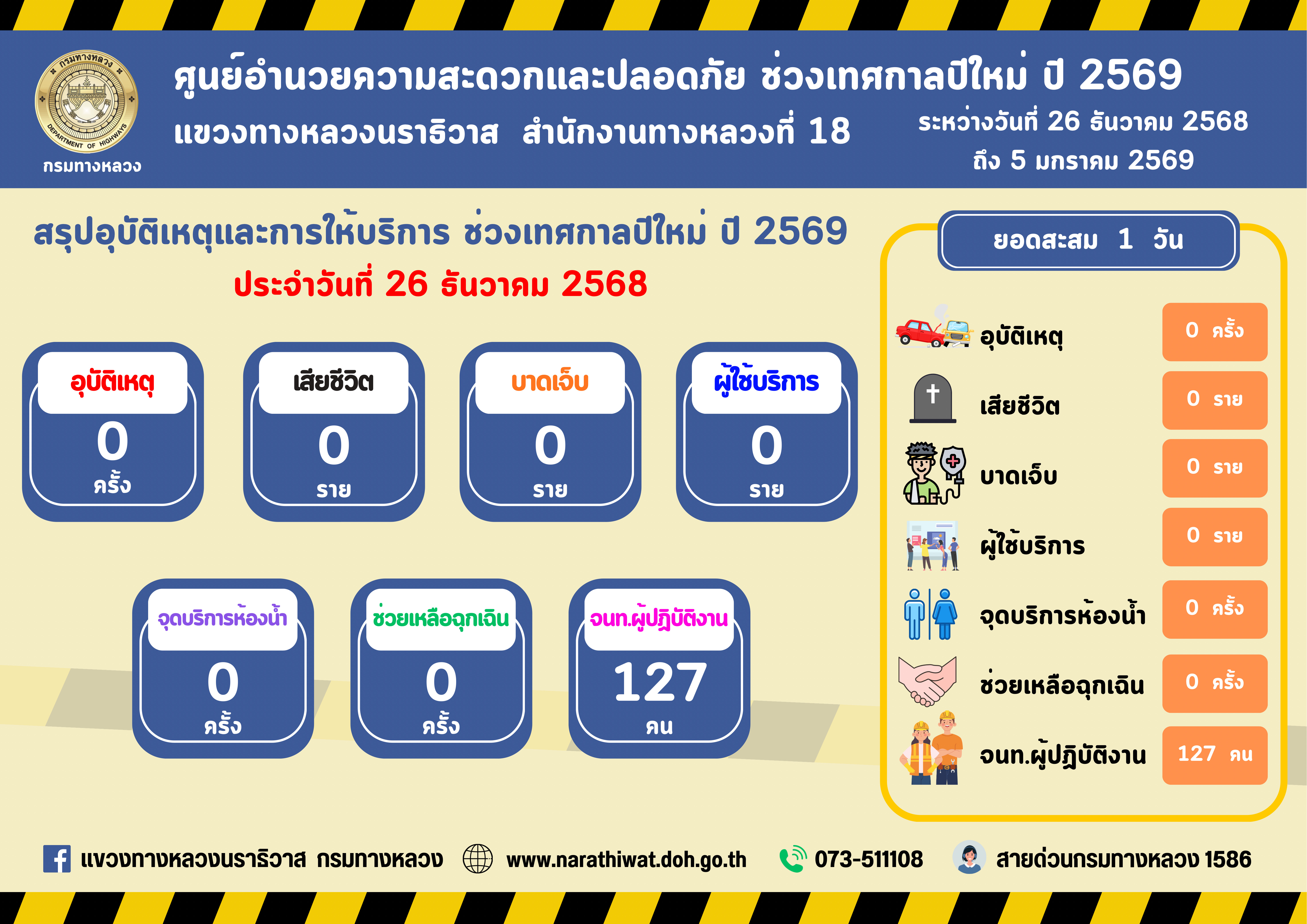 สรุปรายงานอุบัติเหตุและการให้บริการช่วงเทศกาลปีใหม่ 2569 ประจำวันที่ 26 ธันวาคม 2568