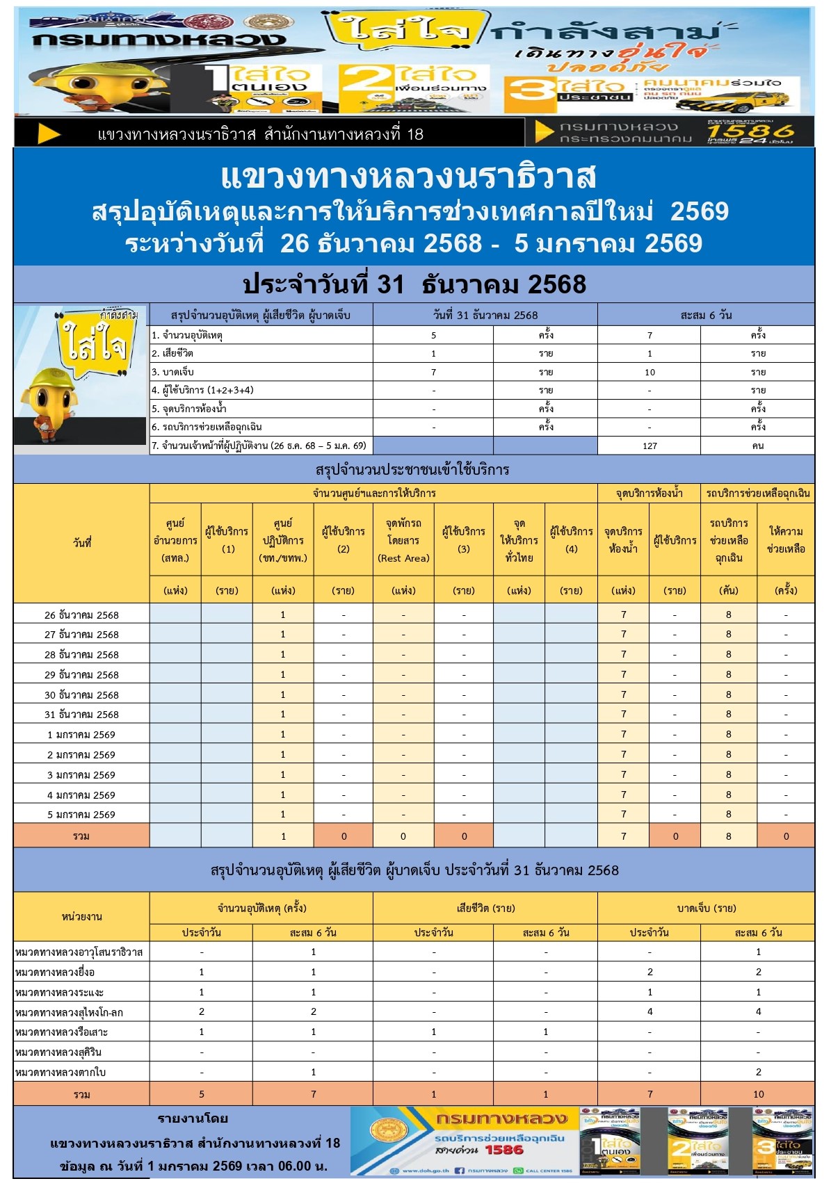 สรุปรายงานอุบัติเหตุและการให้บริการช่วงเทศกาลปีใหม่ 2569 ประจำวันที่ 31 ธันวาคม 2568