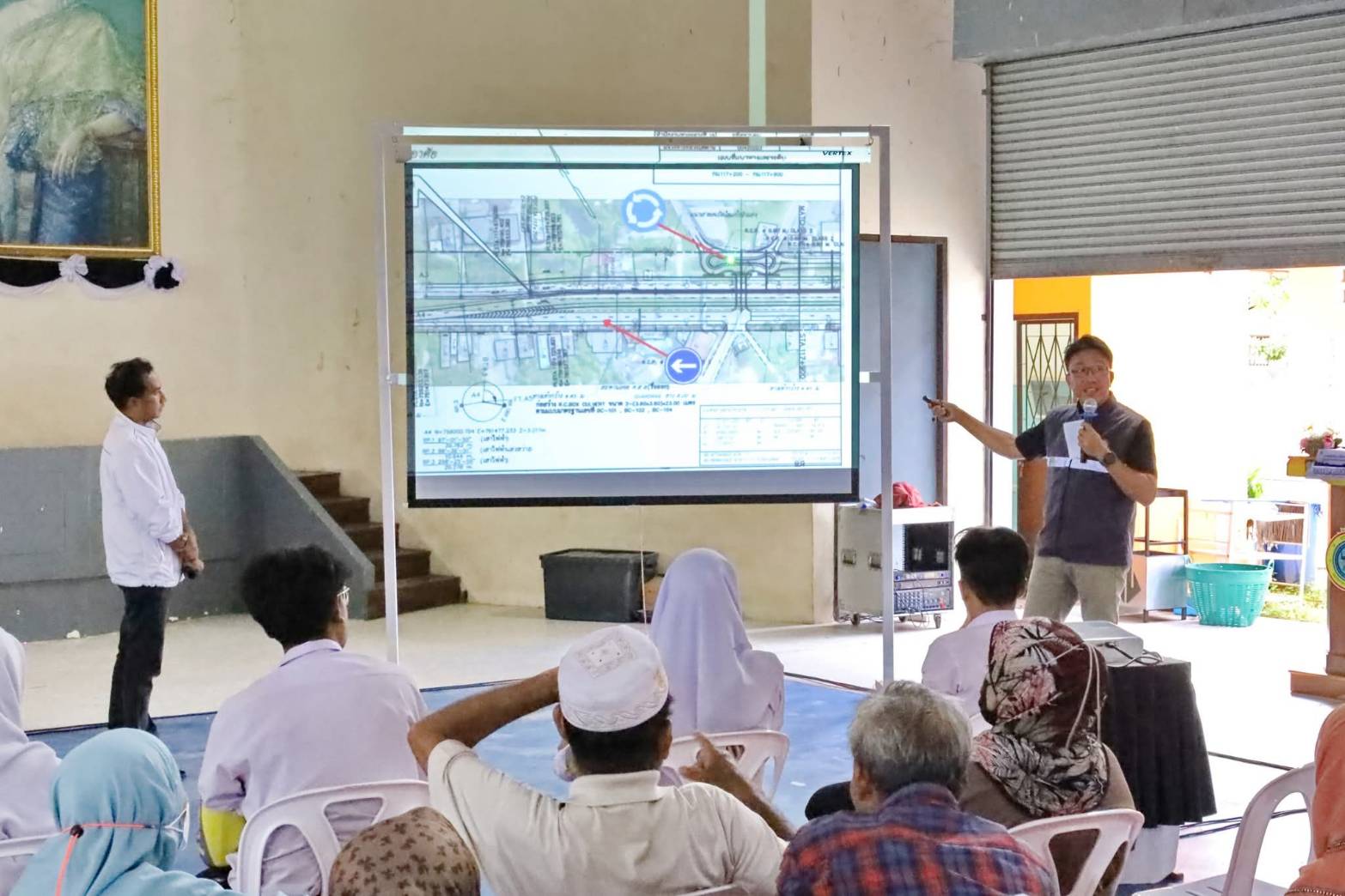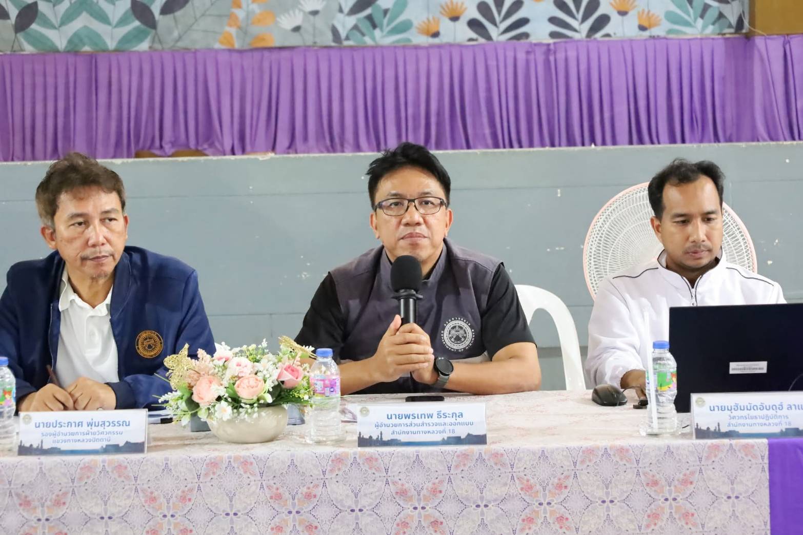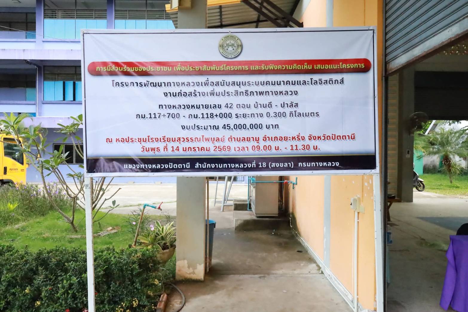 ?? ในการนี้ นายพรเทพ ธีระกุล ผู้อำนวยการส่วนสำรวจและออกแบบ สำนักงานทางหลวงที่ 18, นายประกาศ พุ่มสุวรรณ รองผู้อำนวยการฯ ฝ่ายวิศวกรรม, นายมูฮัมมัดอับดุฮ์ ลาเต๊ะ วิศวกรโยธาปฏิบัติการ และนายวิทยา หนิเจริญ นายช่างโยธาชำนาญงาน ร่วมเป็นวิทยากร บรรยายรูปแบบและรายละเอียดการก่อสร้างโครงการฯ, รับฟังความคิดเห็นและข้อเสนอแนะ และร่วมชี้แจงข้อซักถามด้วย โดยมี นายซาฟีอี กอเนาะ ปลัดอำเภอยะหริ่ง เป็นประธานในพิธีเปิด ณ หอประชุมโรงเรียนสุวรรณไพบูลย์ ตำบลยามู อำเภอยะหริ่ง จังหวัดปัตตานี
