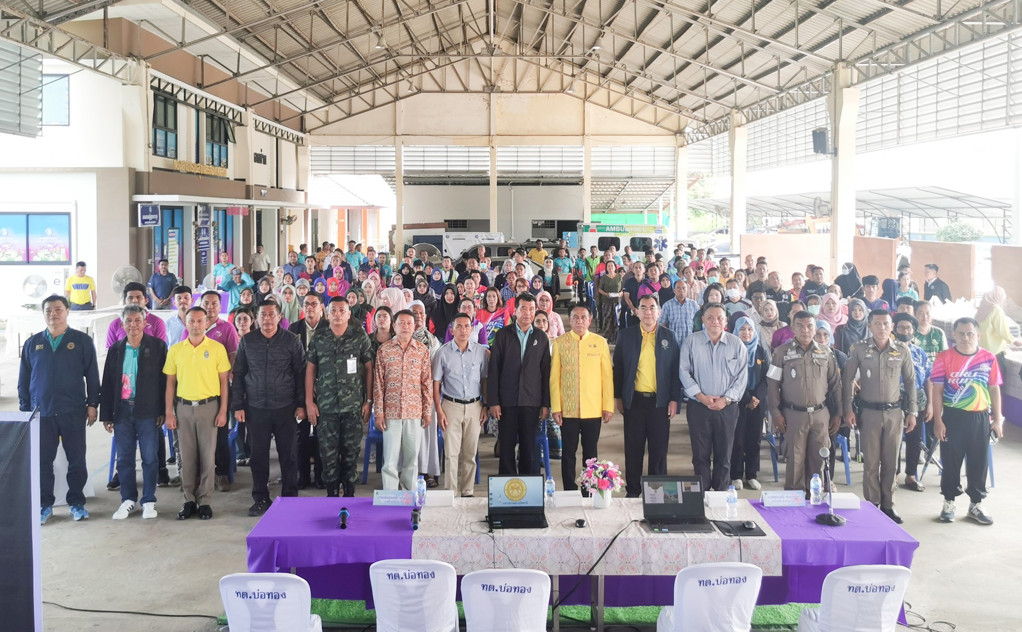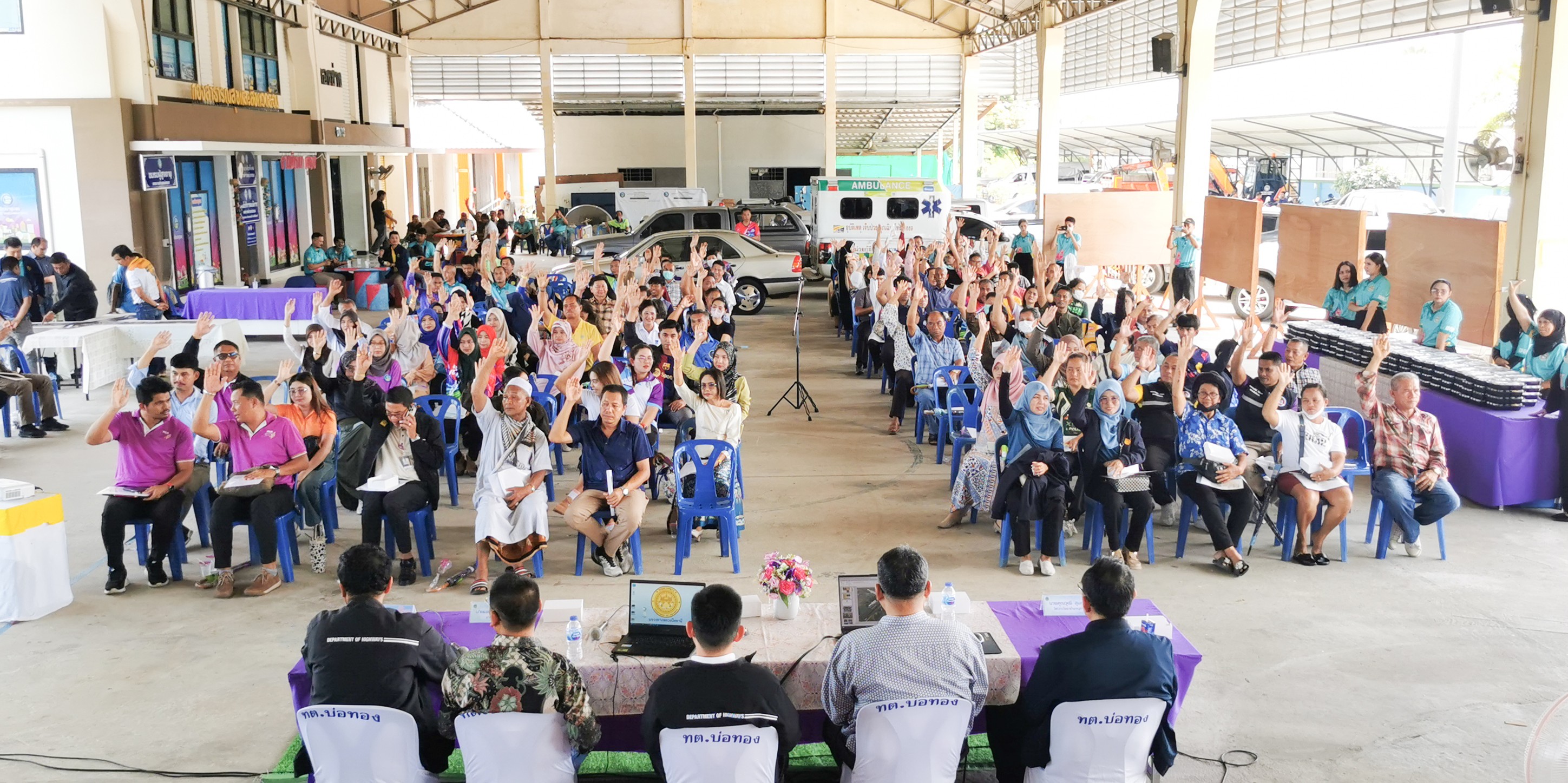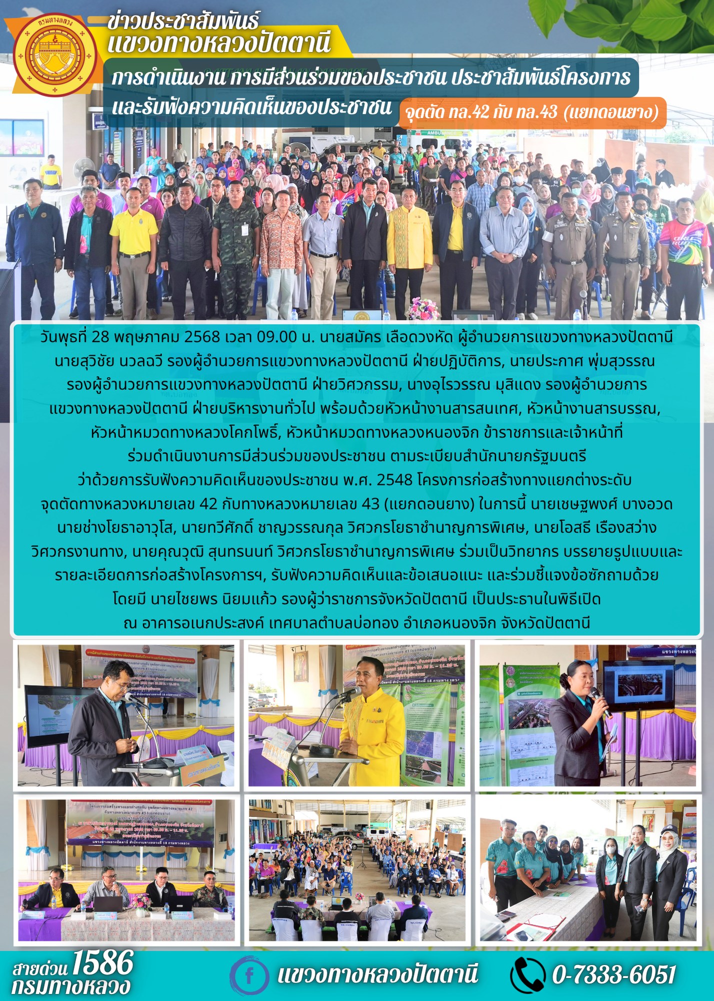 นายสุวิชัย นวลฉวี รองผู้อำนวยการแขวงทางหลวงปัตตานี ฝ่ายปฏิบัติการ, นายประกาศ พุ่มสุวรรณ รองผู้อำนวยการแขวงทางหลวงปัตตานี ฝ่ายวิศวกรรม, นางอุไรวรรณ มุสิแดง รองผู้อำนวยการแขวงทางหลวงปัตตานี ฝ่ายบริหารงานทั่วไป พร้อมด้วยหัวหน้างานสารสนเทศ, หัวหน้างานสารบรรณ, หัวหน้าหมวดทางหลวงโคกโพธิ์, หัวหน้าหมวดทางหลวงหนองจิก ข้าราชการและเจ้าหน้าที่ ร่วมดำเนินงานการมีส่วนร่วมของประชาชน ตามระเบียบสำนักนายกรัฐมนตรี ว่าด้วยการรับฟังความคิดเห็นของประชาชน พ.ศ. 2548 โครงการก่อสร้างทางแยกต่างระดับ