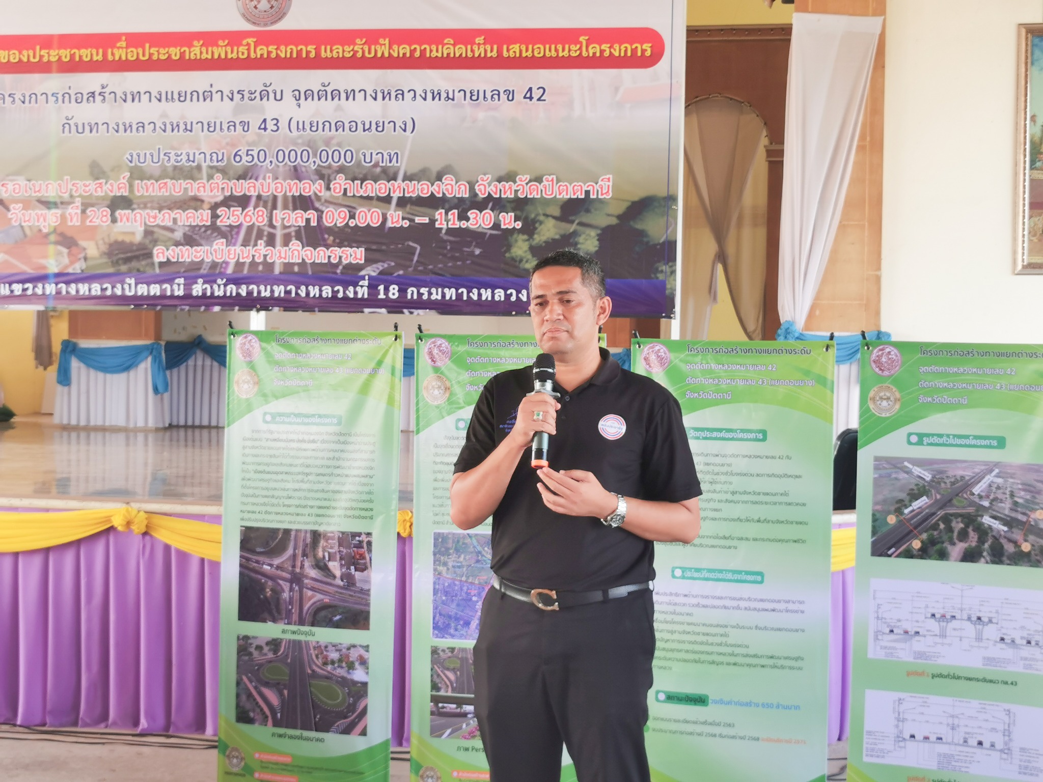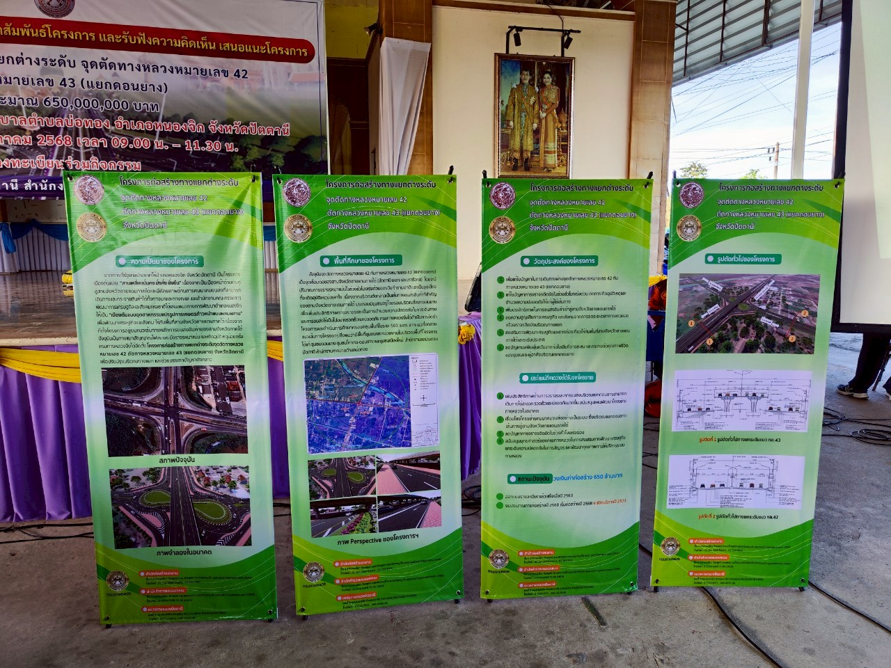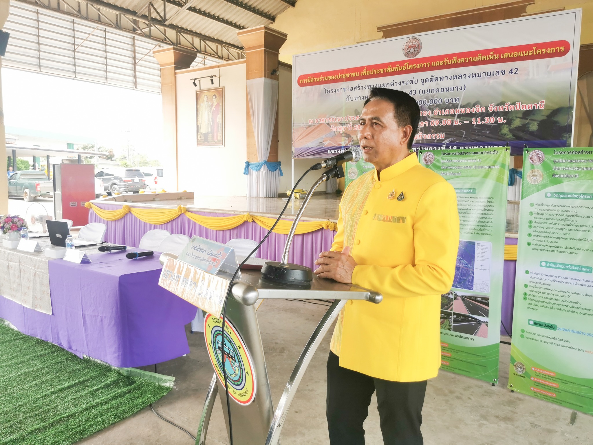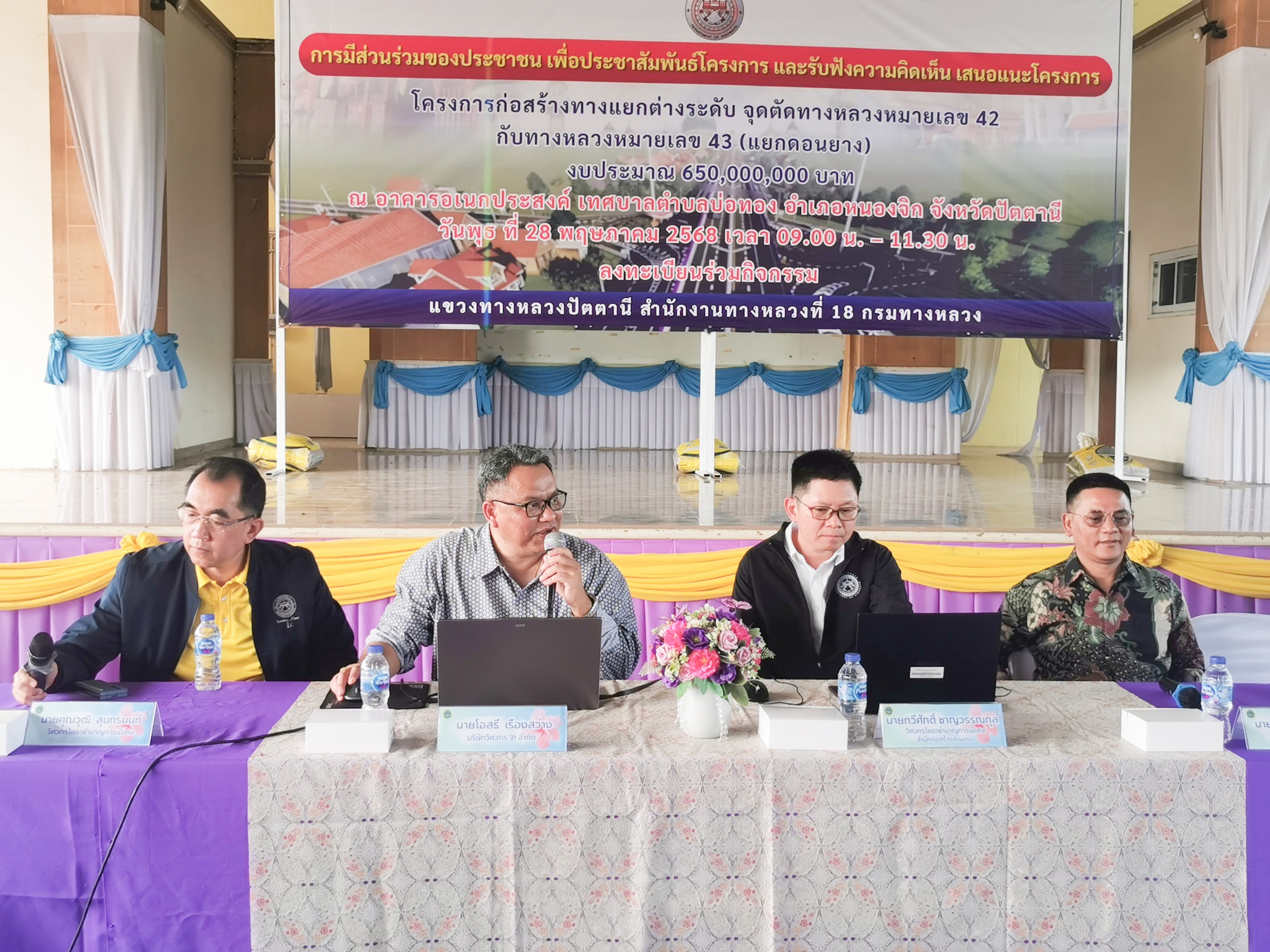 จุดตัดทางหลวงหมายเลข 42 กับทางหลวงหมายเลข 43 (แยกดอนยาง) ในการนี้ นายเชษฐพงศ์ บางอวด นายช่างโยธาอาวุโส, นายทวีศักดิ์ ชาญวรรณกุล วิศวกรโยธาชำนาญการพิเศษ, นายโอสธี เรืองสว่าง วิศวกรงานทาง, นายคุณวุฒิ สุนทรนนท์ วิศวกรโยธาชำนาญการพิเศษ ร่วมเป็นวิทยากร บรรยายรูปแบบและรายละเอียดการก่อสร้างโครงการฯ, รับฟังความคิดเห็นและข้อเสนอแนะ และร่วมชี้แจงข้อซักถามด้วย โดยมี นายไชยพร นิยมแก้ว รองผู้ว่าราชการจังหวัดปัตตานี เป็นประธานในพิธีเปิด ณ อาคารอเนกประสงค์ เทศบาลตำบลบ่อทอง อำเภอหนองจิก จังหวัดปัตตานี
