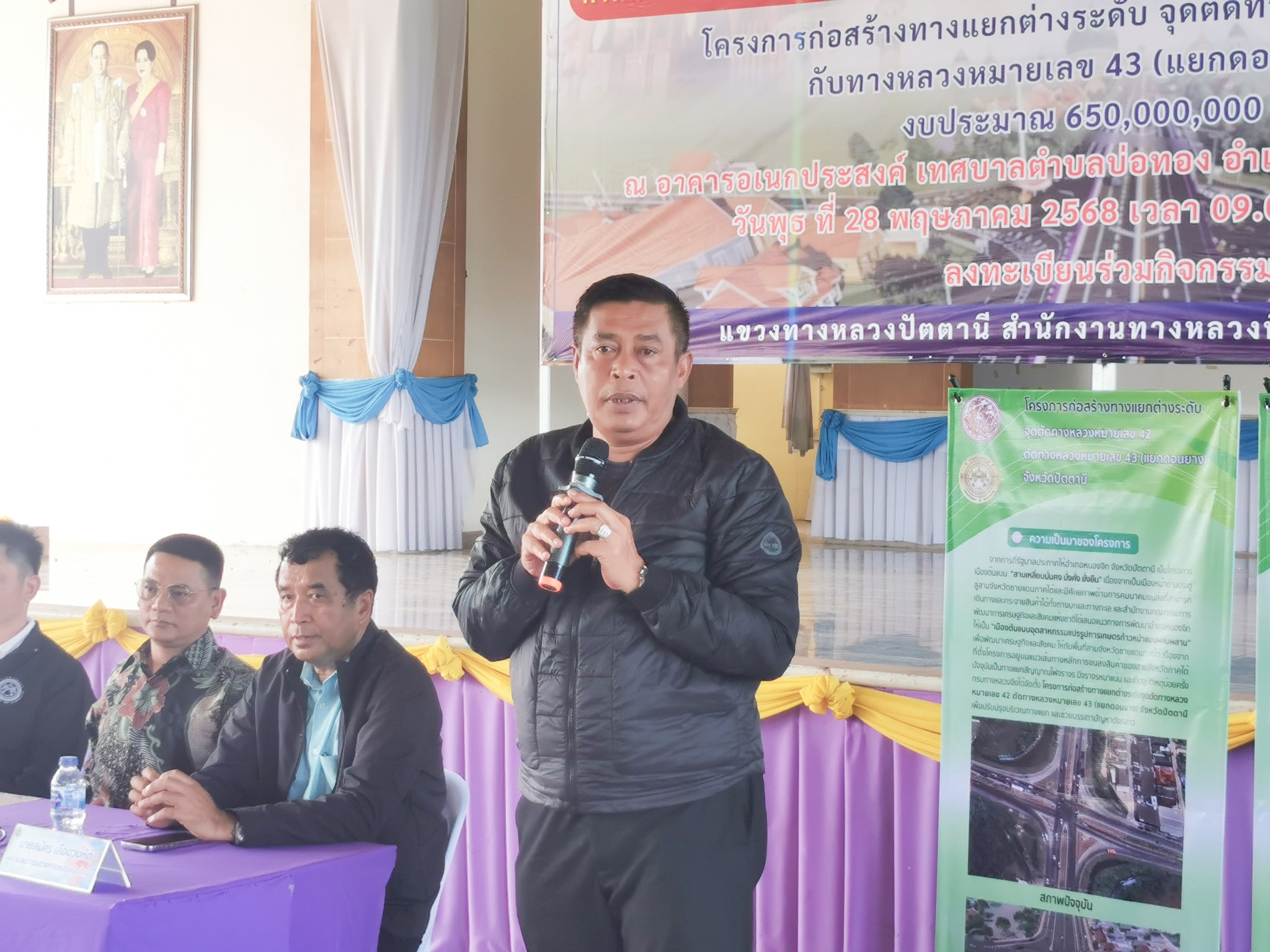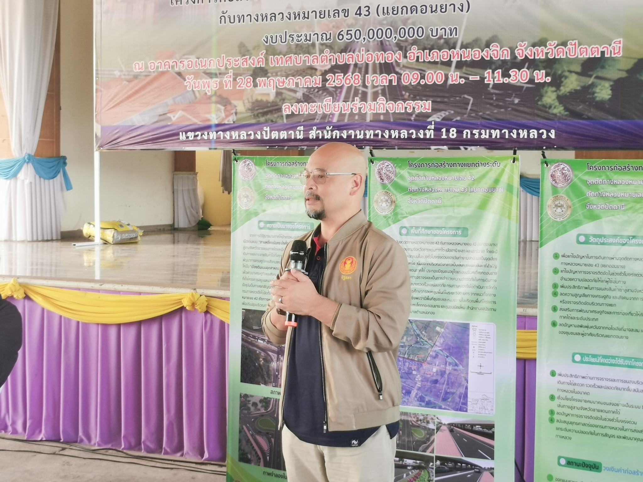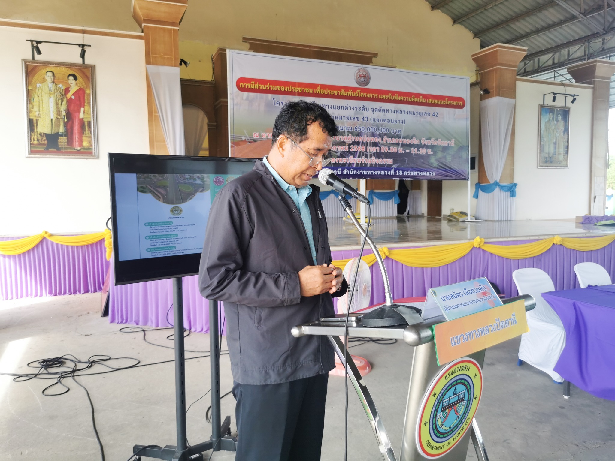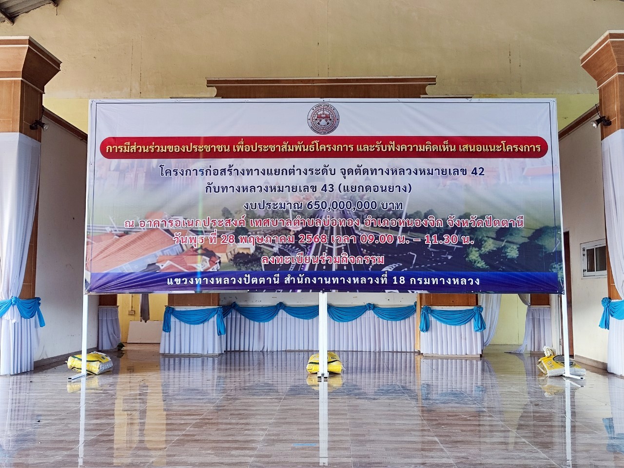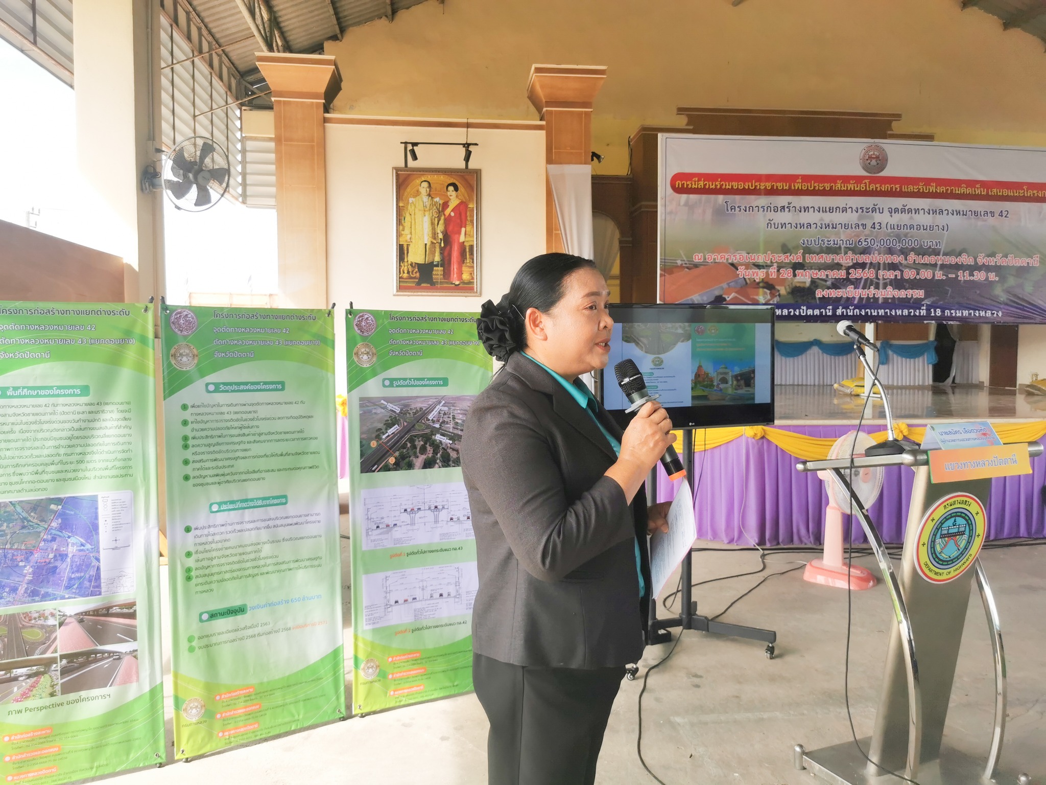 จุดตัดทางหลวงหมายเลข 42 กับทางหลวงหมายเลข 43 (แยกดอนยาง) ในการนี้ นายเชษฐพงศ์ บางอวด นายช่างโยธาอาวุโส, นายทวีศักดิ์ ชาญวรรณกุล วิศวกรโยธาชำนาญการพิเศษ, นายโอสธี เรืองสว่าง วิศวกรงานทาง, นายคุณวุฒิ สุนทรนนท์ วิศวกรโยธาชำนาญการพิเศษ ร่วมเป็นวิทยากร บรรยายรูปแบบและรายละเอียดการก่อสร้างโครงการฯ, รับฟังความคิดเห็นและข้อเสนอแนะ และร่วมชี้แจงข้อซักถามด้วย โดยมี นายไชยพร นิยมแก้ว รองผู้ว่าราชการจังหวัดปัตตานี เป็นประธานในพิธีเปิด ณ อาคารอเนกประสงค์ เทศบาลตำบลบ่อทอง อำเภอหนองจิก จังหวัดปัตตานี