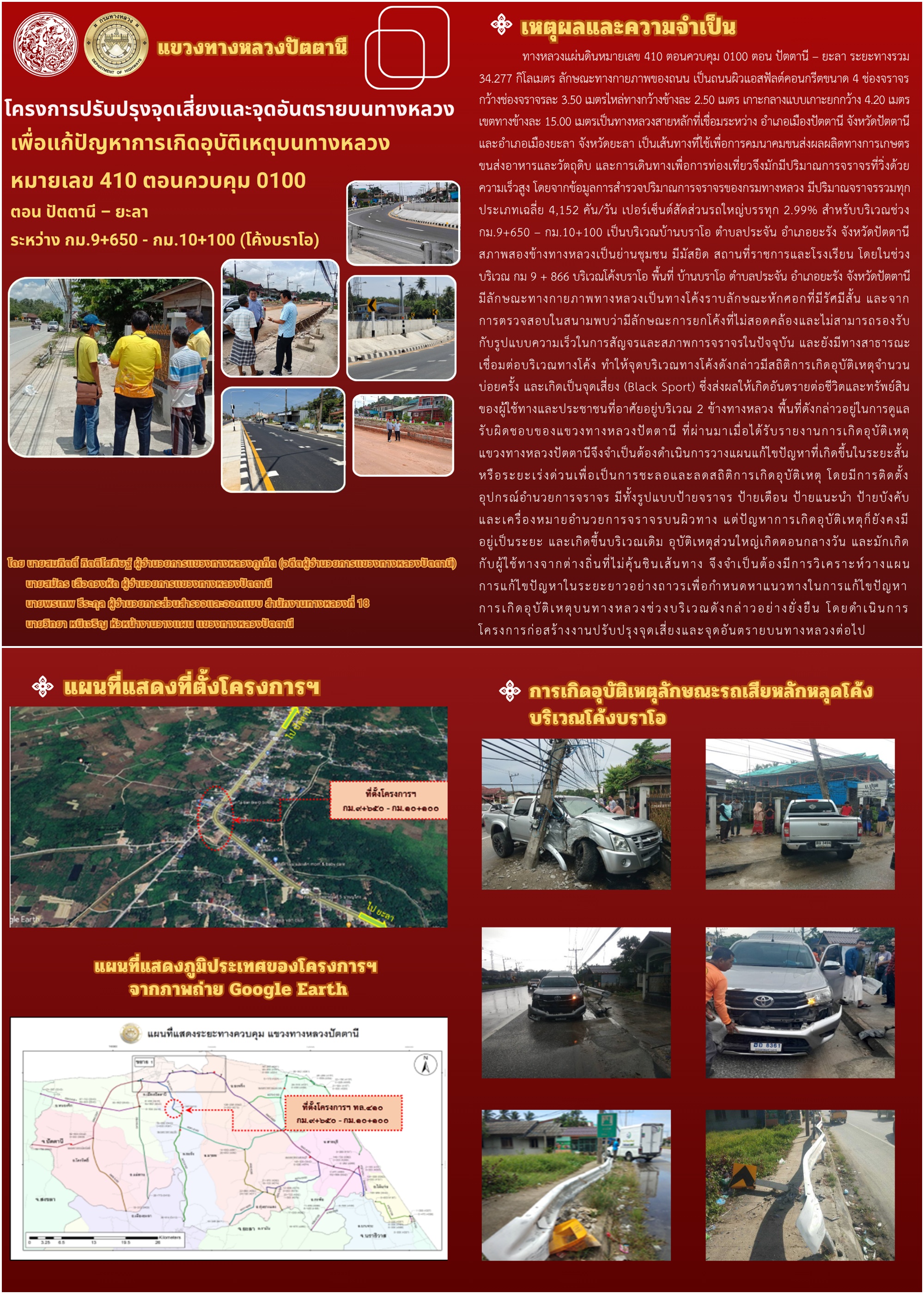 ข้อมูลข่าว : โครงการปรับปรุงจุดเสี่ยง และจุดอันตรายบนทางหลวง เพื่อแก้ไขปัญหาการเกิดอุบัติเหตุบนทางหลวง หมายเลข 410 ตอนควบคุม 0100 ตอน ปัตตานี - ยะลา ระหว่าง กม.9+650 - กม.10+100 (โค้งบราโอ)