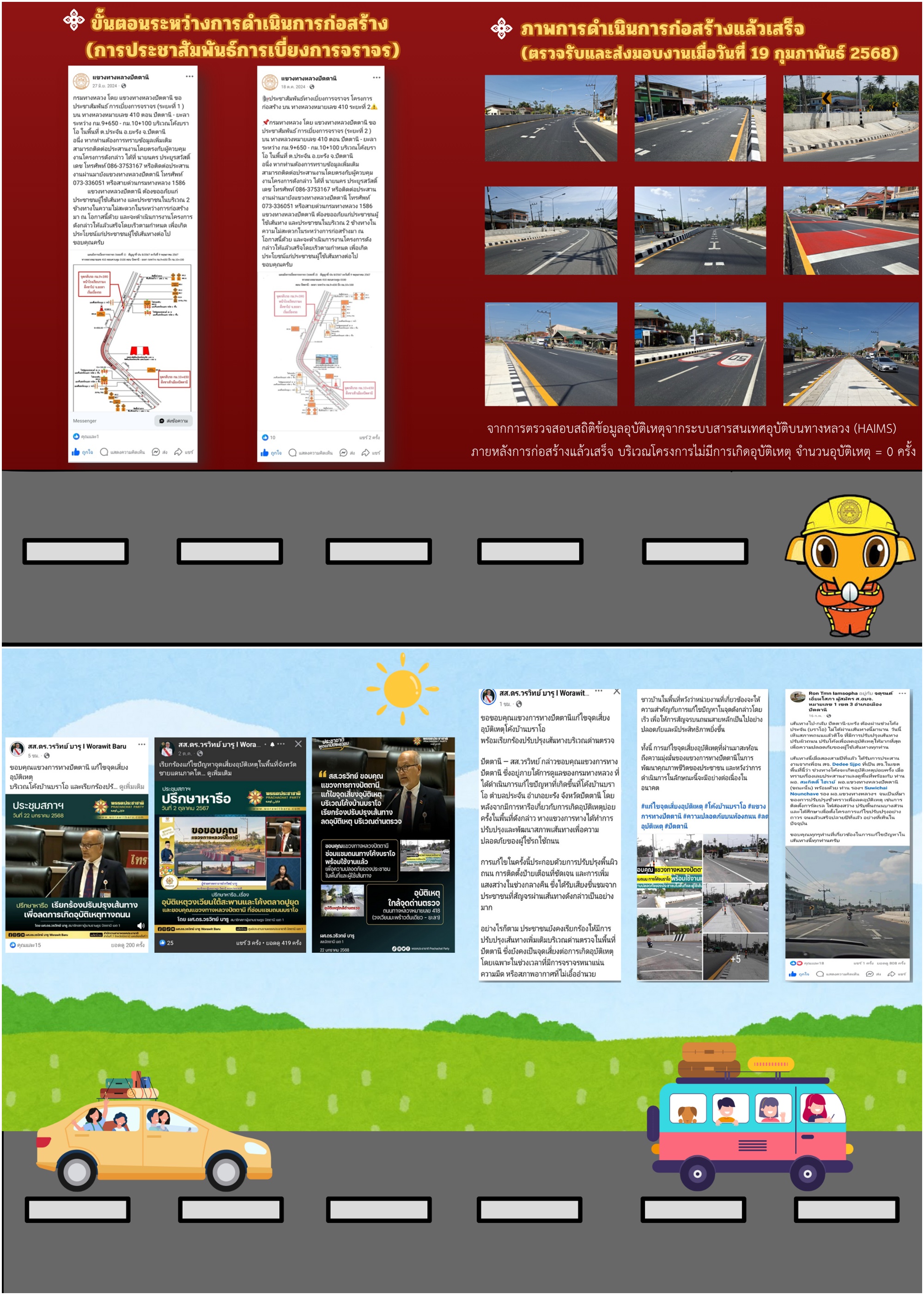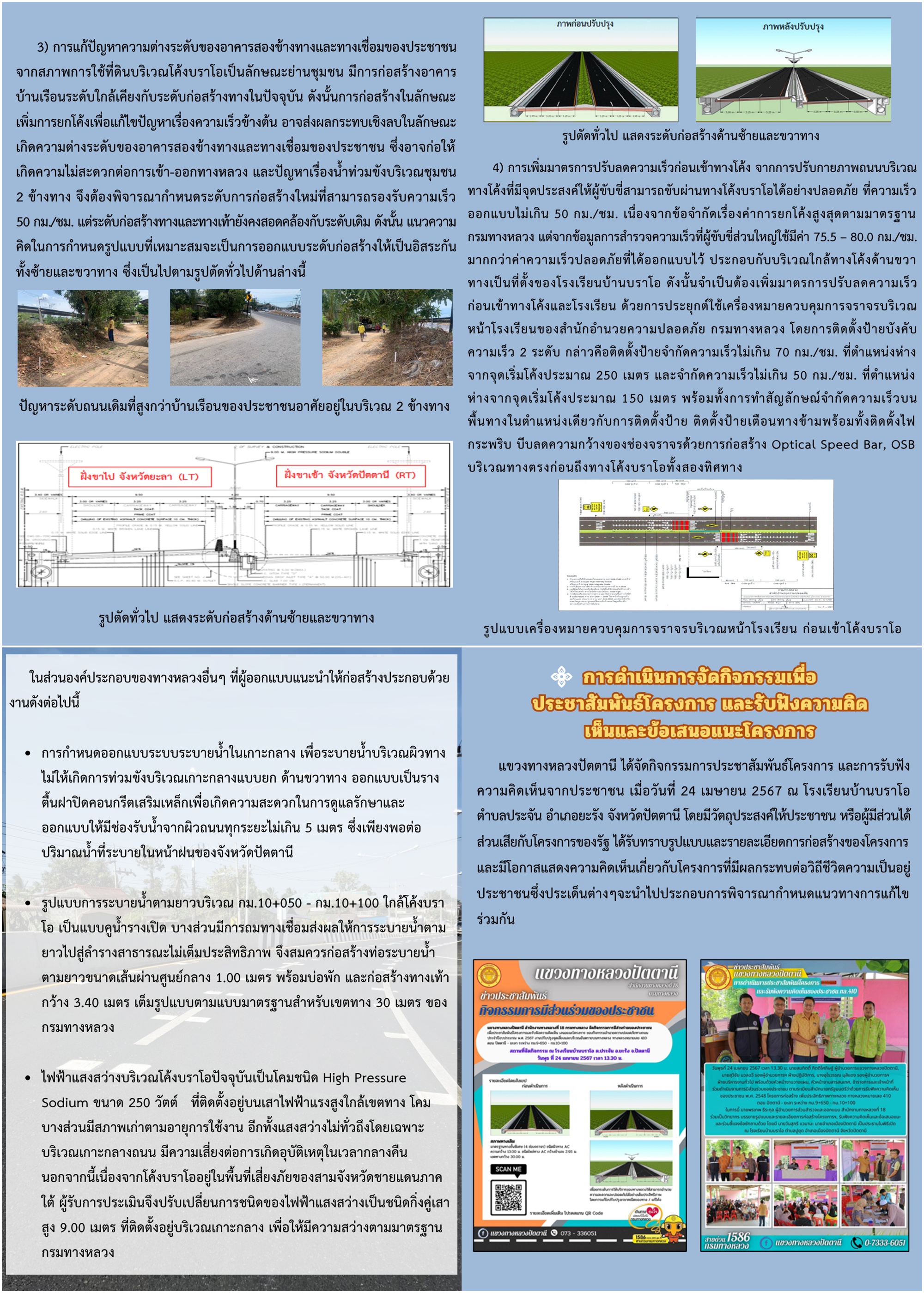 แขวงทางหลวงปัตตานี ดำเนินการก่อสร้างแล้วเสร็จ โครงการปรับปรุงจุดเสี่ยง และจุดอันตรายบนทางหลวง เพื่อแก้ไขปัญหาการเกิดอุบัติเหตุบนทางหลวง หมายเลข 410 ตอนควบคุม 0100 ตอน ปัตตานี - ยะลา ระหว่าง กม.9+650 - กม.10+100 (โค้งบราโอ) พื้นที่ตำบลประจัน อำเภอยะรัง