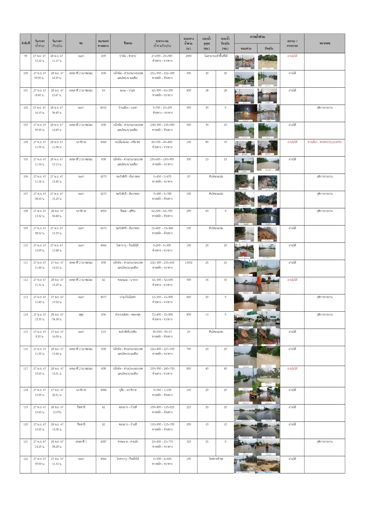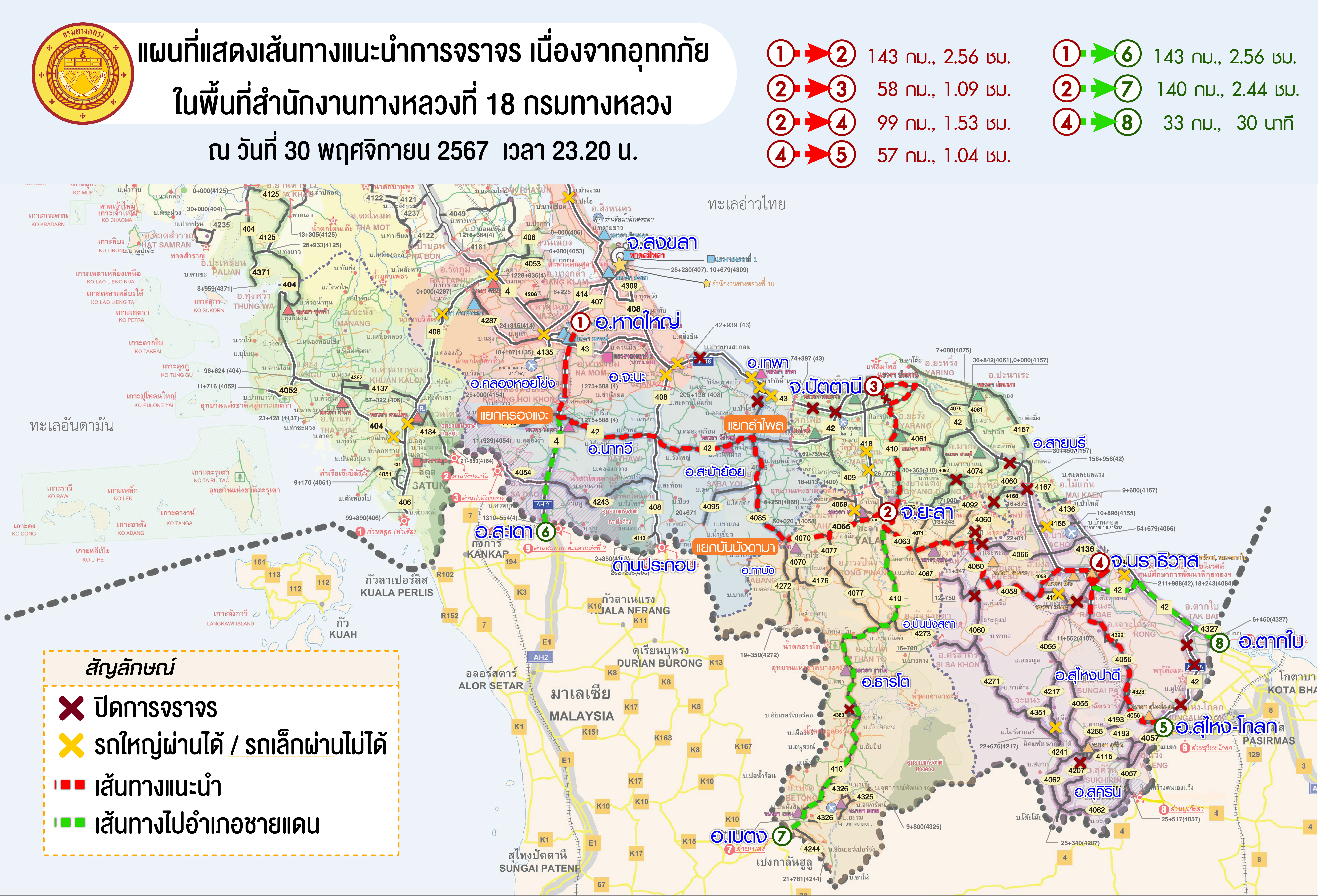 แขวงทางหลวงนราธิวาส ขอรายงานสถานการณ์อุทกภัยในพื้นที่จังหวัดนราธิวาส วันเวลาที่ update วันที่ 30 พ.ย. 67 เวลา 16.00 น.