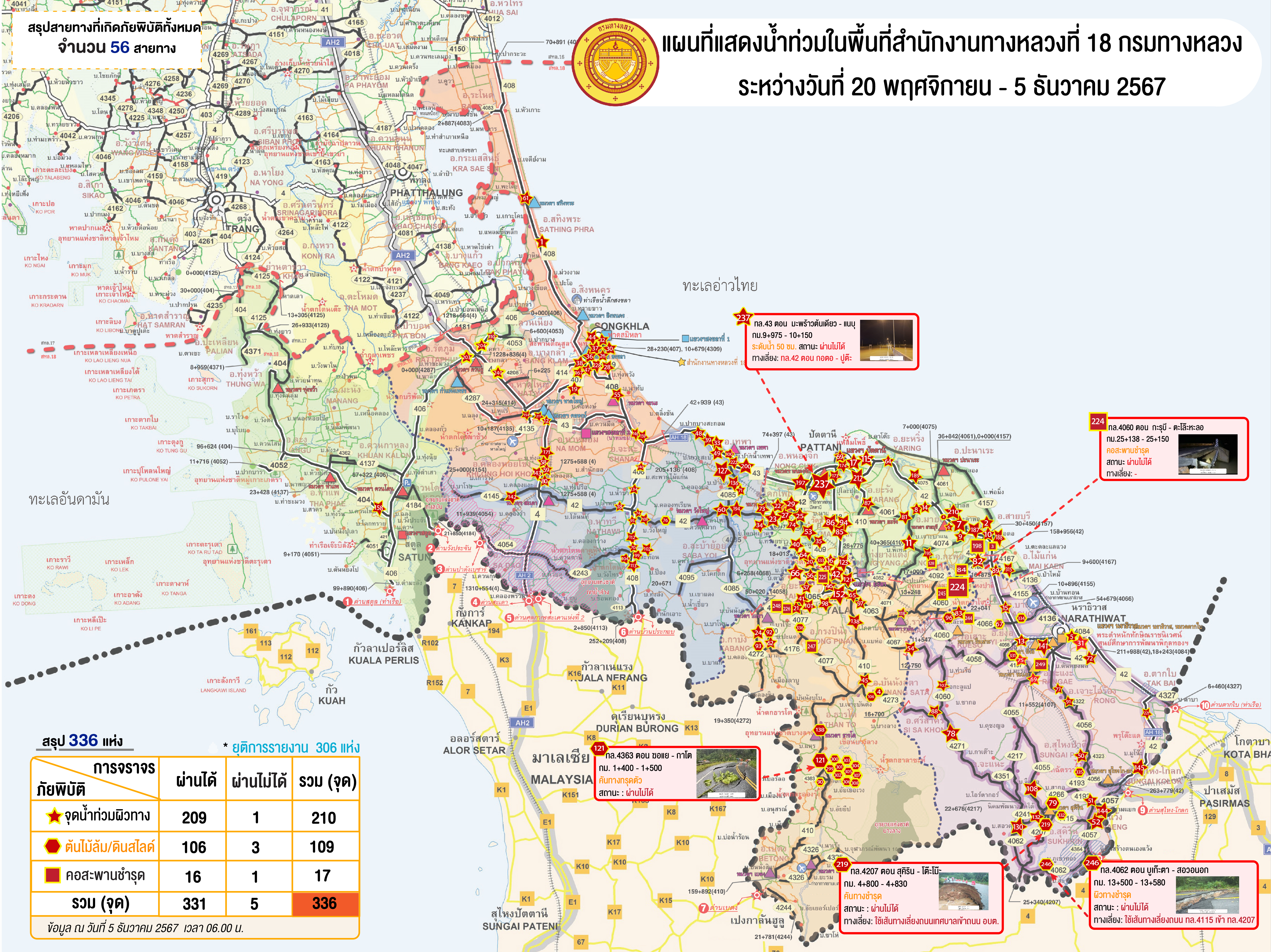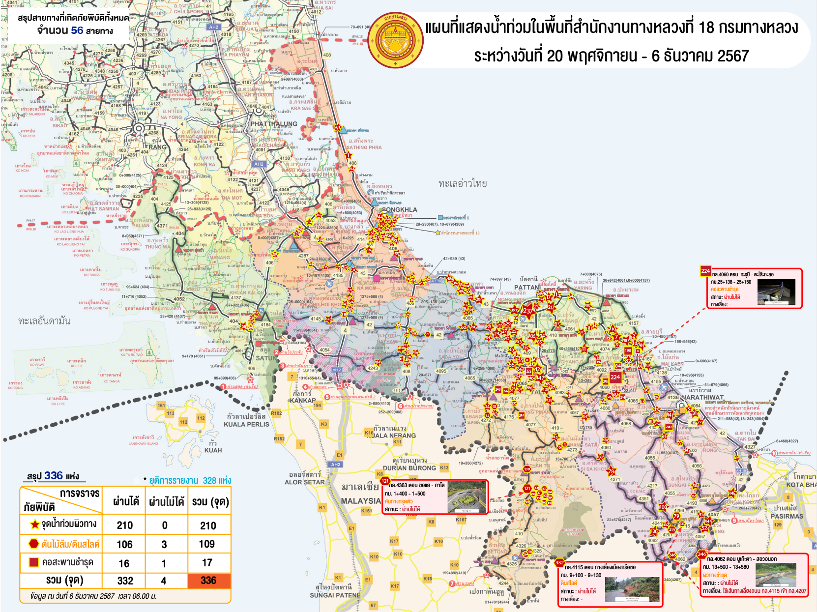 แผนที่แสดงเส้นทางแนะนำการจราจร เนื่องจากอุทกภัยในพื้นที่สำนักงานทางหลวงที่ 18 ข้อมูล ณ วันที่ 6 ธันวาคม 2567 เวลา 07.00 น.