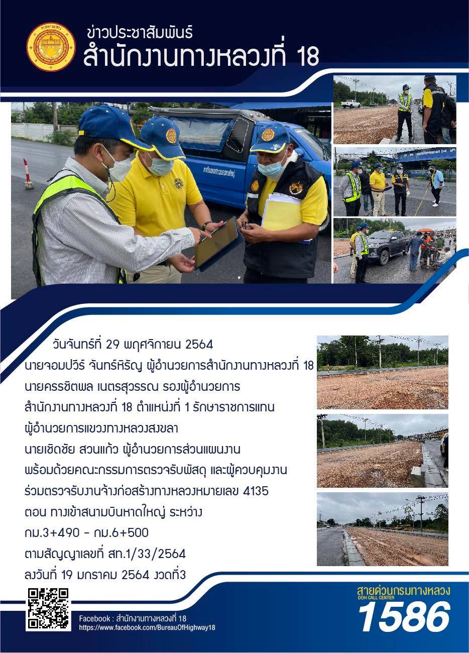 วันจันทร์ที่ 29 พฤศจิกายน 2564 นายจอมปวีร์ จันทร์หิรัญ ผู้อำนวยการสำนักงานทางหลวงที่ 18 นายครรชิตพล เนตรสุวรรณ รองผู้อำนวยการสำนักงานทางหลวงที่ 18 ตำแหน่งที่ 1 รักษาราชการแทนผู้อำนวยการแขวงทางหลวงสงขลา นายเชิดชัย สวนแก้ว ผู้อำนวยการส่วนแผนงาน พร้อมด้วยคณะกรรมการตรวจรับพัสดุ และผู้ควบคุมงาน ร่วมตรวจรับงานจ้างก่อสร้างทางหลวงหมายเลข 4135 ตอนทางเข้าสนามบินหาดใหญ่ ระหว่าง กม.3+490 - กม.6+500 ตามสัญญาเลขที่ สท.1/33/2564 ลงวันที่ 19 มกราคม 2564 งวดที่3