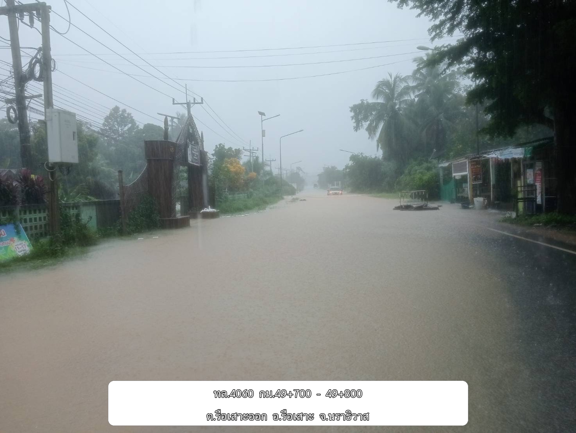 วันที่ 27 พฤศจิกายน 2567 เวลา 11.05 น. รายงานสถานการณ์น้ำท่วม หมายเลขทางหลวง 4060 ตอน ตะโล๊ะหะลอ - ศรีสาคร ช่วง กม. 49+700 ถึง 49+800 เนื่องจากฝนตกหนักน้ำไหลผ่านอย่างรวดเร็วทำให้เกิดน้ำท่วมถนน ปริมาณระดับน้ำ 60 เซ็นติเมตร การจราจรไม่สามารถผ่านได้ ทั้งนี้ แขวงทางหลวงนราธิวาส ได้ดำเนินการติดตั้งป้ายเตือนจราจรผู้ใช้เส้นทาง เพื่ออำนวยความสะดวก