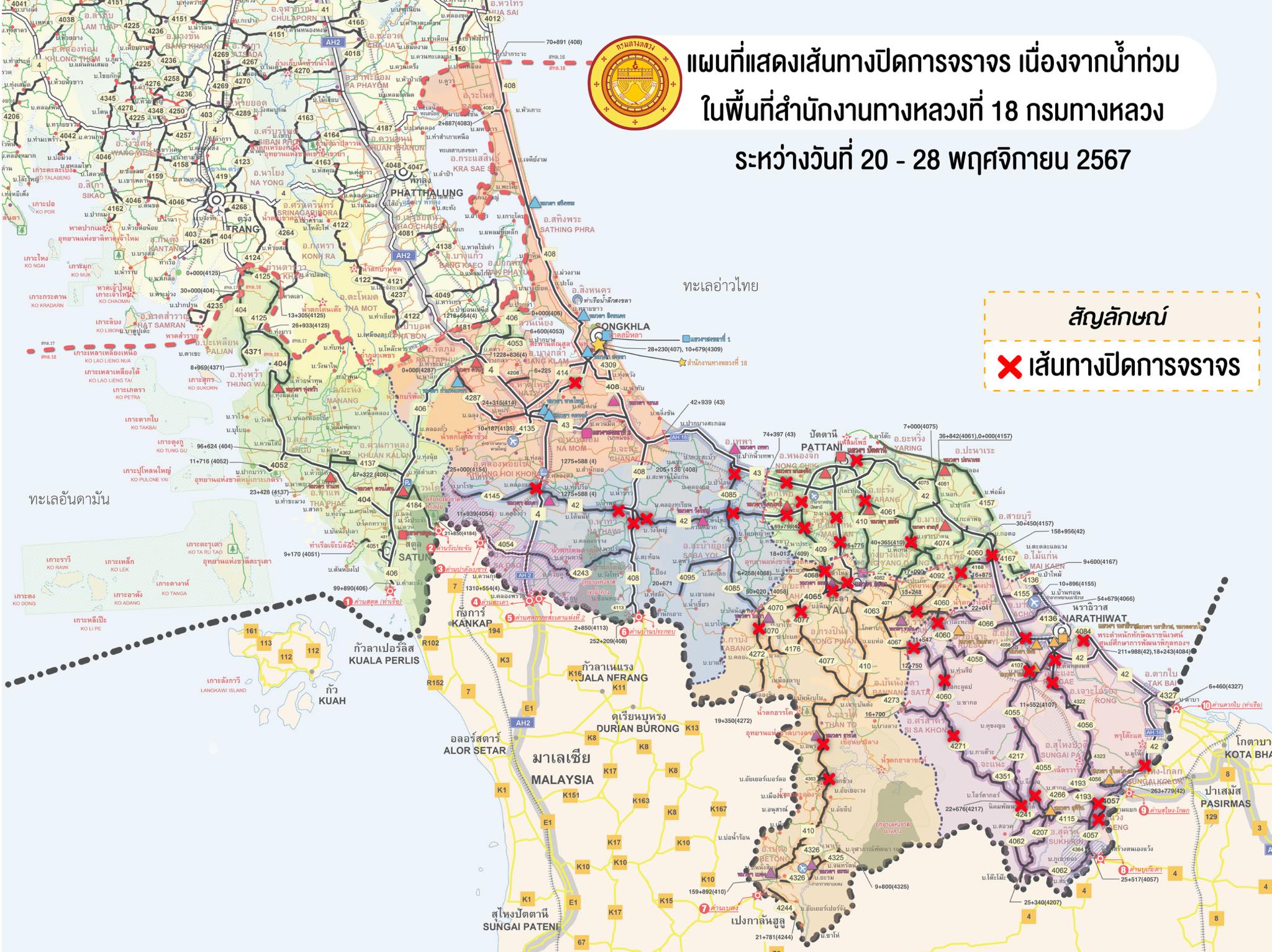 แผนที่แสดงเส้นทางปิดการจราจร เนื่องจากน้ำท่วม ในพื้นที่สำนักงานทางหลวงที่ 18 ระหว่างวันที่ 20-28 พฤศจิกายน 2567