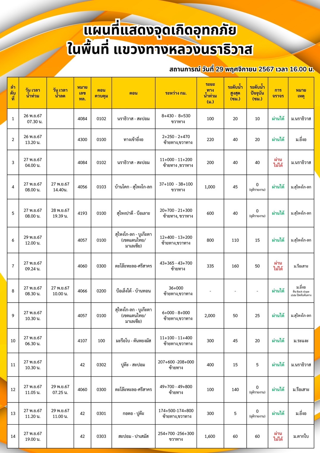 ข้อมูลข่าว : แผนที่แสดงจุดเกิดอุทกภัยในพื้นที่แขวงทางหลวงนราธิวาส ข้อมูล ณ วันที่ 26-29 พฤศจิกายน 2567 เวลา 16.00 น.