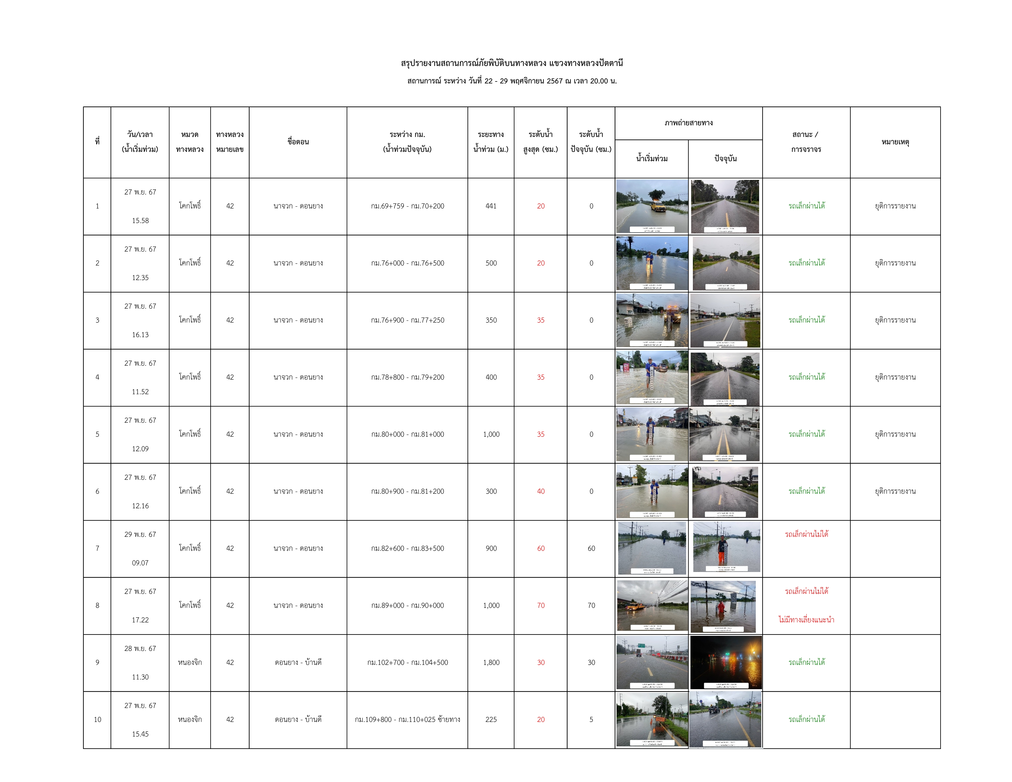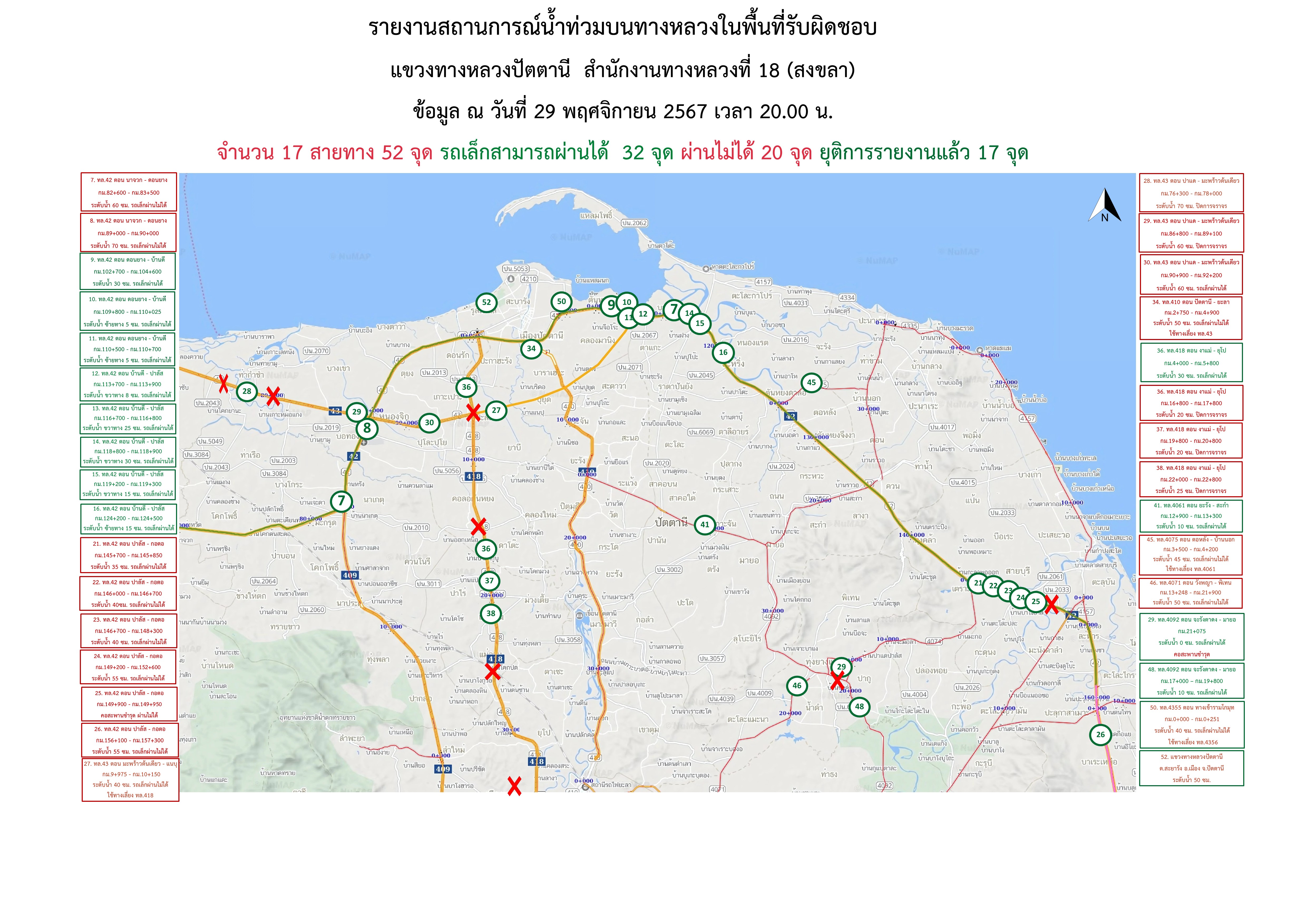 รายงานสถานการณ์น้ำท่วมในพื้นที่แขวงทางหลวงปัตตานี ข้อมูล ณ วันที่ 29 พฤศจิกายน 2567 เวลา 20.00 น.