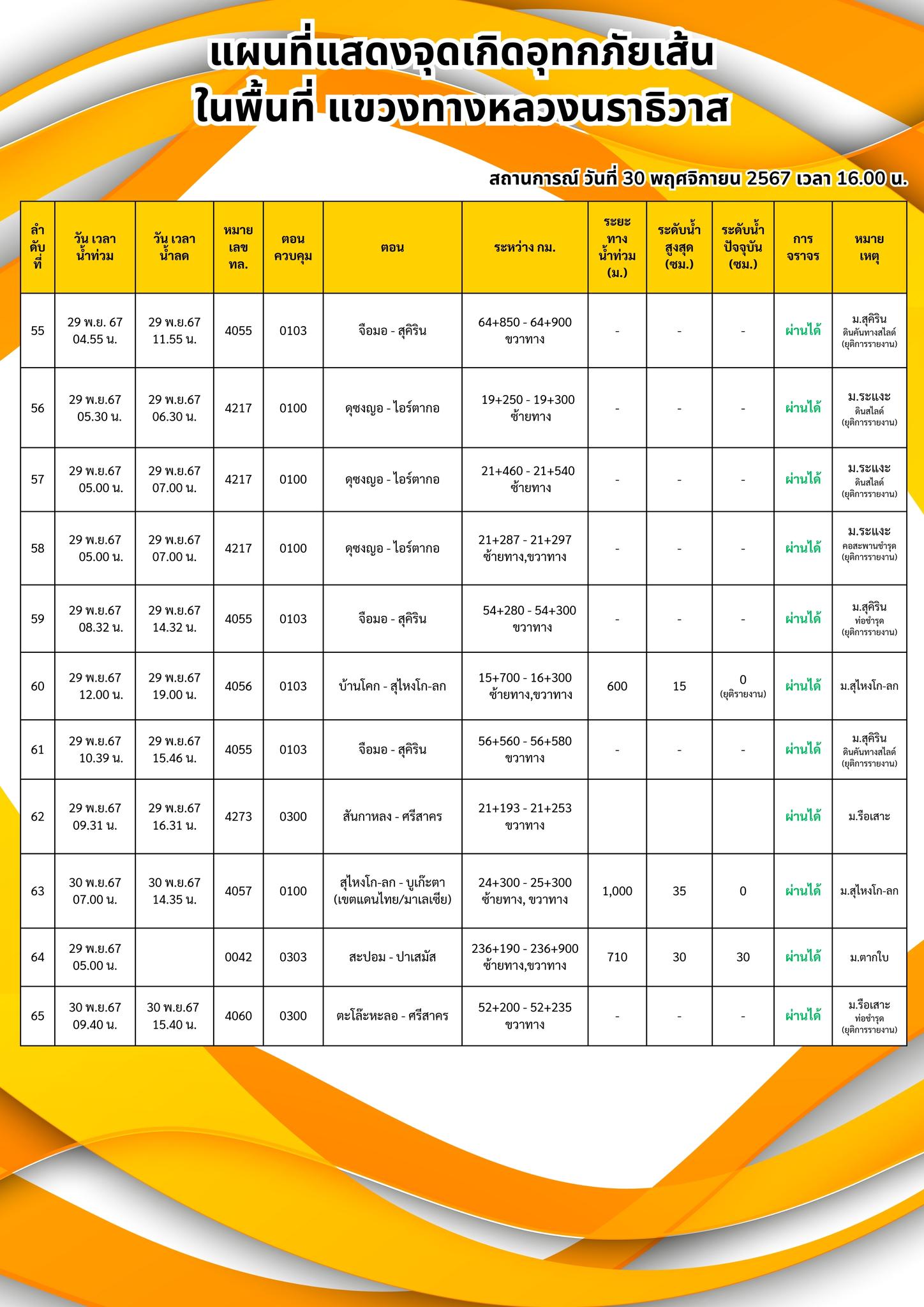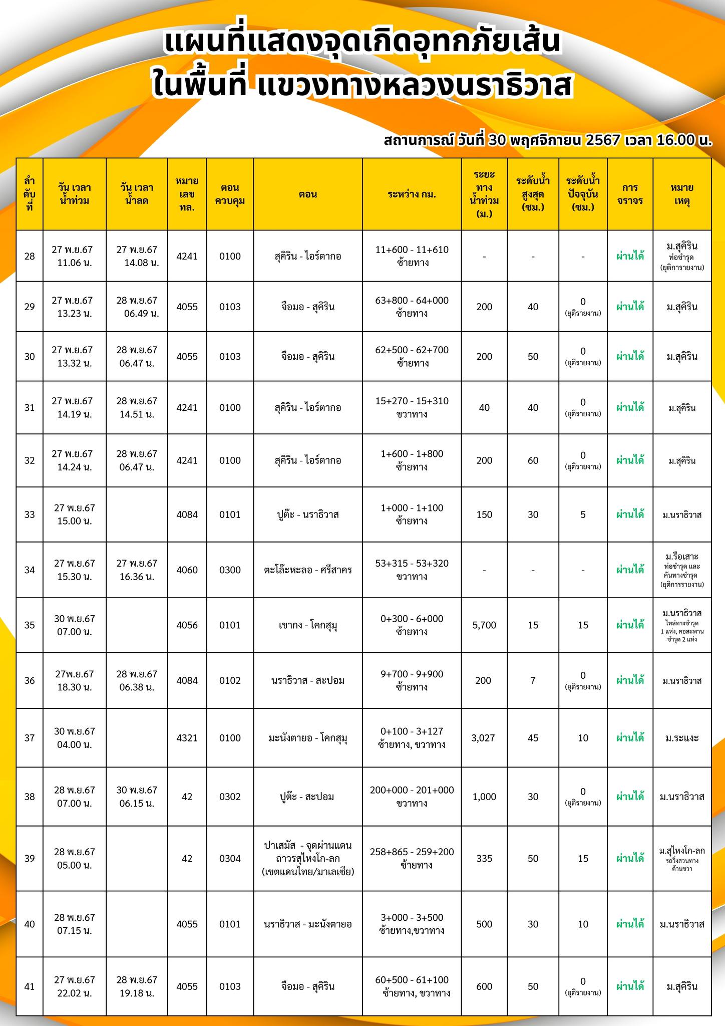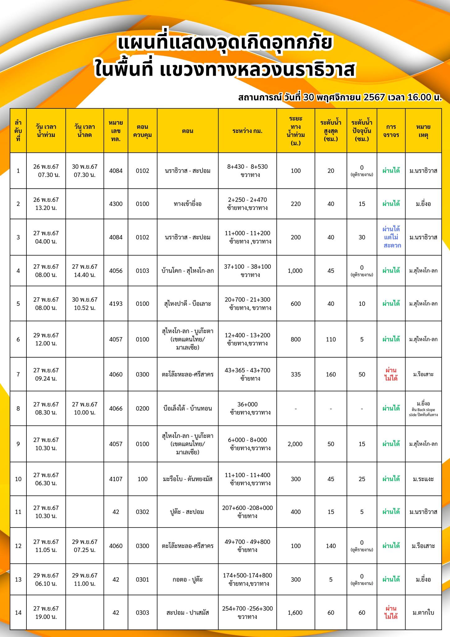 แขวงทางหลวงนราธิวาส ขอรายงานสถานการณ์อุทกภัยในพื้นที่จังหวัดนราธิวาส วันเวลาที่ update วันที่ 30 พ.ย. 67 เวลา 16.00 น.