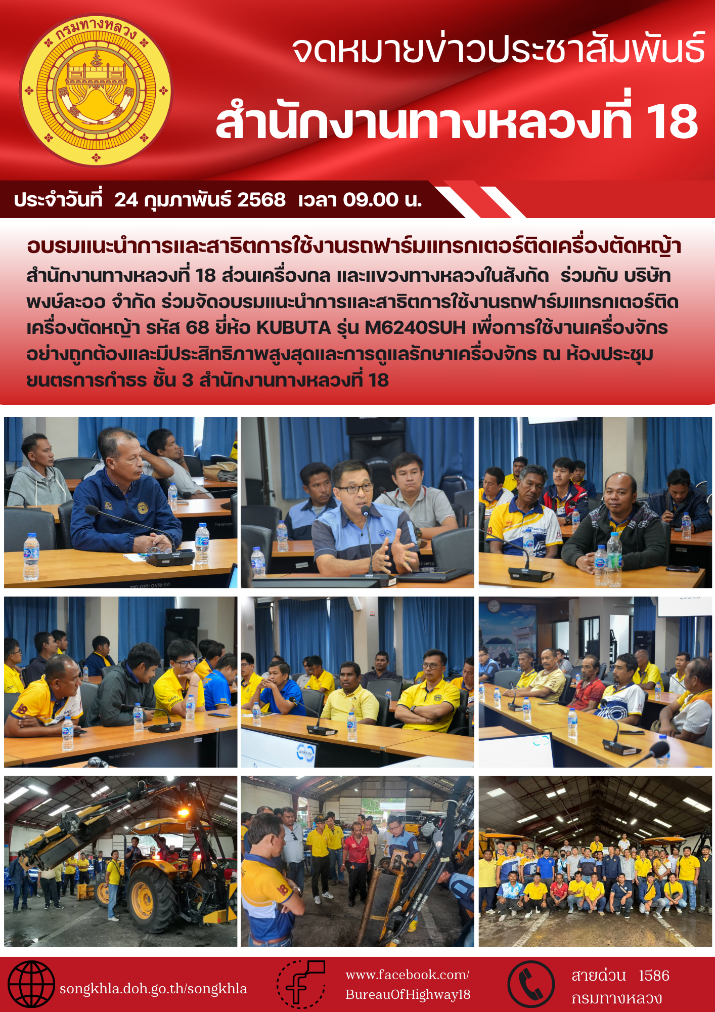 วันจันทร์ที่ 24 กุมภาพันธ์ 2568 เวลา 09.00 น. สำนักงานทางหลวงที่ 18 ส่วนเครื่องกล และแขวงทางหลวงในสังกัด ร่วมกับ บริษัท พงษ์ละออ จำกัด ร่วมจัดอบรมแนะนำการและสาธิตการใช้งานรถฟาร์มแทรกเตอร์ติดเครื่องตัดหญ้า รหัส 68 ยี่ห้อ KUBUTA รุ่น M6240SUH เพื่อการใช้งานเครื่องจักรอย่างถูกต้องและมีประสิทธิภาพสูงสุดและการดูแลรักษาเครื่องจักร ณ ห้องประชุมยนตรการกำธร ชั้น 3 สำนักงานทางหลวงที่ 18