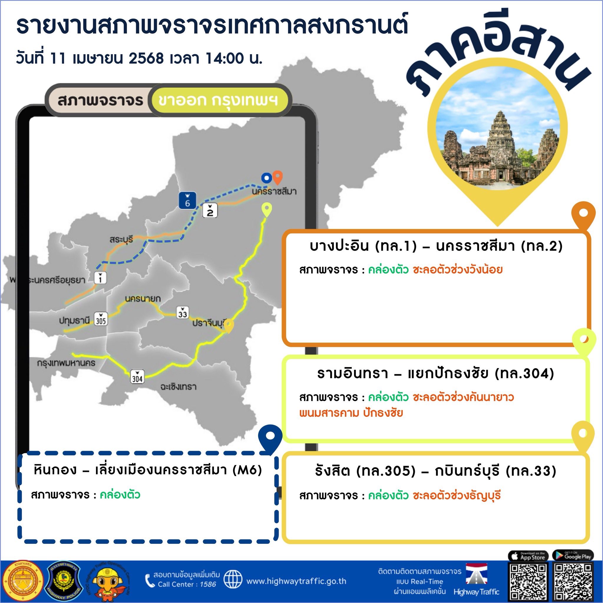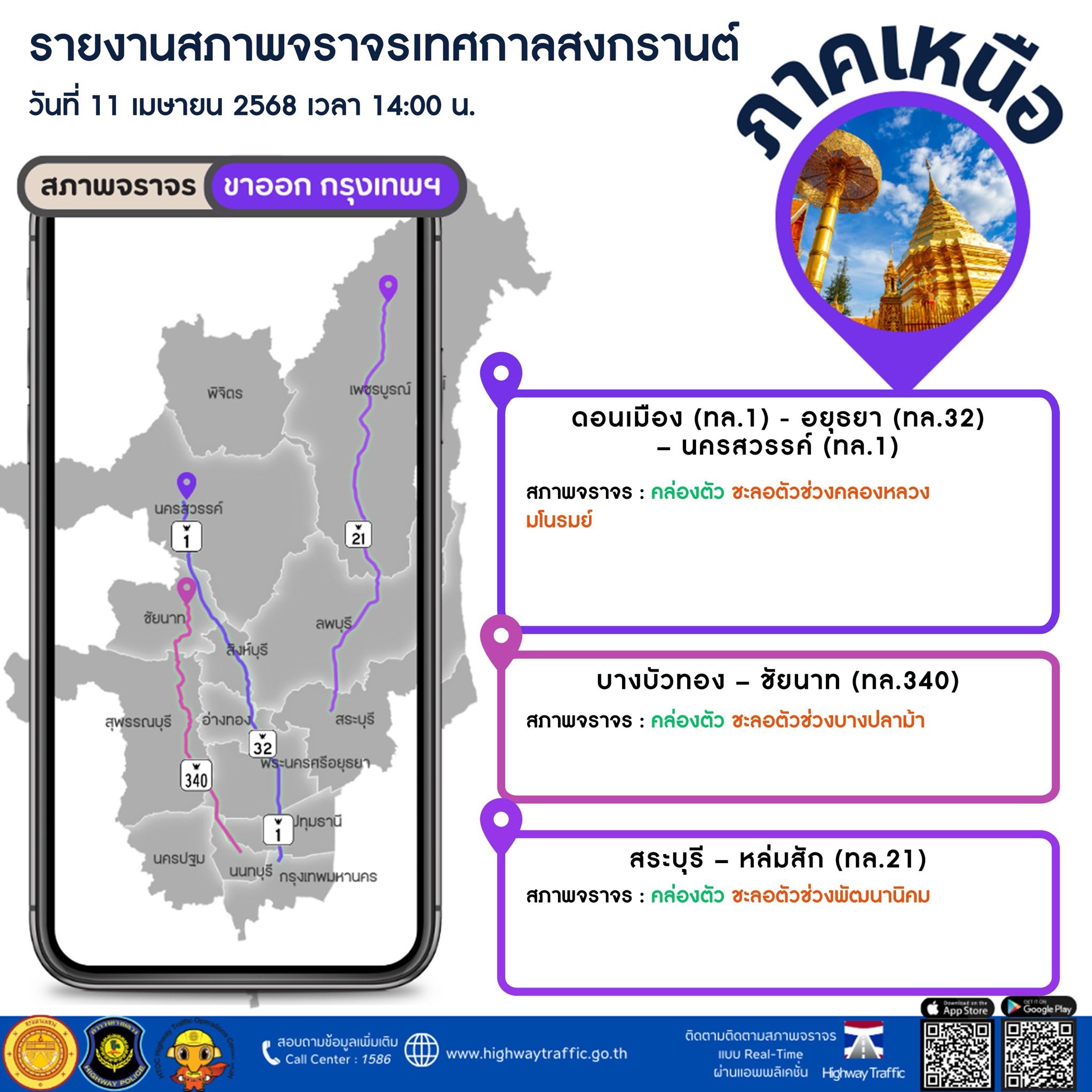 แอปดูรถติด Highway Traffic เป็นแอปพลิเคชันที่พัฒนา โดยกรมทางหลวง กระทรวงคมนาคม มีประโยชน์อย่างมากสำหรับผู้ใช้ที่ต้องการเช็คสภาพจราจรบนทางหลวงโดย เฉพาะช่วงเทศกาลสงกรานต์ปีนี้ สามารถเช็คได้แบบเรียลไทม์ จะเลือกเช็คเส้นทางจราจรเป็นแบบแผนที่ หรือผ่านภาพจากกล้องวงจรปิด (CCTV) กว่า 100 ตัว บนถนนทางหลวงสายหลักกระจายอยู่ทั่วทั้งประเทศ พร้อมบอก ความเร็วเฉลี่ยบนถนนเส้นนั้น นอกจากนี้คุณยังสามารถเช็คจุดบริการทางหลวง จุดจอดแวะพักระหว่างทาง เพื่อให้ผู้ใช้รถบนทางหลวงได้รับความสะดวกมากที่สุด