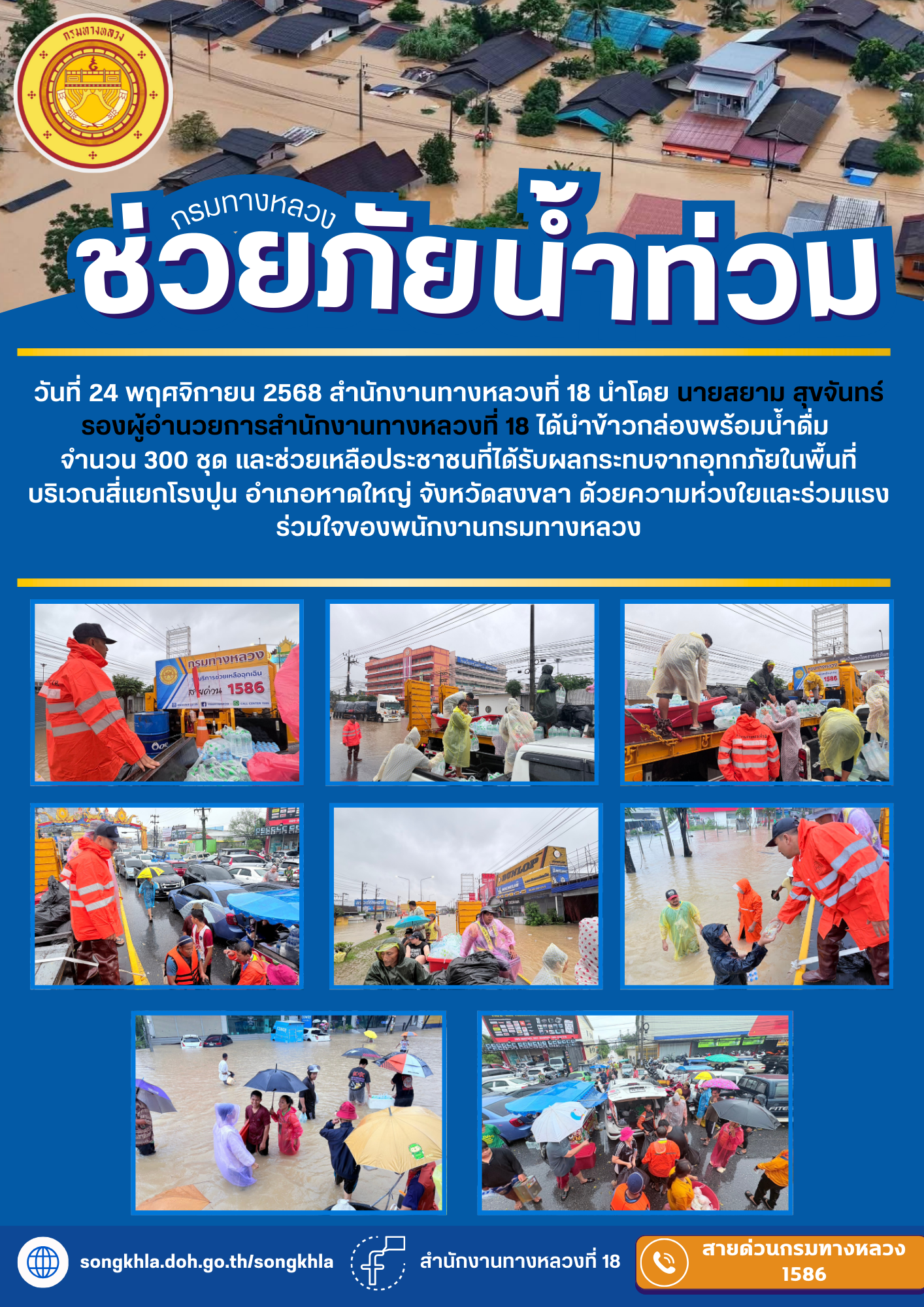 วันที่ 24 พฤศจิกายน 2568 สำนักงานทางหลวงที่ 18 นำโดยนายสยาม สุขจันทร์ รองผู้อำนวยการสำนักงานทางหลวงที่ 18 ได้นำข้าวกล่องพร้อมน้ำดื่ม จำนวน 300 ชุด และช่วยเหลือประชาชนที่ได้รับผลกระทบจากอุทกภัยในพื้นที่ บริเวณสี่แยกโรงปูน อำเภอหาดใหญ่ จังหวัดสงขลา ด้วยความห่วงใยและร่วมแรงร่วมใจของพนักงานกรมทางหลวง