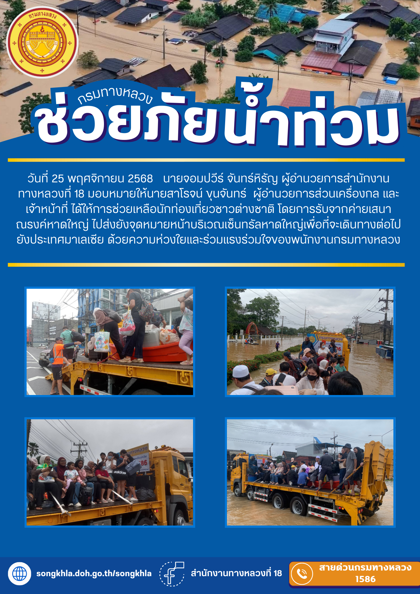 วันที่ 25 พฤศจิกายน 2568 นายจอมปวีร์ จันทร์หิรัญ ผู้อำนวยการสำนักงานทางหลวงที่ 18 มอบหมายให้นายสาโรจน์ ขุนจันทร์ ผู้อำนวยการส่วนเครื่องกล และเจ้าหน้าที่ ได้ให้การช่วยเหลือนักท่องเที่ยวชาวต่างชาติ โดยการรับจากค่ายเสนาณรงค์หาดใหญ่ ไปส่งยังจุดหมายหน้าบริเวณเซ็นทรัลหาดใหญ่เพื่อที่จะเดินทางต่อไปยังประเทศมาเลเซีย ด้วยความห่วงใยและร่วมแรงร่วมใจของพนักงานกรมทางหลวง