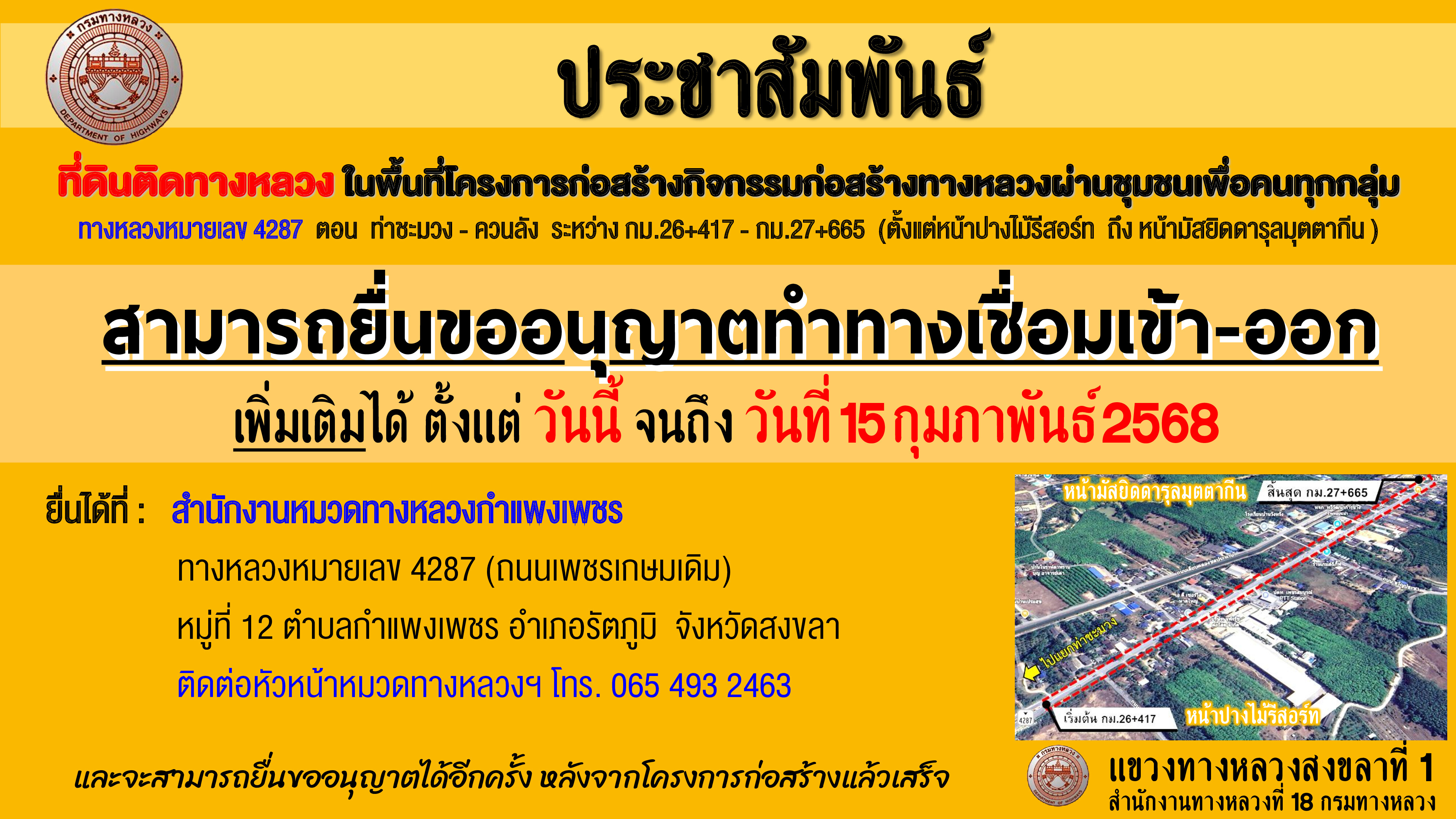 แจ้งประชาสัมพันธ์ให้ยื่นขออนุญาตทำทางเชื่อมเข้า-ออกที่ดิน ในพื้นที่โครงการก่อสร้างทางหลวง 4287 (ของปีงบประมาณ 2568)