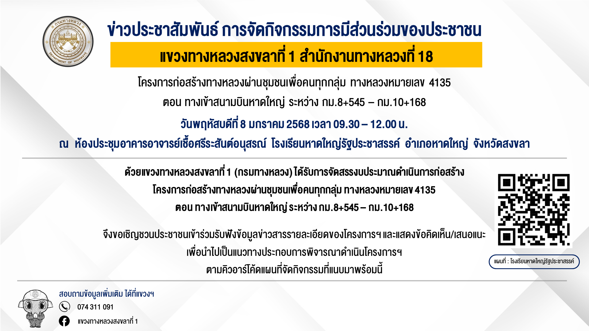 ขอเชิญเข้าร่วมประชุมเพื่อการมีส่วนร่วมของประชาชน กิจกรรมก่อสร้างทางหลวงผ่านชุมชนเพื่อคนทุกกลุ่ม ทางหลวงหมายเลข 4135 ตอน ทางเข้าสนามบินหาดใหญ่ ระหว่าง กม.8+545 - กม.10+168