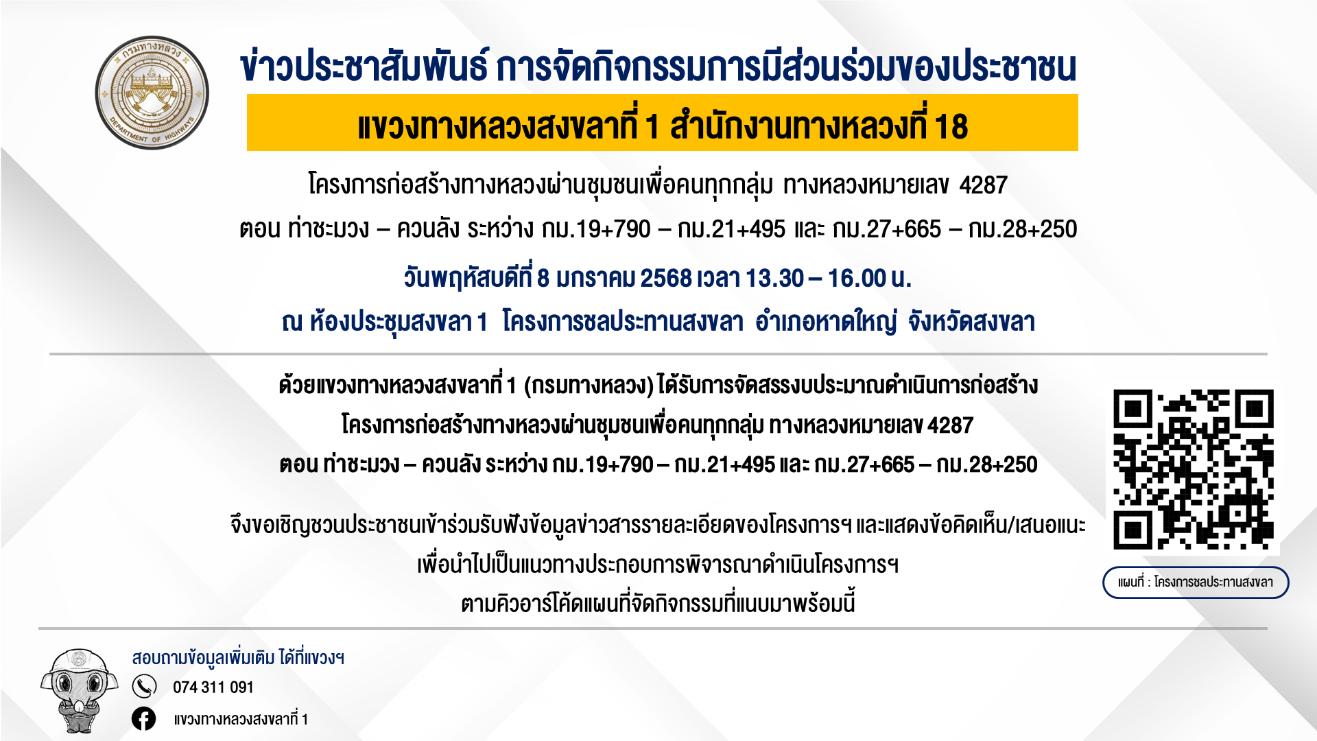 ขอเชิญเข้าร่วมประชุมเพื่อการมีส่วนร่วมของประชาชน กิจกรรมก่อสร้างทางหลวงผ่านชุมชนเพื่อคนทุกกลุ่ม ทางหลวงหมายเลข 4287 ตอน ท่าชะมวง - ควนลัง ระหว่าง กม.19+790 - กม.21+495 และ กม.27+665 - กม.28+250