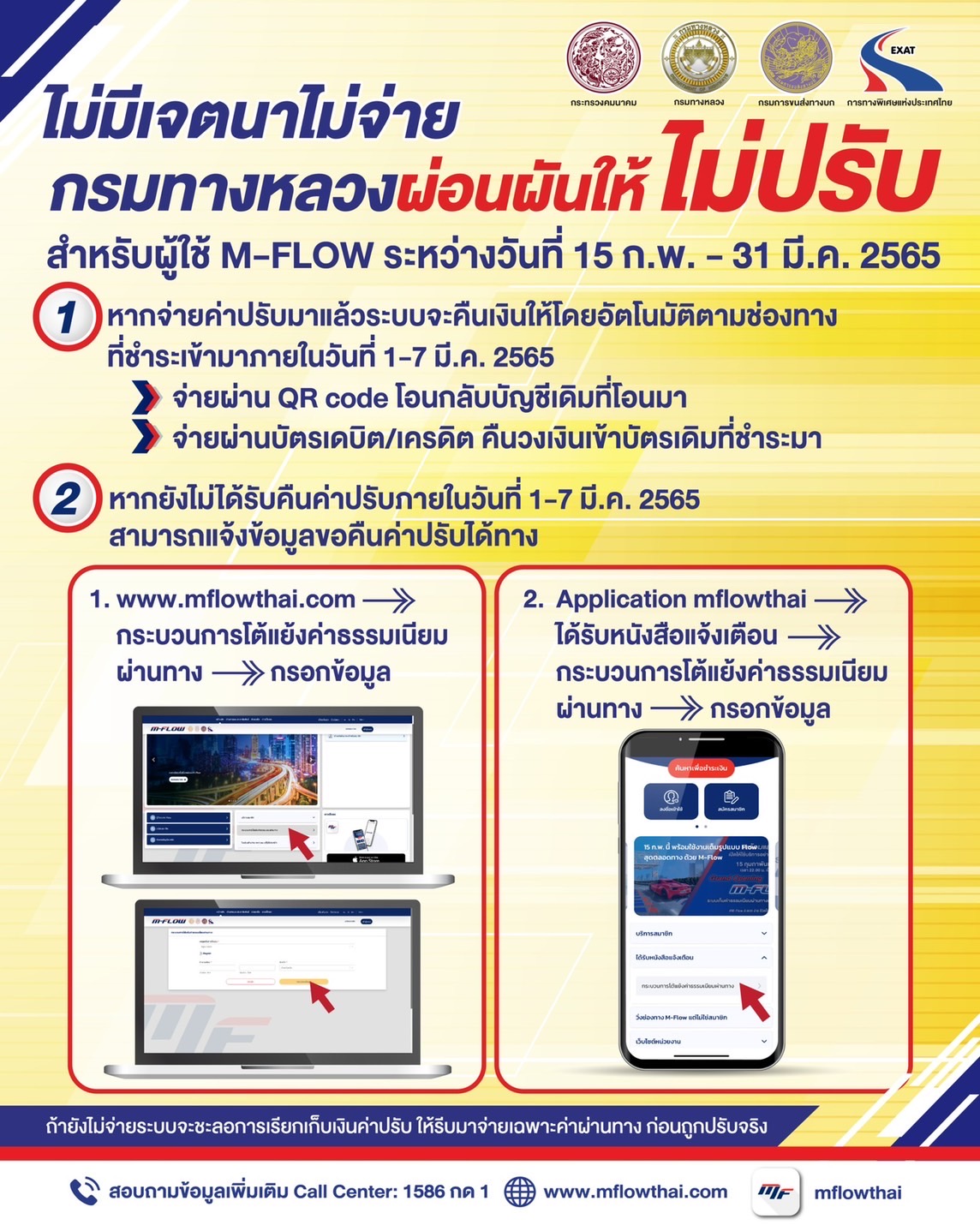 จะคืนวงเงินเข้าบัตรเดิมที่ชำระมา แต่หากผู้ใช้ทางยังไม่ได้รับคืนค่าปรับภายในเวลาที่กำหนด สามารถแจ้งข้อมูลขอคืนค่าปรับได้ 2 ช่องทางคือ www.mflowthai.com เลือกกระบวนการโต้แย้งค่าธรรมเนียมผ่านทาง หรือดำเนินการผ่าน Application mflowthai เลือกได้รับหนังสือแจ้งเตือน จากนั้นจึงเลือกกระบวนการโต้แย้งค่าธรรมเนียมผ่านทาง แล้วจึงกรอกข้อมูลของตนเอง รวมถึงช่องทางในการคืนเงินค่าปรับ เพื่อนำส่งเงินค่าปรับคืนให้อย่างถูกต้องรวดเร็ว ทั้งนี้ หากผู้ใช้ทางไม่สามารถระบุเวลาเดินทางได้อย่างชัดเจนให้ระบุเวลาประมาณการได้ ระบบจะตรวจสอบข้อมูลและดำเนินการต่อให้ทันที ผู้ใช้ทางมีข้อสงสัยหรือต้องการสอบถามข้อมูลเพิ่มเติมสามารถติดต่อได้ที่ Call Center 1586 กด 1 หรือทาง Line Official Account : @mflowthai และ facebook : mflowthailand