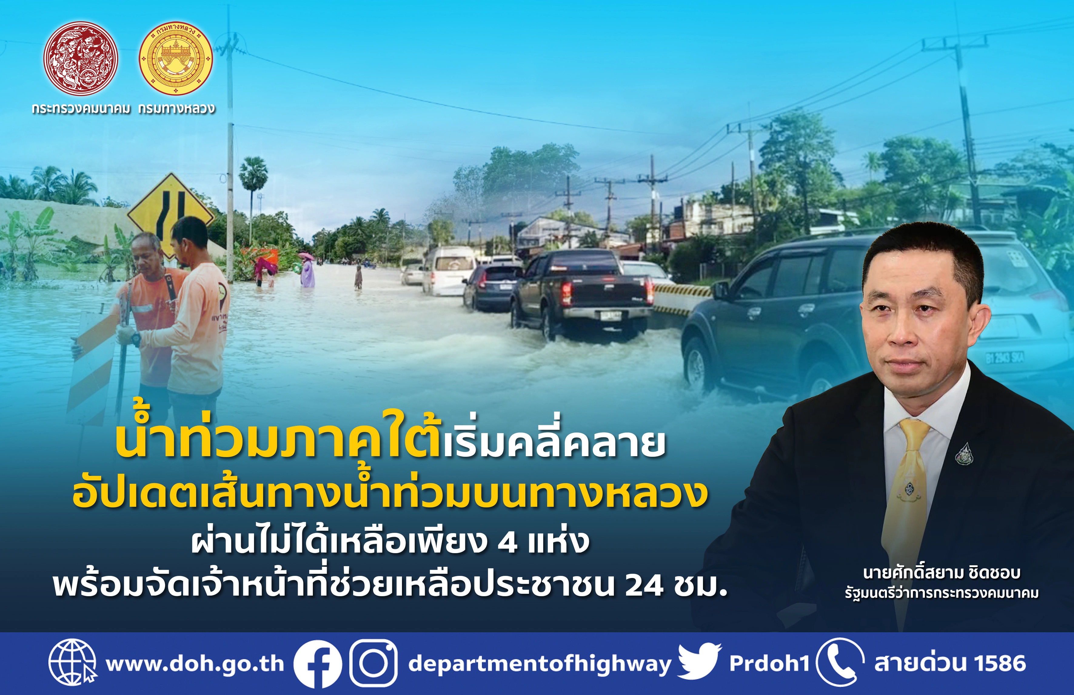 น้ำท่วมภาคใต้เริ่มคลี่คลาย อัปเดตเส้นทางน้ำท่วมบนทางหลวง ผ่านไม่ได้เหลือเพียง 4 แห่ง พร้อมจัดเจ้าหน้าที่ช่วยเหลือประชาชน 24 ชม.