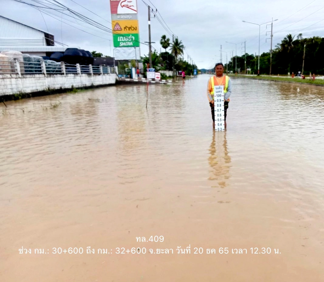 - ทางหลวงหมายเลข 409 ตอน ป่าพ้อ – ท่าสาป ในพื้นที่ อำเภอเมืองยะลา ช่วงที่ 30+600 – กม.32+600 ระดับน้ำ 30 - 40 ซม. ใช้ทางเลี่ยง ยล.3003 – ทล.409 (ท่าสาป – ลำใหม่)