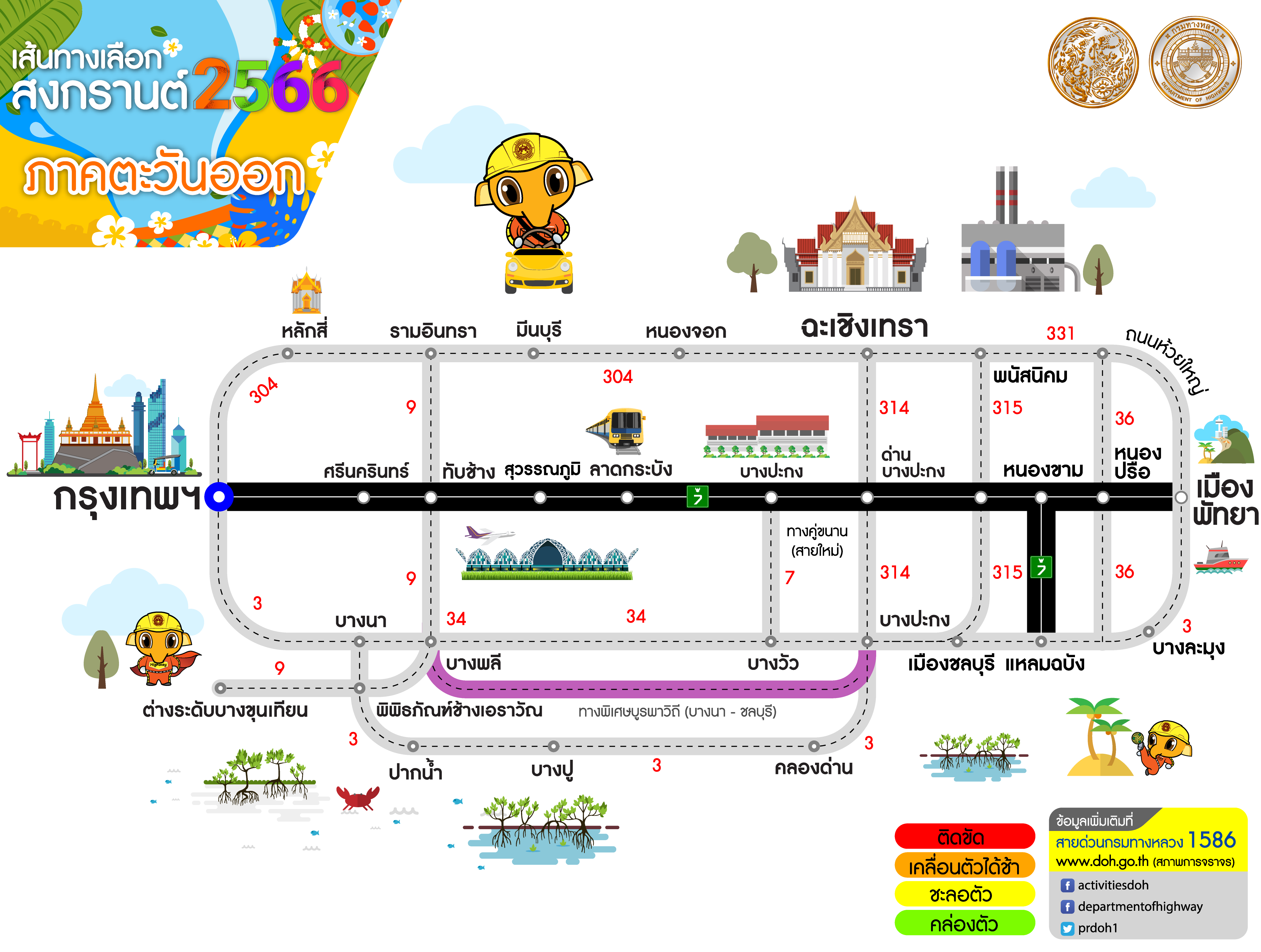 ทั้งนี้ กรมทางหลวงพร้อมดูแลด้านความสะดวกปลอดภัยการเดินทางของประชาชนอย่างเต็มที่ พร้อมขอความร่วมมือผู้ใช้ทางขับขี่ด้วยความระมัดระวัง ปฏิบัติตามกฎจราจร วางแผนการเดินทางล่วงหน้า เตรียมร่างกายให้พร้อม หากประชาชนต้องการสอบถามข้อมูลการเดินทางเพิ่มเติมหรือขอความช่วยเหลือระหว่างการเดินทางสามารถติดต่อได้ที่สายด่วนกรมทางหลวง 1586 สายด่วนมอเตอร์เวย์ 1586 กด 7 (โทรฟรีทุกเครือข่ายตลอด 24 ชั่วโมง) และตำรวจทางหลวง 1193