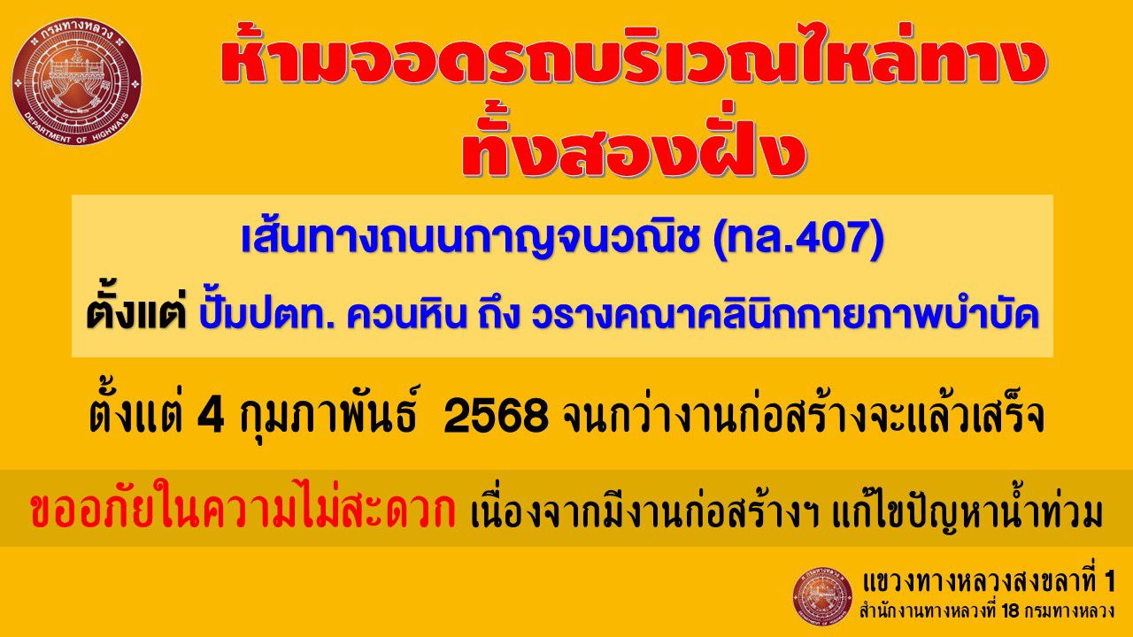 ทางหลวงหมายเลข 407 ตอนควบคุม 0102 ตอนควนหิน - เขารูปช้าง ระหว่าง กม.17+720 - กม.18+150 ตั้งแต่เดือนกุมภาพันธ์ 2568 จึงขอความร่วมมือ ห้ามจอกรถบริเวณไหล่ทาง ช่วงงานก่อสร้าง