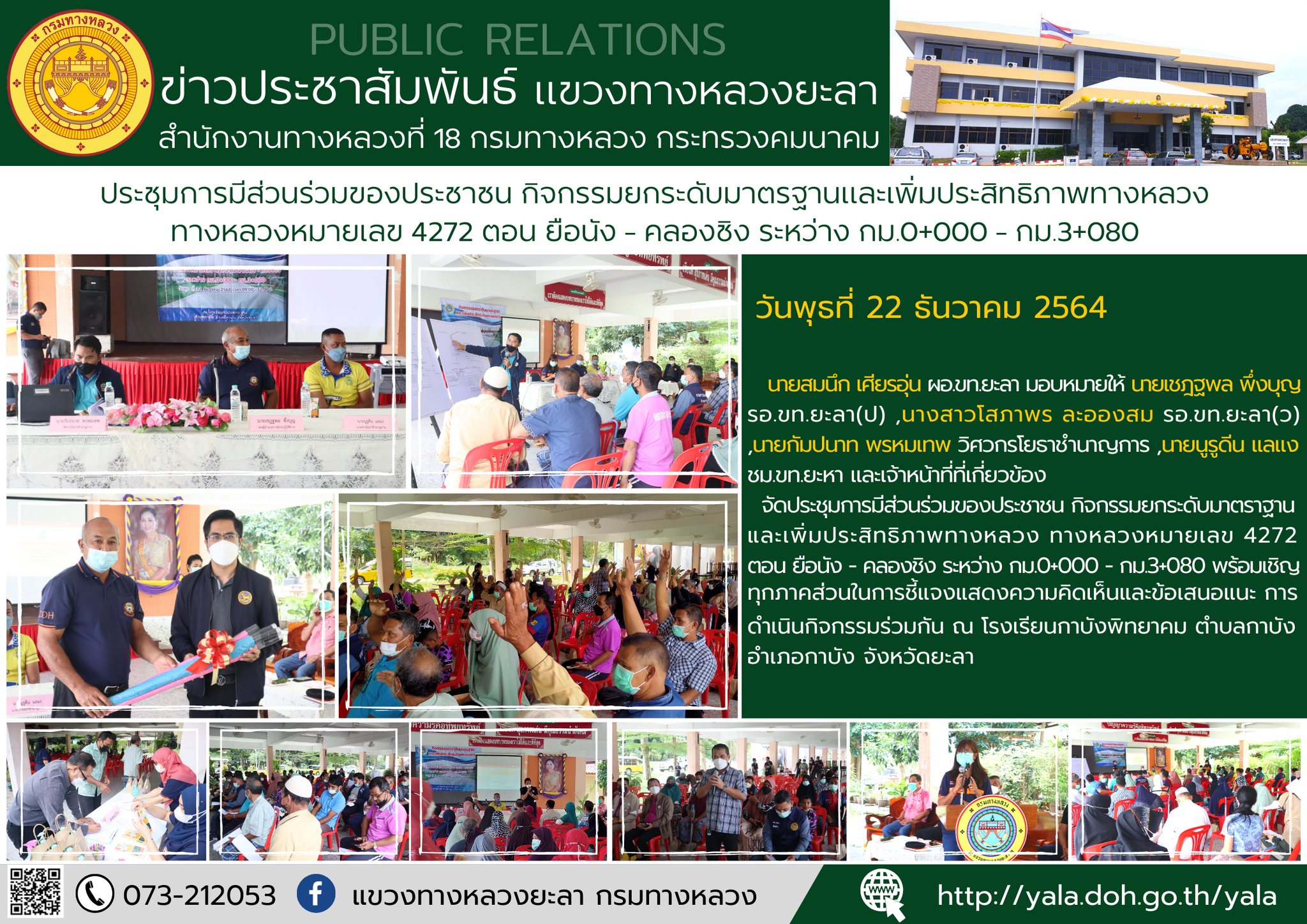 กิจกรรมการมีส่วนร่วมของประชาชน กิจกรรมก่อสร้างเพิ่มประสิทธิภาพทางหลวง ทางหลวงหมายเลข 4065 ตอน บ้านเนียง - ยะหา ระหว่าง กม.3+275 - กม.4+000